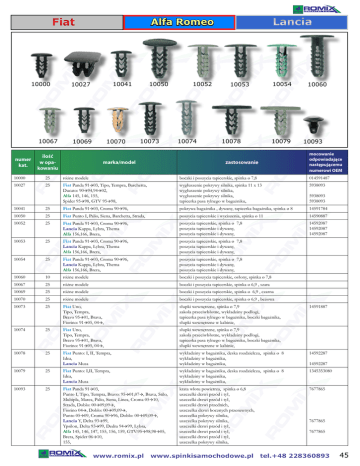 Fiat 10000 10067 numer kat. 10041 10027 10069 ilość w opakowaniu Lancia Alfa Romeo 10070 10050 10073 marka/model 10052 10074 10054 10053 10078 10079 10060 10093 mocowanie odpowiadające następującemu numerowi OEM zastosowanie 10000 25 różne modele boczki i poszycia tapicerskie, spinka ø 7,8 014591487 10027 25 Fiat Panda 91→03, Tipo, Tempra, Barchetta, Ducato: 90→94,94→02, Alfa 145, 146, 155, Spider 95→98, GTV 95→98, wygłuszenie pokrywy silnika, spinka 11 x 13 wygłuszenie pokrywy silnika, wygłuszenie pokrywy silnika, tapicerka pasa tylnego w bagażniku, 5938093 Fiat Panda 91→03, Croma 90→96, pokrywa bagażnika , dywany, tapicerka bagażnika, spinka ø 8 14591784 10041 25 5938093 5938093 10050 25 Fiat Punto I, Palio, Siena, Barchetta, Strada, poszycia tapicerskie i wyciszenia, spinka ø 11 14590887 10052 25 Fiat Panda 91→03, Croma 90→96, Lancia Kappa, Lybra, Thema Alfa 156,166, Brera, poszycia tapicerskie, spinka ø 7,8 poszycia tapicerskie i dywany, poszycia tapicerskie i dywany, 14592087 14592087 14592087 10053 25 Fiat Panda 91→03, Croma 90→96, Lancia Kappa, Lybra, Thema Alfa 156,166, Brera, poszycia tapicerskie, spinka ø 7,8 poszycia tapicerskie i dywany, poszycia tapicerskie i dywany, 10054 25 Fiat Panda 91→03, Croma 90→96, Lancia Kappa, Lybra, Thema Alfa 156,166, Brera, poszycia tapicerskie, spinka ø 7,8 poszycia tapicerskie i dywany, poszycia tapicerskie i dywany, 10060 10 różne modele boczki i poszycia tapicerskie, osłony, spinka ø 7,8 10067 25 różne modele boczki i poszycia tapicerskie, spinka ø 6,9 , szara 10069 25 różne modele boczki i poszycia tapicerskie, spinka ø 6,9 , czarna 10070 25 różne modele boczki i poszycia tapicerskie, spinka ø 6,9 , beżowa 10073 25 Fiat Uno, Tipo, Tempra, Bravo 95→01, Brava, Fiorino: 91→05, 04→, słupki wewnętrzne, spinka ø 7,9 zakola przeciwbłotne, wykładziny podłogi, tapicerka pasa tylnego w bagażniku, boczki bagażnika, słupki wewnętrzne w kabinie, 10074 25 Fiat Uno, Tipo, Tempra, Bravo 95→01, Brava, Fiorino: 91→05, 04→, słupki wewnętrzne, spinka ø 7,9 zakola przeciwbłotne, wykładziny podłogi, tapicerka pasa tylnego w bagażniku, boczki bagażnika, słupki wewnętrzne w kabinie, 10078 25 Fiat Punto: I, II, Tempra, Idea, Lancia Musa wykładziny w bagażniku, deska rozdzielcza, spinka ø 8 wykładziny w bagażniku, wykładziny w bagażniku, 14592287 14591887 14592287 10079 25 Fiat Punto: I,II, Tempra, Idea, Lancia Musa wykładziny w bagażniku, deska rozdzielcza, spinka ø 8 wykładziny w bagażniku, wykładziny w bagażniku, 1345353080 10093 25 Fiat Panda 91→03, Punto I, Tipo, Tempra, Bravo: 95→01,07→, Brava, Stilo, Multipla, Marea, Palio, Siena, Linea, Croma 05→10, Strada, Doblo: 00→09,09→, Fiorino 04→, Doblo: 00→09,09→, Punto 05→09, Croma 90→96, Doblo: 00→09,09→, Lancia Y, Delta 93→99, Ypsilon, Delta 93→99, Dedra 94→99, Lybra, Alfa 145, 146, 147, 155, 156, 159, GTV:95→98,98→05, Brera, Spider 06→10, 155, krata wlotu powietrza, spinka ø 6,8 uszczelki drzwi przód i tył, uszczelki drzwi przód i tył, uszczelki drzwi przednich, uszczelka drzwi bocznych przesuwnych, uszczelka pokrywy silnika, uszczelka pokrywy silnika, uszczelki drzwi przód i tył, uszczelki drzwi przód i tył, uszczelki drzwi przód i tył, uszczelka pokrywy silnika, 7677865 www.romix.pl www.spinkisamochodowe.pl 7677865 7677865 tel.+48 228360893 45 Fiat 10114 numer kat. 10131 10130 10148 Lancia Alfa Romeo 10159 ilość w opakowaniu 10134 10161 10136 10162 marka/model 10145 10146 10169 10147 10176 mocowanie odpowiadające następującemu numerowi OEM zastosowanie 10114 10 Fiat Panda 91→03, uszczelki i akcesoria różne , spinka ø 4,2 10130 25 różne modele, uszczelki i akcesoria różne , spinka ø 7,4 10131 10 różne modele, wyciszenie pokrywy silnika, spinka ø 6,5 10134 25 Fiat Uno, Fiorino 91→05, wyciszenie pokrywy silnika, spinka ø 9,4 7684263 10136 10 Fiat Punto: I,II FL, Tipo, Tempra, Bravo 95→01, Brava, Marea, Bravo 95→01, Brava, Lancia Y, Ypsilon, Delta 93→99, Delta 93→99, Dedra 94→99, Alfa 145, 146, 155, 156, 145, 146, wyciszenia w komorze silnika, spinka ø 16,2 wyciszenia w komorze silnika, listwy progowe zewnętrzne, wyciszenia w komorze silnika, listwy progowe zewnętrzne, listwy progowe zewnętrzne, wykładziny i dywany w kabinie, 7637466 4482612 7637466 7637466 10145 10 Fiat Punto I, Bravo 95→01, Brava, Marea, Strada 99→05, uszczelka pokrywy silnika i inne, spinka ø 7,5 7768047 10146 10 Fiat Cinquecento, Punto I, Bravo 95→01, Brava, Marea, Palio, Siena, Croma 90→96, Lancia Delta:86→92, 93→99, Dedra 94→99, Thema, Kappa, Lybra, Alfa 159, 166, Spider 98→06, GTV:95→98,98→05, Brera, wyciszenie pokrywy silnika, podsufitka, spinka ø 8,2 wyciszenie pokrywy silnika, wyciszenie pokrywy silnika, wyciszenie pokrywy silnika, wyciszenie pokrywy silnika, zakola przeciwbłotne, półka tylna, wyciszenie pokrywy silnika, dolne uszczelki drzwi, 7560860 7560860 7560860 10147 10 różne modele, wiele zastosowań, spinka ø 6,2 10148 10 Fiat Bravo 95→01, Brava, Marea, Multipla, Alfa 159, podszybie czołowe, spinka 9,8 x 8 listwa progowa zewnętrzna, pokrycie pasa tylnego w bagażniku, 46459200 10159 10 Fiat Bravo 95→01, Brava, wykładzina dywanowa bagażnika, spinka ø 7,9 718202808 46459200 10161 10 Fiat Brava, tapicerka klapy bagażnika, spinka ø 7,1 712113631 10162 10 Fiat Tipo, Bravo 95→01, Siena, Strada 99→05, Brava, Marea, Palio, Lancia Lybra, Alfa 145, 146, 166, nakładka zderzaka tylnego, spinka ø 19 nakładka zderzaka przedniego, nakładka zderzaka przedniego i tylnego, nakładka zderzaka tylnego, nakładka zderzaka przedniego, nakładka zderzaka przedniego i tylnego, nakładka zderzaka tylnego, 7788400 7788400 7788400 10169 10 Fiat Tipo wyciszenia w komorze silnika, spinka ø 9,3 82450771 10176 10 Fiat Punto: II,II FL, 05→09, EVO, Idea, Lancia Ypsilon, Musa, Alfa Mito, uszczelka szyby klapy bagażnika, spinka 