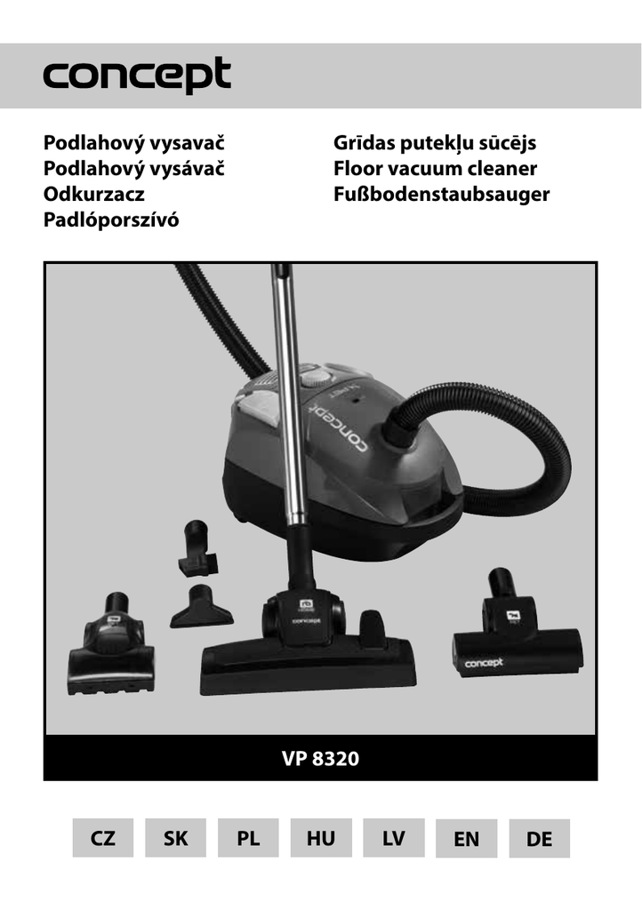 Podlahový vysavač Podlahový vysávač Odkurzacz Padlóporszívó Grīdas putekļu sūcējs Floor vacuum cleaner Fußbodenstaubsauger VP 8320 CZ SK PL HU LV EN DE CZ PODĚKOVÁNÍ Děkujeme Vám, že jste si zakoupili výrobek značky Concept a přejeme Vám, abyste byli spokojeni s naším výrobkem po celou dobu jeho používání. Před prvním použitím prostudujte pozorně celý návod k obsluze a potom si jej uschovejte. Zajistěte, aby i ostatní osoby, které budou s výrobkem manipulovat, byly seznámeny s tímto návodem. Technické parametry Napětí 220 – 240 V ~ 50/60 Hz Příkon 750 W Hladina akustického hluku < 79 dB (A) DŮLEŽITÁ BEZPEČNOSTNÍ UPOZORNĚNÍ • • • • • • • • • • • • • • • • • • • • • • • • Nepoužívejte spotřebič jinak, než je popsáno v tomto návodu. Před prvním použitím odstraňte ze spotřebiče všechny obaly a marketingové materiály. Ověřte, zda připojované napětí odpovídá hodnotám na typovém štítku spotřebiče. Nenechávejte spotřebič bez dozoru, pokud je zapnutý, popřípadě zapojený do zásuvky elektrického napětí. Odpojte spotřebič ze zásuvky elektrického napětí, není-li používán. Při vypojování spotřebiče ze zásuvky elektrického napětí nikdy netahejte za přívodní kabel, ale uchopte zástrčku a tahem ji vypojte. Nedovolte dětem a nesvéprávným osobám se spotřebičem manipulovat, používejte ho mimo jejich dosahu. Osoby se sníženou pohybovou schopností, se sníženým smyslovým vnímáním, s nedostatečnou duševní způsobilostí nebo osoby neseznámené s obsluhou musí používat spotřebič jen pod dozorem zodpovědné seznámené osoby. Dbejte zvýšené opatrnosti, pokud je spotřebič používán v blízkosti dětí. Nedovolte, aby byl spotřebič používán jako hračka. Nepoužívejte spotřebič ve venkovním prostředí nebo na mokrém povrchu, hrozí nebezpečí úrazu elektrickým proudem. Nepoužívejte jiné příslušenství, než je doporučeno výrobcem. Nepoužívejte spotřebič s poškozeným přívodním kabelem či zástrčkou, nechte závadu neprodleně odstranit autorizovaným servisním střediskem. Nepřejíždějte podlahovou hubicí ani spotřebičem přes přívodní kabel. Je-li spotřebič vybaven rotačním kartáčem, může se vyskytnout nebezpečí, pokud přejíždíte spotřebičem přes přívodní kabel. Netahejte a nepřenášejte spotřebič za přívodní kabel. Držte spotřebič stranou od zdrojů tepla, jako jsou radiátory, trouby a podobně. Chraňte jej před přímým slunečním zářením, vlhkostí. Nesahejte na spotřebič vlhkýma nebo mokrýma rukama. Nevkládejte žádné předměty do otvorů. Nepoužívejte spotřebič, je-li ucpán jakýkoli jeho otvor. Při odpojování spotřebiče ze zásuvky vypněte hlavní vypínač, poté vytáhněte zástrčku ze zásuvky elektrického napětí. Dbejte zvýšené opatrnosti při vysávání na schodech. Jestliže dojde k ucpání sacího otvoru spotřebiče, vypněte spotřebič a odstraňte nečistoty před dalším zapnutím. Při navíjení přívodního kabelu ho přidržujte, abyste zabránili jeho švihání okolo. Při nasazování příslušenství, během čištění nebo v případě poruchy vypněte spotřebič a vytáhněte zástrčku ze zásuvky elektrického napětí. VP 8320 3 CZ • Před použitím spotřebiče odviňte odpovídající délku přívodního kabelu. Žlutá značka na přívodním kabelu značí ideální délku kabelu. Neodvíjejte přívodní kabel za červenou značku. • Spotřebič je vhodný pouze pro použití v domácnosti, není určen pro komerční použití. • Nevysávejte nic hořícího, jako jsou cigarety, zápalky nebo horký popel. • Nepoužívejte spotřebič ve vlhkých místnostech, nevysávejte vlhké věci nebo kapaliny, hořlavé kapaliny (jako je benzin) a nepoužívejte spotřebič v prostorách, kde se tyto látky mohou vyskytovat. • Nikdy nevysávejte bez použití prachového sáčku a filtrů vysavače. Při každém použití spotřebiče se ujistěte, že jsou prachový sáček a filtry vysavače správně nasazeny. • Neponořujte přívodní kabel, zástrčku nebo spotřebič do vody ani do jiné kapaliny. • Pravidelně kontrolujte spotřebič i přívodní kabel z důvodu poškození. Nezapínejte poškozený spotřebič. • Před čištěním a po použití spotřebič vypněte, vypojte ze zásuvky elektrického napětí a nechte vychladnout. • Před vysáváním odstraňte z vysávaného povrchu velké či ostré předměty, které by mohly poškodit prachový sáček nebo některý filtr vysavače. • Nepoužívejte spotřebič se znečištěnými filtry. • Neopravujte spotřebič sami. Obraťte se na autorizovaný servis. Nedodržíte-li pokyny výrobce, nemůže být případná oprava uznána jako záruční. POPIS VÝROBKU 1. 2. 3. 4. 5. 6. 7. 8. 9. Držadlo hadice Teleskopická trubka Podlahová hubice Ohebná hadice Držadlo pro přenášení Tlačítko navíjení kabelu Tlačítko vypínače Indikátor plnosti prachové nádoby Filtr výstupu vzduchu 1 2 4 Příslušenství A. B. C. D. E. Turbokartáč malý Štěrbinová hubice s kartáčkem Hubice na čalouněni Turbokartáč velký 0,5m trubice E D A 5 B 8 C 3 7 4 6 9 VP 8320 CZ NÁVOD K OBSLUZE SESTAVOVÁNÍ VYSAVAČE UPOZORNĚNÍ: Vždy vytáhněte zástrčku ze zásuvky elektrického napětí před sestavováním nebo odnímáním příslušenství! 1. Připojení ohebné hadice k vysavači Vsuňte ohebnou hadici do otvoru sání vzduchu vysavače. Tlačte, dokud neuslyšíte cvaknutí - zapadnutí do správné polohy. Při vyjmutí ohebné hadice stiskněte obě tlačítka pojistky a vyjměte hadici (obr. 1). Síla sání může být ručně regulována na držadle hadice. Posuvný regulátor zavřený - silnější tah vzduchu. Posuvný regulátor otevřený - slabší tah vzduchu