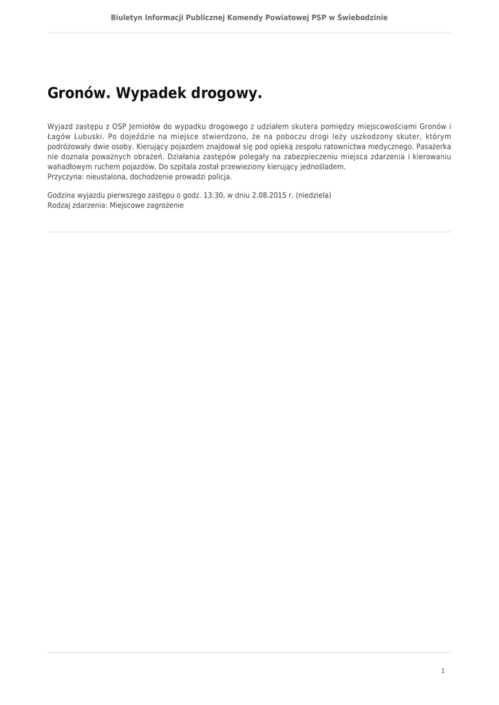 Biuletyn Informacji Publicznej Komendy Powiatowej PSP w Świebodzinie Gronów. Wypadek drogowy. Wyjazd zastępu z OSP Jemiołów do wypadku drogowego z udziałem skutera pomiędzy miejscowościami Gronów i Łagów Lubuski. Po dojeździe na miejsce stwierdzono, że na poboczu drogi leży uszkodzony skuter, którym podróżowały dwie osoby. Kierujący pojazdem znajdował się pod opieką zespołu ratownictwa medycznego. Pasażerka nie doznała poważnych obrażeń. Działania zastępów polegały na zabezpieczeniu miejsca zdarzenia i kierowaniu wahadłowym ruchem pojazdów. Do szpitala został przewieziony kierujący jednośladem. Przyczyna: nieustalona, dochodzenie prowadzi policja. Godzina wyjazdu pierwszego zastępu o godz. 13:30, w dniu 2.08.2015 r. (niedziela) Rodzaj zdarzenia: Miejscowe zagrożenie 1