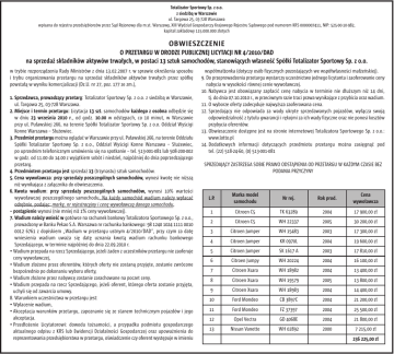 Totalizator Sportowy Sp. z o.o. z siedzibą w Warszawie ul. Targowa 25, 03-728 Warszawa wpisana do rejestru przedsiębiorców przez Sąd Rejonowy dla m.st. Warszawy, XIII Wydział Gospodarczy Krajowego Rejestru Sądowego pod numerem KRS 0000007411, NIP: 525-00-10-982, kapitał zakładowy 115.000.000 złotych OB WIESZ CZE NIE O PRZETARGU W DRODZE PUBLICZNEJ LICYTACJI NR 4/2010/DAD na sprzedaż składników aktywów trwałych, w postaci 13 sztuk samochodów, stanowiących własność Spółki Totalizator Sportowy Sp. z o.o. w trybie rozporządzenia Rady Ministrów z dnia 13.02.2007 r. w sprawie określenia sposobu i trybu organizowania przetargu na sprzedaż składników aktywów trwałych przez spółkę powstałą w wyniku komercjalizacji (Dz.U. nr 27, poz. 177 ze zm.), 1. Sprzedawca, prowadzący przetarg: Totalizator Sportowy Sp. z o.o. z siedzibą w Warszawie, ul. Targowa 25, 03-728 Warszawa. 2. Miejsce i termin przetargu: Licytacja 13 szt. samochodów każdego z osobna odbędzie się w dniu 23 września 2010 r., od godz. 10.00 w odstępach, co 10 minut, w Warszawie przy ul. Puławskiej 266, na terenie Spółki Totalizator Sportowy Sp. z o.o. Oddział Wyścigi Konne Warszawa – Służewiec. 3. Przedmiot przetargu można oglądać w Warszawie przy ul. Puławskiej 266, na terenie Oddziału Spółki Totalizator Sportowy Sp. z o.o., Oddział Wyścigi Konne Warszawa – Służewiec, po uprzednim telefonicznym umówieniu się na spotkanie – tel. 513-001-081 lub 508-200-002 w godz. od 11.00 do 14.00 z wyjątkiem sobót i niedziel, najpóźniej do dnia poprzedzającego przetarg. 4. Przedmiotem przetargu jest sprzedaż 13 (trzynastu) sztuk samochodów. 5. Cena wywoławcza: przy sprzedaży poszczególnych samochodów, wynosi kwotę nie niższą niż wynikająca z załącznika do obwieszczenia. 6. Kwota wadium: przy sprzedaży poszczególnych samochodów, wynosi 10% wartości wywoławczej poszczególnego samochodu. Na każdy samochód wadium należy wpłacać odrębnie, podając: markę, nr rejestracyjny i cenę wywoławczą danego samochodu. – postąpienie wynosi (nie mniej niż 1% ceny wywoławczej). 7. Wadium należy wnieść w gotówce na rachunek bankowy Totalizatora Sportowego Sp. z o.o., prowadzony w Banku Pekao S.A. Warszawa nr rachunku bankowego: 98 1240 1024 1111 0010 0012 6761 z dopiskiem „Wadium w przetargu ustnym 4/2010/DAD”, przy czym za datę wniesienia wadium uważa się datę uznania kwotą wadium rachunku bankowego Sprzedającego, w terminie najpóźniej do dnia 22.09.2010 r. • Wadium przepada na rzecz Sprzedającego, jeżeli żaden z uczestników przetargu nie zaoferuje ceny wywoławczej, • Wadium złożone przez oferentów, których oferty nie zostaną przyjęte, zostanie zwrócone bezpośrednio po dokonaniu wyboru oferty, • Wadium złożone przez nabywcę zostanie zarachowane na poczet ceny. • Wadium przepada na rzecz Sprzedającego, jeżeli oferent, którego oferta zostanie przyjęta, uchyli się od zawarcia umowy. 8. Warunkiem uczestnictwa w przetargu jest: • Wpłacenie wadium, • Akceptacja warunków przetargu, zapoznanie się ze stanem technicznym pojazdów i jego akceptacja. • Przedłożenie Licytatorowi: dowodu tożsamości, a przypadku podmiotu gospodarczego aktualnego odpisu z KRS lub Ewidencji Działalności Gospodarczej oraz upoważnienia do reprezentowania przedsiębiorstwa w przetargu, oświadczenie czy oferent występuje w imieniu współmałżonka (dotyczy osób fizycznych pozostających we współwłasności małżeńskiej). 9. Do przeprowadzenia przetargu wystarczy uczestnictwo jednego licytanta i zaoferowanie ceny nabycia w wysokości równej cenie wywoławczej. 10. Nabywca jest obowiązany zapłacić cenę nabycia w terminie nie dłuższym niż 14 dni, tj. do dnia 07.10.2010 r., w przeciwnym razie traci prawa wynikające z przybicia oraz wadium. 11. O wyborze oferty zadecyduje najwyższa zaoferowana cena. 12. Sprzedający nie odpowiada za wady ukryte sprzedawanych pojazdów, wyłącza swoją odpowiedzialność z tytułu gwarancji i rękojmi za ich wady fizyczne oraz nie ponosi kosztów przybycia oferentów. 13. Obwieszczenie dostępne jest na stronie internetowej Totalizatora Sportowego Sp. z o.o.: www.lotto.pl 14. Dodatkowych informacji dotyczących przedmiotu przetargu można zasięgnąć pod tel. (22) 518-24-60, (0) 513-001-081 SPRZEDAJĄCY ZASTRZEGA SOBIE PRAWO ODSTĄPIENIA OD PRZETARGU W KAŻDYM CZASIE BEZ PODANIA PRZYCZYNY L.P. Marka model samochodu Nr rej. Rok prod. Cena wywoławcza 1 Citroen C5 TK 63289 2004 17 900,00 zł 2 Citroen C5 WH 22337 2005 30 200,00 zł 3 Citroen Jumper WH 15483 2003 17 300,00 zł 4 Citroen Jumper KR 0970L 2004 19 600,00 zł 5 Citroen Jumper SK 1617 A 2003 17 810,00 zł 6 Citroen Jumpy WH 20224 2004 16 100,00 zł 7 Citroen Xsara WH 18982 2004 13 400,00 zł 8 Citroen Xsara WH 19579 2005 13 800,00 zł 9 Citroen Xsara WH 18983 2004 14 400,00 zł 10 Ford Mondeo CB 3897C 2004 21 200,00 zł 11 Ford Mondeo FZ 37397 2004 25 500,00 zł 12 Opel Vectra GD 4068E 2004 21 800,00 zł 13 Nissan Vanette WH 02892 2000 7 215,00 zł 236 225,00 zł