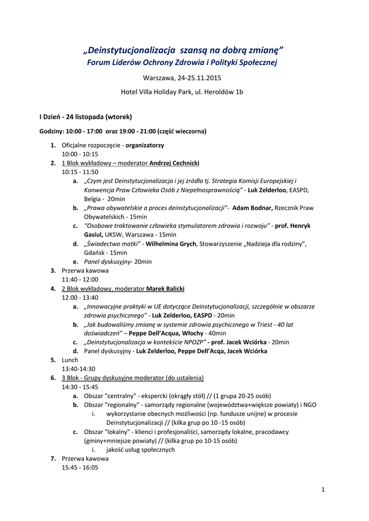 „Deinstytucjonalizacja szansą na dobrą zmianę” Forum Liderów Ochrony Zdrowia i Polityki Społecznej Warszawa, 24-25.11.2015 Hotel Villa Holiday Park, ul. Heroldów 1b I Dzień - 24 listopada (wtorek) Godziny: 10:00 - 17:00 oraz 19:00 - 21:00 (część wieczorna) 1. Oficjalne rozpoczęcie - organizatorzy 10:00 - 10:15 2. 1 Blok wykładowy – moderator Andrzej Cechnicki 10:15 - 11:50 a. „Czym jest Deinstytucjonalizacja i jej żródła tj. Strategia Komisji Europejskiej i Konwencja Praw Człowieka Osób z Niepełnosprawnością” - Luk Zelderloo, EASPD, Belgia - 20min b. „Prawa obywatelskie a proces deinstytucjonalizacji”- Adam Bodnar, Rzecznik Praw Obywatelskich - 15min c. “Osobowe traktowanie człowieka stymulatorem zdrowia i rozwoju” - prof. Henryk Gasiul, UKSW, Warszawa - 15min d. „Świadectwo matki” - Wilhelmina Grych, Stowarzyszenie „Nadzieja dla rodziny”, Gdańsk - 15min e. Panel dyskusyjny- 20min 3. Przerwa kawowa 11:40 - 12:00 4. 2 Blok wykładowy, moderator Marek Balicki 12.00 - 13:40 a. „Innowacyjne praktyki w UE dotyczące Deinstytucjonalizacji, szczególnie w obszarze zdrowia psychicznego” - Luk Zelderloo, EASPD - 20min b. „Jak budowaliśmy zmianę w systemie zdrowia psychicznego w Triest - 40 lat doświadczeń” – Peppe Dell’Acqua, Włochy - 40min c. „Deinstytucjonalizacja w kontekście NPOZP” - prof. Jacek Wciórka - 20min d. Panel dyskusyjny - Luk Zelderloo, Peppe Dell’Acqa, Jacek Wciórka 5. Lunch 13:40-14:30 6. 3 Blok - Grupy dyskusyjne moderator (do ustalenia) 14:30 - 15:45 a. Obszar "centralny" - ekspercki (okrągły stół) // (1 grupa 20-25 osób) b. Obszar "regionalny" - samorządy regionalne (województwa+większe powiaty) i NGO i. wykorzystanie obecnych możliwości (np. fundusze unijne) w procesie Deinstytucjonalizacji // (kilka grup po 10 -15 osób) c. Obszar "lokalny" - klienci i profesjonaliści, samorządy lokalne, pracodawcy (gminy+mniejsze powiaty) // (kilka grup po 10-15 osób) i. jakość usług społecznych 7. Przerwa kawowa 15:45 - 16:05 1 8. Grupy dyskusyjne - podsumowanie na forum (po 1 osobie z każdej grupy) 16:05 - 16:30 9. „Co posłowie myślą o NPOZP – prezentacja wyników ankiety” - 10min 16:30 - 16:40 10. Panel dyskusyjny - dr Andrzej Cechnicki, Peppe Dell’Acqua, Luk Zelderloo, prof. Jacek Wciórka, Marek Balicki, Regina Bisikiewicz - 20 min 16:40 - 17:00 11. Podsumowanie pierwszego dnia 17.00 – 17.15 12. Wspólna kolacja uczestników konferencji (w hotelu) 19.00 – 21.00 ---------------------------------------------------------------------------------------------------------------------------------------- II Dzień - 25 listopada (środa) Godziny 9:00 - 15:00 9:00 – 9:20 Wprowadzenie do drugiego dnia konferencji – inspiracje z dnia pierwszego 9:20 – 10:20 Polskie dobre praktyki i wyzwania w zakresie Deinstytucjonalizacji: - „Perspektywa dużego szpitala psychiatrycznego” - Stanisław Kracik, Kraków - „Jak pracujemy w podejściu Otwartego Dialogu” - Izabella Ciuńczyk, Koszalin - „Doświadczenia Sekcji Psychiatrii Środowiskowej” - Artur Kochański, Lublin 10:20 – 10:50 – „Proces zdrowienia i nowi eksperci - widziane oczami klienta systemu i rodziny” – wywiad, prowadzi prof. Jacek Wciórka 10:50 – 11:10 Przerwa kawowa 11:10 – 11:30 „Źródła finansowania transformacji polskiego systemu” – Luk Zelderloo, EASPD 11:30 - 11:50 „Rola liderów w zarządzaniu zmianą” - Regina Bisikiewicz, LMI, Wrocław 11:50 – 13:05 „Praca w grupach: „Jak wykorzystać u siebie europejskie i polskie dobre praktyki czyli Deinstytucjonalizacja z różnych perspektyw” (klienci i rodziny, profesjonaliści, pracodawcy, samorząd). 13:05 - 13:50 Lunch 13:50 – 14:20 Podsumowanie pracy w grupach i dyskusja 14:20 – 15:00 „Jak możemy pomóc polskim liderom w zmianie systemowej?” - Peppe Del’Acqua, Luk Zelderloo 15.00 Zakończenie konferencji 2