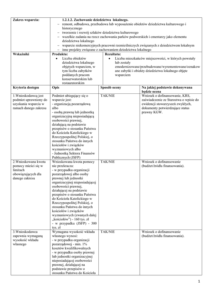 Zakres wsparcia: Wskaźniki Kryteria dostępu 1.Wnioskodawcą jest podmiot uprawniony do uzyskania wsparcia w ramach danego zakresu 2.Wnioskowana kwota pomocy mieści się w limitach obowiązujących dla danego zakresu 3.Wnioskodawca zapewnia wymaganą wysokość wkładu własnego 1.2.1.2. Zachowanie dziedzictwa lokalnego. remont, odbudowa, przebudowa lub wyposażenie obiektów dziedzictwa kulturowego i historycznego tworzenie i rozwój szlaków dziedzictwa kulturowego wszelkie zadania na rzecz zachowania parków podworskich i cmentarzy jako elementu dziedzictwa lokalnego wsparcie niekomercyjnych pracowni rzemieślniczych związanych z dziedzictwem lokalnym inne projekty związane z zachowaniem dziedzictwa lokalnego Produktu: Rezultatu: Liczba obiektów Liczba mieszkańców miejscowości, w których powstały dziedzictwa lokalnego lub zostały objętych wsparciem, w zmodernizowane/przebudowane/wyremontowane/oznakow tym liczba zabytków ane zabytki i obiekty dziedzictwa lokalnego objęte poddanych pracom wsparciem konserwatorskim lub restauratorskim Opis Sposób oceny Na jakiej podstawie dokonywana będzie ocena Podmiot ubiegający się o TAK/NIE Wniosek o dofinansowanie, KRS, wsparcie jest: zaświadczenie ze Starostwa o wpisie do - organizacją pozarządową ewidencji stowarzyszeń zwykłych, albo dokumenty potwierdzające status - osobą prawną lub jednostką prawny KGW. organizacyjną nieposiadającą osobowości prawnej, działającą na podstawie przepisów o stosunku Państwa do Kościoła Katolickiego w Rzeczypospolitej Polskiej, o stosunku Państwa do innych kościołów i związków wyznaniowych albo - Jednostką Sektora Finansów Publicznych (JSFP) Wnioskowana kwota pomocy TAK/NIE Wniosek o dofinansowanie nie przekracza: (budżet/źródła finansowania). - w przypadku organizacji pozarządowej albo osoby prawnej lub jednostki organizacyjnej nieposiadającej osobowości prawnej, działającej na podstawie przepisów o stosunku Państwa do Kościoła Katolickiego w Rzeczypospolitej Polskiej, o stosunku Państwa do innych kościołów i związków wyznaniowych (zwanych dalej „kościołów”) - 160 tys. zł - w przypadku (JSFP) - 300 tys. zł Wymagana wysokość wkładu TAK/NIE Wniosek o dofinansowanie własnego wynosi: (budżet/źródła finansowania). - w przypadku organizacji pozarządowej - min. 1% kosztów kwalifikowalnych - w przypadku osoby prawnej lub jednostki organizacyjnej nieposiadającej osobowości prawnej, działającej na podstawie przepisów o stosunku Państwa do Kościoła 1 4.Operacja jest zgodna z zakresem wsparcia w ramach danego naboru 5.Realizacja operacji przyczyni się do realizacji celów ogólnych i szczegółowych LSR, przez osiąganie zaplanowanych dla danego zakresu wsparcia wskaźników Kryteria wyboru 1. Uzasadnienie potrzeby realizacji projektu Katolickiego w Rzeczypospolitej Polskiej, o stosunku Państwa do innych kościołów i związków wyznaniowych – min. 10% kosztów kwalifikowalnych - w przypadku (JSFP) 36,37% kosztów kwalifikowalnych. Operacja jest zgodna z co najmniej jednym punktem ww. zakresu wsparcia. Operacja pozwoli na osiągnięcie zarówno ww wskaźnika produktu, jak i wskaźnika rezultatu. TAK/NIE Wniosek o dofinansowanie (opis projektu we wniosku). TAK/NIE Wniosek o dofinansowanie (opis projektu we wniosku). Opis Sposób oceny a. Czy przeprowadzono uspołecznioną diagnozę potrzeb i opisano najważniejsze jej wyniki? b. Czy projekt odpowiada na zdiagnozowany/e problem/y? a. 0-5 pkt, w tym: - diagnoza została opisana we wniosku – 1 pkt. - przedstawiono wyniki diagnozy – 2 pkt. - przedstawiono dokumenty potwierdzające, że diagnoza została wykonana w sposób uspołeczniony – 2 pkt. Punkty sumują się. Na jakiej podstawie dokonywana będzie ocena Opis diagnozy we wniosku, dokumenty załączone do wniosku, w tym: listy obecności ze spotkań z mieszkańcami, listy poparcia, ankiety, raport z uspołecznionej diagnozy. b. 0 lub 5 pkt, w tym: - punkty przyznaje się jeżeli projekt odnosi się bezpośrednio do problemów wynikających z diagnozy. 2. Preferowany wnioskodawca Wnioskodawcą jest organizacja pozarządową 3. Preferowane typy projektów a. Projekt polega na remoncie, odbudowie, przebudowie obiektu/ów wpisanych do gminnej ewidencji zabytków b. Projekt polega na remoncie, odbudowie, przebudowie obiektu/ów wpisanych do rejestru zabytków WKZ. a. Stopień adekwatności zakresu projektu do zaplanowanych kosztów b. Wysokość wkładu własnego wnioskodawcy jest wyższa niż wymagana w ramach danego 4. Racjonalność budżetu i plan finansowy projektu Punkty a i b sumują się. 0 lub 15 pkt a. 0 lub 3 pkt b. 0 lub 5 pkt Punkty nie sumują się a. 0-5 pkt, - jeżeli koszty bezpośrednio związane z celami projektu stanowią co najmniej 70% i nie więcej niż 85% kosztów Wniosek o dofinansowanie, KRS (ewidencja stowarzyszeń zwykłych – po wejściu w życie nowelizacji prawo o stowarzyszeniach). Dokumenty potwierdzające wpis obiektu/ów do gminnej ewidencji zabytków i/lub do rejestru zabytków WKZ. Opis projektu we wniosku (w tym budżet projektu i źródła finansowania); 2 konkursu kwalifikowanych projektu - 3 pkt - jeżeli koszty bezpośrednio związane z celami projektu stanowią więcej niż 85% kosztów kwalifikowanych projektu – 5 pkt Punkty nie sumują się. b. 0-5 pkt, w tym: • w przypadku NGO: - jeśli wysokość wkładu własnego wynosi od 2 do 3% - 3 pkt. - wysokość wkładu własnego wynosi powyżej 3% - 5 pkt. Punkty nie sumują się. • w przypadku „kościołów”: - jeśli wysokość wkładu własnego wynosi od powyżej 15% ale nie więcej niż 20% - 3 pkt. - jeśli wysokość wkładu własnego wynosi od powyżej 20% - 5 pkt. Punkty nie sumują się. • w przypadku JSFP – punkty przyznaje się jeżeli wkład własny wynosi 36,37% 5. Trwałość rezultatów a. Wpływ projektu na trwałe rozwiązanie problemów b. Zabezpieczenie trwałości projektu przy udziale społeczności lokaln
