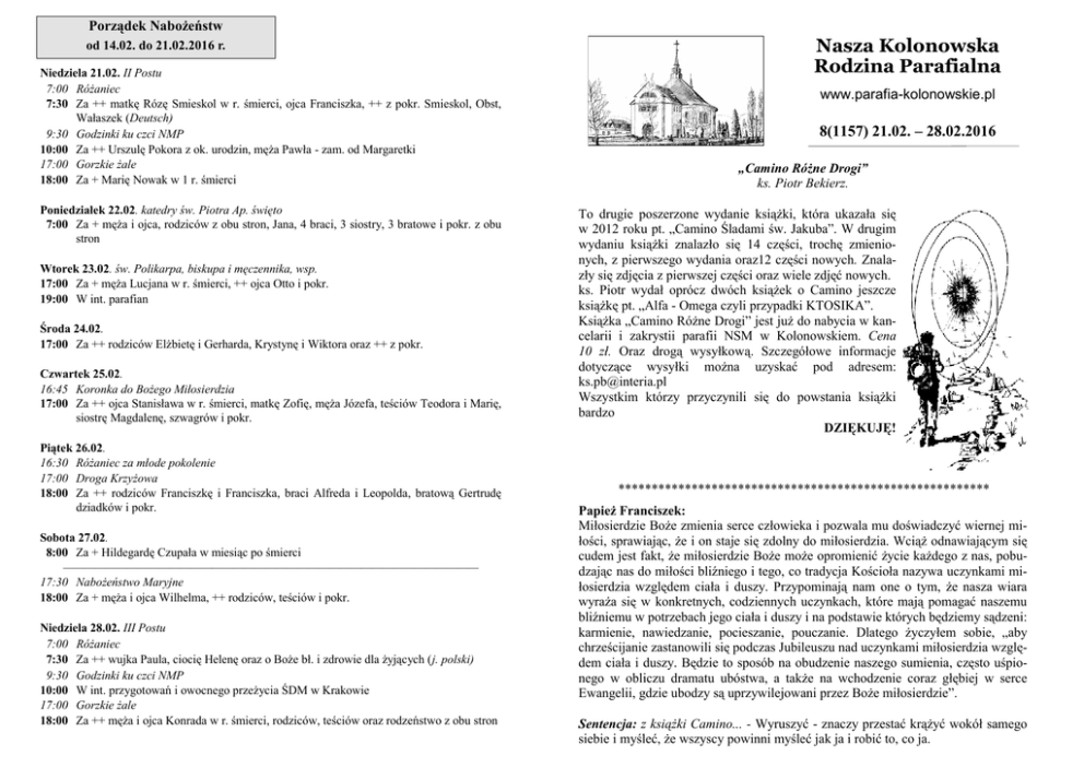 Porządek Nabożeństw od 14.02. do 21.02.2016 r. Niedziela 21.02. II Postu 7:00 Różaniec 7:30 Za ++ matkę Rózę Smieskol w r. śmierci, ojca Franciszka, ++ z pokr. Smieskol, Obst, Wałaszek (Deutsch) 9:30 Godzinki ku czci NMP 10:00 Za ++ Urszulę Pokora z ok. urodzin, męża Pawła - zam. od Margaretki 17:00 Gorzkie żale 18:00 Za + Marię Nowak w 1 r. śmierci Poniedziałek 22.02. katedry św. Piotra Ap. święto 7:00 Za + męża i ojca, rodziców z obu stron, Jana, 4 braci, 3 siostry, 3 bratowe i pokr. z obu stron Wtorek 23.02. św. Polikarpa, biskupa i męczennika, wsp. 17:00 Za + męża Lucjana w r. śmierci, ++ ojca Otto i pokr. 19:00 W int. parafian Środa 24.02. 17:00 Za ++ rodziców Elżbietę i Gerharda, Krystynę i Wiktora oraz ++ z pokr. Czwartek 25.02. 16:45 Koronka do Bożego Miłosierdzia 17:00 Za ++ ojca Stanisława w r. śmierci, matkę Zofię, męża Józefa, teściów Teodora i Marię, siostrę Magdalenę, szwagrów i pokr. Piątek 26.02. 16:30 Różaniec za młode pokolenie 17:00 Droga Krzyżowa 18:00 Za ++ rodziców Franciszkę i Franciszka, braci Alfreda i Leopolda, bratową Gertrudę dziadków i pokr. Sobota 27.02. 8:00 Za + Hildegardę Czupała w miesiąc po śmierci ——————————————————————————————————————— 17:30 Nabożeństwo Maryjne 18:00 Za + męża i ojca Wilhelma, ++ rodziców, teściów i pokr. Niedziela 28.02. III Postu 7:00 Różaniec 7:30 Za ++ wujka Paula, ciocię Helenę oraz o Boże bł. i zdrowie dla żyjących (j. polski) 9:30 Godzinki ku czci NMP 10:00 W int. przygotowań i owocnego przeżycia ŚDM w Krakowie 17:00 Gorzkie żale 18:00 Za ++ męża i ojca Konrada w r. śmierci, rodziców, teściów oraz rodzeństwo z obu stron Nasza Kolonowska Rodzina Parafialna www.parafia-kolonowskie.pl 8(1157) 21.02. – 28.02.2016 „Camino Różne Drogi” ks. Piotr Bekierz. To drugie poszerzone wydanie książki, która ukazała się w 2012 roku pt. „Camino Śladami św. Jakuba”. W drugim wydaniu książki znalazło się 14 części, trochę zmienionych, z pierwszego wydania oraz12 części nowych. Znalazły się zdjęcia z pierwszej części oraz wiele zdjęć nowych. ks. Piotr wydał oprócz dwóch książek o Camino jeszcze książkę pt. „Alfa - Omega czyli przypadki KTOSIKA”. Książka „Camino Różne Drogi” jest już do nabycia w kancelarii i zakrystii parafii NSM w Kolonowskiem. Cena 10 zł. Oraz drogą wysyłkową. Szczegółowe informacje dotyczące wysyłki można uzyskać pod adresem: [email protected] Wszystkim którzy przyczynili się do powstania książki bardzo DZIĘKUJĘ! ******************************************************** Papież Franciszek: Miłosierdzie Boże zmienia serce człowieka i pozwala mu doświadczyć wiernej miłości, sprawiając, że i on staje się zdolny do miłosierdzia. Wciąż odnawiającym się cudem jest fakt, że miłosierdzie Boże może opromienić życie każdego z nas, pobudzając nas do miłości bliźniego i tego, co tradycja Kościoła nazywa uczynkami miłosierdzia względem ciała i duszy. Przypominają nam one o tym, że nasza wiara wyraża się w konkretnych, codziennych uczynkach, które mają pomagać naszemu bliźniemu w potrzebach jego ciała i duszy i na podstawie których będziemy sądzeni: karmienie, nawiedzanie, pocieszanie, pouczanie. Dlatego życzyłem sobie, „aby chrześcijanie zastanowili się podczas Jubileuszu nad uczynkami miłosierdzia względem ciała i duszy. Będzie to sposób na obudzenie naszego sumienia, często uśpionego w obliczu dramatu ubóstwa, a także na wchodzenie coraz głębiej w serce Ewangelii, gdzie ubodzy są uprzywilejowani przez Boże miłosierdzie”. Sentencja: z książki Camino... - Wyruszyć - znaczy przestać krążyć wokół samego siebie i myśleć, że wszyscy powinni myśleć jak ja i robić to, co ja. 8/2016 Tytuły filmów, które można wypożyczać w kancelarii w godzinach urzędowania: 1. 2. 3. 4. 5. 6. Droga życia Dzika droga Historia św. Antoniego Ludzie Boga Passion Karol papież , który pozostał człowiekiem 7. Skazani na Shawshenk 8. Rasmus i włóczęga 9. 20.000 mil podmorskiej żeglugi 10. List w butelce 11. Życie jest piękne 12. Ja Jestem 13. Brat przyjaciel papieża 14. Matka 24 h. 15. Jak powstało Pismo św. 16. Józef z Nazaretu 17. Apokalipsa św. Jana 18. Historia św. Franciszka 19. Faustyna 20. Historia ukryta w czekoladzie 21. Przed sklepem jubilera 22. Brat naszego Boga 23. Ojciec miłosierdzia 24. Jezus 25. Fatima 26. św. Jan Bosko 27. Cud w Kostaryce 28. Ojciec Pio 29. Bakhita 30. Historia św. Rity 31. Dzieci z Bullerbyn 32. Biblia dla dzieci 33. Choć goni nas czas. 34. Marzyciel 35. Brat papieża 36. Purpura i czerń 37. bł. Matka Teresa 38. Siostra Pascalina 39. Jan XXIII 40. św. Maria Magdalena 41. Judasz z Kariotu 42. św. Tomasz Apostoł 43. Dawid król Izraela 44. Mądry król Salomon 45. Śluby. bł. Anny Emmerick 46. św. Jan Bosko 47. bł. Jan Duns Szkot 48. Apostoł Piotr i ostatnia wieczerza 49. Celestyn V 50. Tajemnica św. Charbala 51. Abraham 52. Jabłka Adama 53. Największy z cudów 54. Jan Paweł I 55. MB z Guadalupe 56. św. Rita 57. Lourdes 58. Prorok Jeremiasz 59. Barabasz 60. Księga Rut 61. św. Klara i św. Franciszek 62. Samson i Dalila 63. Bella 64. Królowa Estera 65. św. Paweł z Tarsu 66. Mojżesz 67. św. Joanna Darc 68. św. Barbara z Nikomedii 69. Genesis, księga Rodzaju 70. Całun, tajemnice płótna z Turynu 71. Historia św. Rity 72. Kto nigdy nie żył 73. Niebo istnieje naprawdę 74. św. Józef Moscati lekarz ubogich 75. Andriej Rublow 76. Historia św. Franciszka 77. św. Graal, historia i legenda 78. Teresa od Jezusa 1/2 część 79. Paweł VI – papież burzliwych czasów 80. Popiełuszko, wolność jest w nas 81. Matteo 82. Wizja św. Hildegarda 83. Ciemna strona kodu 84. Pius XII 85. Gdy budzą się demony 86. Nierozerwalna więź 87. Bogowie 88. Ida 89. Andriej Rublow 90. 91. 92. 9