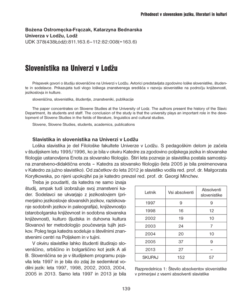 Prihodnost v slovenskem jeziku, literaturi in kulturi Bożena Ostromęcka-Frączak, Katarzyna Bednarska Univerza v Lodžu, Lodž UDK 378(438Łódź):811.163.6–112:82:008(=163.6) Slovenistika na Univerzi v Lodžu Prispevek govori o študiju slovenščine na Univerzi v Lodžu. Avtorici predstavljata zgodovino loške slovenistike, študente in sodelavce. Prikazujeta tudi vlogo loškega znanstvenega središča v razvoju slovenistike na področju književnosti, jezikoslovja in kulture. slovenščina, slovenistika, študentje, znanstveniki, publikacije The paper concentrates on Slovene Studies at the University of Lodz. The authors present the history of the Slavic Department, its students and staff. The conclusion of the study is that the university plays an important role in the development of Slovene Studies in the fields of literature, linguistics and cultural studies. Slovene, Slovene Studies, students, academics, publications Slavistika in slovenistika na Univerzi v Lodžu Loška slavistika je del Filološke fakultete Univerze v Lodžu. S pedagoškim delom je začela v študijskem letu 1995/1996, ko je bila v okviru Katedre za zgodovino poljskega jezika in slovanske filologije ustanovljena Enota za slovansko filologijo. Štiri leta pozneje je slavistika postala samostojna znanstveno-didaktična enota – Katedra za slovansko filologijo (leta 2005 je bila preimenovana v Katedro za južno slavistiko). Od začetkov do leta 2012 je slavistiko vodila red. prof. dr. Małgorzata Korytkowska, po njeni upokojitvi pa je katedro prevzel red. prof. dr. Georgi Minchev. Treba je poudariti, da katedra ne samo izvaja študij, ampak tudi izobražuje svoj znanstveni ka Absolventi Letnik Vsi absolventi der. Sodelavci se ukvarjajo z jezikoslovjem (prislovenistike merjalno jezikoslovje slovanskih jezikov, raziskova 1997 9 9 nje sodobnih jezikov in paleografija), književnostjo 1998 16 12 (starobolgarska književnost in sodobna slovanska 2002 19 10 književnost), kulturo (ljudska in duhovna kultura Slovanov) ter metodologijo poučevanja tujih jezi2003 24 7 kov. Poleg tega katedra sodeluje s številnimi znan2004 20 10 stvenimi centri na Poljskem in v tujini. 2005 37 9 V okviru slavistike lahko študenti študirajo slovenščino, srbščino in bolgarščino kot jezik A ali 2013 27 – B. Slovenščina se je v študijskem programu pojaSKUPAJ 152 57 vila leta 1997 in je bila do zdaj že sedemkrat vo dilni jezik: leta 1997, 1998, 2002, 2003, 2004, Razpredelnica 1: Število absolventov slovenistike v primerjavi z vsemi absolventi slavistike 2005 in 2013. Samo leta 1997 in 2013 je bila 139 Prihodnost v slovenskem jeziku, literaturi in kulturi slovenščina edina možna izbira; v drugih letih so študenti lahko izbirali med dvema jezikoma. Število absolventov slovenistike v primerjavi z vsemi absolventi predstavlja razpredelnica 1. Poleg podatkov, navedenih v razpredelnici, moramo upoštevati še študente, ki so izbrali slovenščino kot drugi slovanski jezik. Takšno možnost so imeli študenti skoraj vseh letnikov. Študij je do leta 2006 trajal pet let, kasneje pa je zaradi bolonjske prenove univerza uvedla dvostopenjski študij (3 + 2). Med študijem so študenti lahko izbirali med jezikoslovno in literarno specializacijo ter v okviru teh specializacij pisali magistrsko nalogo. V sedmih letih je tako slovenistiko končalo 39 književnih zgodovinarjev in 18 jezikoslovcev. Poleg magistrov se je slovenistika obogatila tudi z doktorji, ki so študirali v Lodžu, zaključili univerzitetni program in nato dosegli naslov doktorja znanosti. To so bili: –Agnieszka Križ (2002, Življenje in delo Franceta Vodnika, mentorica: prof. Bożena Ostro męcka-Frączak), –Maria Wtorkowska (2002, Vloge glagolskega prefiksa w(e)- v poljščini in v- v slovenščini. Primerjalna študija, mentorica: prof. Bożena Ostromęcka-Frączak), –Katarzyna Bednarska (2012, Vloga jezikovnega transfera pri poučevanju poljščine Sloven cev na Univerzi v Ljubljani, mentorica: prof. Bożena Ostromęcka-Frączak), –Paweł Kowalski (2012, Porabski Slovenci in njihov jezik, mentor: prof. Władysław Kryzia), –Anna Stefan (2012, Posesivne in partitivne strukture v slovenščini in poljščini, mentor: prof. Władysław Kryzia), –Kamil Szafraniec (2014, Prevajalske tehnike v prevodih izbranih poljskih modernih romanov v slovenščino, mentorica: prof. Bożena Ostromęcka-Frączak). Do zdaj so slovenščino v Lodžu poučevali trije lektorji iz Slovenije: Aleksander Križ (1997– 2009), Janja Vollmaier Lubej (2009–2011) in Mateja Gojkošek (2011–2014). Poleg lektorjev se s slovenistiko ukvarjajo tudi strokovnjaki za jezikoslovje in književnost. Književnost so v tem obdobju predavali prof. Zdzisław Darasz, dr. Anetta Buras-Marciniak in dr. Agnieszka Križ, jezikoslovje pa prof. Władysław Kryzia, prof. Bożena Ostromęcka-Frączak, dr. Agnieszka Zatorska, dr. Katarzyna Bednarska, mgr. Ewa Kaczmarska-Wilczyńska in mgr. Marcin Baniowski. Publikacije loških slovenistov Loški slovenisti so objavili veliko znanstvenih publikacij na področju jezikoslovja, književnosti in kulture. Poudariti morava, da sva v seznam vključili samo tiste publikacije, ki so bile objavljene od leta 1997, ko se je na Univerzi v Lodžu odprla slovenistika, in le tiste, v katerih je slovenski jezik, lite ratura ali kultura glavni predmet razprave. Tako nisva upoštevali prispevkov, ki govorijo o slovenščini samo v primerjavi z drugimi slovanskimi jeziki. Poleg tega nisva vključili publikacij doc. dr. Marie Wtorkowske, ki je sicer doktorirala v Lodžu, vendar dela na Univerzi v Ljubljani. 140 Prihodnost v slovenskem jeziku, literaturi in kulturi Književnost in kultura S slovensko književnostjo se ukvarja predvsem prof. Zdzisław Darasz, ki je objavil naslednje članke: –1997: Sonety France Prešerna w polskich przekładach. B. Paternu, F. Jakopin (ur.): Sonet in sonetni venec. Obdobja 16. Ljubljana: Filozofska fakulteta. 337–343. –1997: Niektór