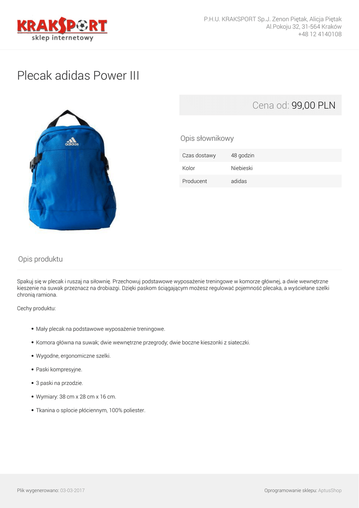 P.H.U. KRAKSPORT Sp.J. Zenon Piętak, Alicja Piętak Al.Pokoju 32, 31-564 Kraków +48 12 4140108 Plecak adidas Power III Cena od: 99,00 PLN Opis słownikowy Czas dostawy 48 godzin Kolor Niebieski Producent adidas Opis produktu Spakuj się w plecak i ruszaj na siłownię. Przechowuj podstawowe wyposażenie treningowe w komorze głównej, a dwie wewnętrzne kieszenie na suwak przeznacz na drobiazgi. Dzięki paskom ściągającym możesz regulować pojemność plecaka, a wyściełane szelki chronią ramiona. Cechy produktu: Mały plecak na podstawowe wyposażenie treningowe. Komora główna na suwak; dwie wewnętrzne przegrody; dwie boczne kieszonki z siateczki. Wygodne, ergonomiczne szelki. Paski kompresyjne. 3 paski na przodzie. Wymiary: 38 cm x 28 cm x 16 cm. Tkanina o splocie płóciennym, 100% poliester. Plik wygenerowano: 03-03-2017 Oprogramowanie sklepu: AptusShop P.H.U. KRAKSPORT Sp.J. Zenon Piętak, Alicja Piętak Al.Pokoju 32, 31-564 Kraków +48 12 4140108 Warianty produktu uniwersalny 99,00 PLN Galeria Plik wygenerowano: 03-03-2017 Powered by TCPDF (www.tcpdf.org) Oprogramowanie sklepu: AptusShop