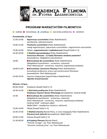 PROGRAM WARSZTATÓW FILMOWYCH - wykład; - konsultacje; - projekcja; - warsztaty praktyczne; - szkolenie Poniedziałek, 12 lipca 11:00-14:00 Rejestracja uczestników [Pałac Radolińskich] akredytacja, zakwaterowanie 14:00-14:30 Powitanie uczestników [Pałac Radolińskich] uwagi organizacyjne, zapoznanie uczestników z regulaminem warsztatów 15:00-16:00 Obiad z organizatorami i wykładowcami [Zespół Szkół nr 5] Wykład wprowadzający [Pałac Radolińskich] 16:30-18:30 Scenariusz filmowy - co każdy filmowiec wiedzieć powinien? (prowadzenie: Magdalena Łazarkiewicz) 19:00Konsultacje dla uczestników [Pałac Radolińskich] (Magdalena Łazarkiewicz - scenariusz, reżyseria) (Piotr Matwiejczyk - scenariusz, reżyseria, organizacja produkcji) Konsultacje: Scenariusz filmowy [Pałac Radolińskich] 19:00-21:30 konsultacje praktyczne, praca nad scenariuszem filmowym (prowadzenie: Piotr Matwiejczyk) 22:00-23:30 Impreza integracyjna [ogród Pałacu Radolińskich] Ognisko Scenariuszowe Wtorek, 13 lipca 09:00-10:00 Śniadanie [Zespół Szkół nr 5] 10:30-14:30 14:30- 15:00-16:00 16:30-19:30 20:00-21:00 21:30-00:30 Warsztaty praktyczne [Pałac Radolińskich] Podstawy reżyserii obrazu filmowego (prowadzenie: Andrzej Wolf) Konsultacje dla uczestników [Pałac Radolińskich] (Magdalena Łazarkiewicz - scenariusz, reżyseria) (Piotr Matwiejczyk - scenariusz, reżyseria, organizacja produkcji) (Andrzej Wolf - realizacja zdjęć) (Rafał Mohr - współpraca reżysera z aktorem) Obiad [Zespół Szkół nr 5] Wykład otwarty [Rynek-Plaża, w razie niepogody Pałac Radolińskich] Pierwszy krok aktorski (prowadzenie: Rafał Mohr) Kolacja [Zespół Szkół nr 5] Projekcja filmowa [Rynek-Plaża] "Piotrek 13-tego", reż. Piotr Matwiejczyk "Koszmar minionej zimy", reż. Piotr Matwiejczyk 1 Środa, 14 lipca 09:00-10:00 Śniadanie [Zespół Szkół nr 5] 10:00- 10:30-12:30 13:00-14:00 14:30-18:30 19:00-20:00 Konsultacje dla uczestników [Pałac Radolińskich] (Magdalena Łazarkiewicz - scenariusz, reżyseria) (Piotr Matwiejczyk - scenariusz, reżyseria, organizacja produkcji) (Andrzej Wolf - realizacja zdjęć) (Rafał Mohr - konsultacje aktorskie) (Mateusz Damięcki - konsultacje aktorskie) Warsztaty praktyczne [Pałac Radolińskich] Realizacja etiud przez grupy warsztatowe (prowadzenie: Piotr Matwiejczyk, Andrzej Wolf) (konsultacje: Magdalena Łazarkiewicz) Obiad [Zespół Szkół nr 5] Wydarzenie specjalne [Rynek] Realizacja dużej sceny filmowej w centrum miasta z udziałem kranu kamerowego (prowadzenie: Magdalena Łazarkiewicz - opieka reżyserska; Andrzej Wolf - opieka operatorska, Rafał Mohr - prowadzenie aktorów) Kolacja [Zespół Szkół nr 5] 20:30-21:30 Kurs aktorski [Rynek-Plaża, w razie niepogody - Pałac Radolińskich] przygotowania i konsultacje dla uczestników (prowadzenie: Mateusz Damięcki i Rafał Mohr) 21:30-23:00 Drugi krok aktorski [Rynek-Plaża, w razie niepogody - Pałac Radolińskich] kurs aktorski - praca w grupach (prowadzenie: Mateusz Damięcki i Rafał Mohr) Czwartek, 15 lipca 09:00-10:00 Śniadanie [Zespół Szkół nr 5] 10:00- Konsultacje dla uczestników [Pałac Radolińskich] (Magdalena Łazarkiewicz - scenariusz, reżyseria) (Piotr Matwiejczyk - scenariusz, reżyseria, organizacja produkcji) (Andrzej Wolf - realizacja zdjęć) (Rafał Mohr - konsultacje aktorskie) (Mateusz Damięcki - konsultacje aktorskie) (Rafał Listopad - montaż) 10:30-12:00 Wykład otwarty [Rynek-Plaża, w razie niepogody - Pałac Radolińskich] Trzeci krok aktorski (prowadzenie: Mateusz Damięcki) 2 12:30-14:30 15:00-16:00 16:30-18:30 19:00-20:00 20:30-21:30 21:30-23:00 Warsztaty praktyczne [przestrzeń miejska] Realizacja etiud przez grupy warsztatowe (prowadzenie: Andrzej Wolf i Piotr Matwiejczyk) (konsultacje - Magdalena Łazarkiewicz) Obiad [Zespół Szkół nr 5] Wykład otwarty [Rynek-Plaża, w razie niepogody - Pałac Radolińskich] Czwarty krok aktorski (prowadzenie: Rafał Mohr) Kolacja [Zespół Szkół nr 5] Ostre cięcie - montaż filmowy bez tajemnic [Pałac Radolińskich] wykład otwarty, prezentacja sprzętu do montażu filmowego firmy APPLE (prowadzenie: Rafał Listopad) Projekcja filmowa [Rynek-Plaża] "Kup teraz", reż. Piotr Matwiejczyk Piątek, 16 lipca 09:00-10:00 Śniadanie [Zespół Szkół nr 5] 10:00- Konsultacje dla uczestników [Pałac Radolińskich] (Magdalena Łazarkiewicz - scenariusz, reżyseria) (Andrzej Wolf - realizacja zdjęć) (Mateusz Damięcki - konsultacje aktorskie) (Rafał Listopad - montaż) 10:30-12:00 Wykład otwarty [Pałac Radolińskich] Piąty krok aktorski (prowadzenie: Mateusz Damięcki) Warsztaty praktyczne [przestrzeń miejska] Realizacja etiud przez grupy warsztatowe (prowadzenie: Andrzej Wolf i Piotr Matwiejczyk) (konsultacje - Magdalena Łazarkiewicz) Obiad [Zespół Szkół nr 5] 12:30-15:00 15:00-16:00 16:30-19:00 19:30-20:30 21:00-22:30 Montaż obrazu filmowego [Pałac Radolińskich] wykład otwarty, szkolenie, konsultacje, prezentacja sprzętu firmy APPLE (prowadzenie: Rafał Listopad) Kolacja [Zespół Szkół nr 5] Wykład otwarty [Pałac Radolińskich] Na początku był obraz - co to jest język filmu? (prowadzenie: Magdalena Łazarkiewicz) 3 Sobota, 17 lipca 09:00-10:00 Śniadanie [Zespół Szkół nr 5] 10:00- Konsultacje dla uczestników [Pałac Radolińskich] (Magdalena Łazarkiewicz - scenariusz, reżyseria) (Piotr Matwiejczyk - scenariusz, reżyseria, organizacja produkcji) (Andrzej Wolf - realizacja zdjęć) (Rafał Listopad - montaż) 10:30-14:30 Montaż obrazu filmowego [Pałac Radolińskich] wykład otwarty, szkolenie, konsultacje, prezentacja sprzętu firmy APPLE (prowadzenie: Rafał Listopad) Obiad [Zespół Szkół nr 5] 15:00-16:00 16:30-18:00 18:30-19:30 20:00-22:30 Wykład otwarty [Pałac Radolińskich] Zawód reżyser - poeta czy kapral? (prowadzenie: Magdalena Łazarkiewicz) Kolacja [Zespół Szkół nr 5] Konsultacje [Pałac Radolińskich] Prace nad etiudami filmowymi (prowadzenie: Magdalena Łazarkiewicz, Rafał Lis