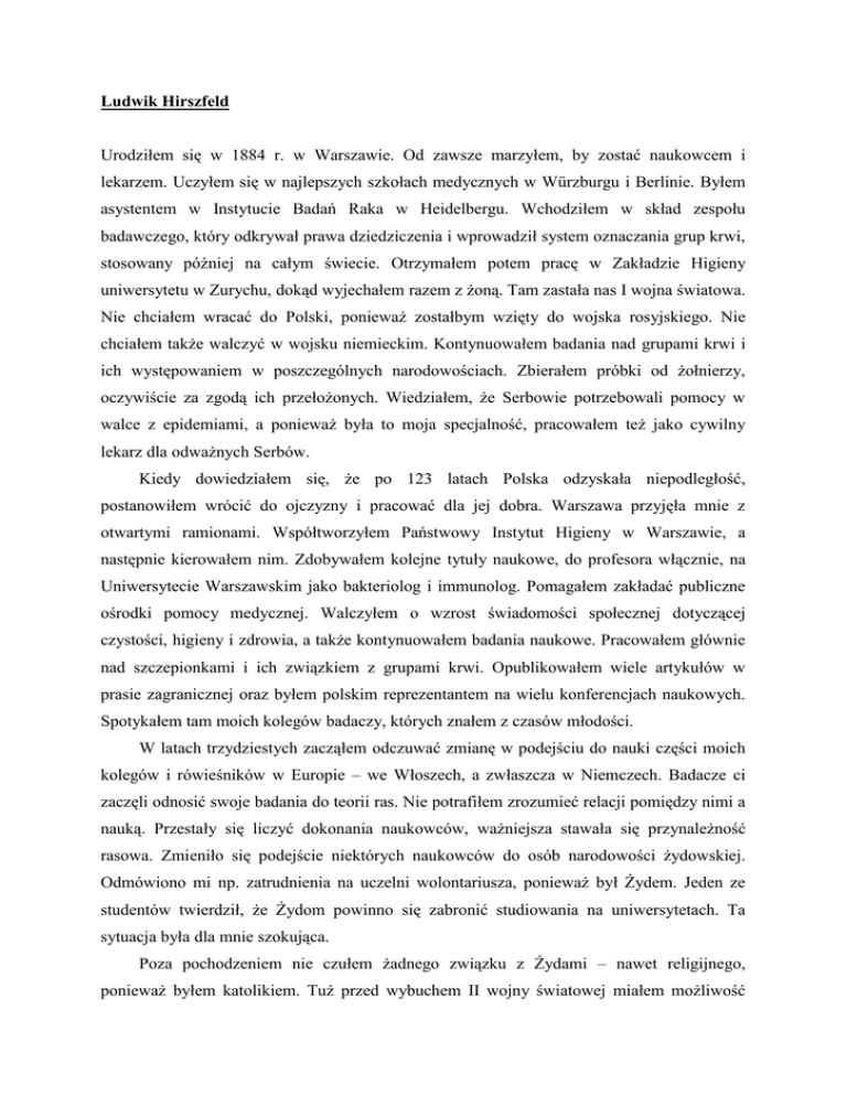 Ludwik Hirszfeld Urodziłem się w 1884 r. w Warszawie. Od zawsze marzyłem, by zostać naukowcem i lekarzem. Uczyłem się w najlepszych szkołach medycznych w Würzburgu i Berlinie. Byłem asystentem w Instytucie Badań Raka w Heidelbergu. Wchodziłem w skład zespołu badawczego, który odkrywał prawa dziedziczenia i wprowadził system oznaczania grup krwi, stosowany później na całym świecie. Otrzymałem potem pracę w Zakładzie Higieny uniwersytetu w Zurychu, dokąd wyjechałem razem z żoną. Tam zastała nas I wojna światowa. Nie chciałem wracać do Polski, ponieważ zostałbym wzięty do wojska rosyjskiego. Nie chciałem także walczyć w wojsku niemieckim. Kontynuowałem badania nad grupami krwi i ich występowaniem w poszczególnych narodowościach. Zbierałem próbki od żołnierzy, oczywiście za zgodą ich przełożonych. Wiedziałem, że Serbowie potrzebowali pomocy w walce z epidemiami, a ponieważ była to moja specjalność, pracowałem też jako cywilny lekarz dla odważnych Serbów. Kiedy dowiedziałem się, że po 123 latach Polska odzyskała niepodległość, postanowiłem wrócić do ojczyzny i pracować dla jej dobra. Warszawa przyjęła mnie z otwartymi ramionami. Współtworzyłem Państwowy Instytut Higieny w Warszawie, a następnie kierowałem nim. Zdobywałem kolejne tytuły naukowe, do profesora włącznie, na Uniwersytecie Warszawskim jako bakteriolog i immunolog. Pomagałem zakładać publiczne ośrodki pomocy medycznej. Walczyłem o wzrost świadomości społecznej dotyczącej czystości, higieny i zdrowia, a także kontynuowałem badania naukowe. Pracowałem głównie nad szczepionkami i ich związkiem z grupami krwi. Opublikowałem wiele artykułów w prasie zagranicznej oraz byłem polskim reprezentantem na wielu konferencjach naukowych. Spotykałem tam moich kolegów badaczy, których znałem z czasów młodości. W latach trzydziestych zacząłem odczuwać zmianę w podejściu do nauki części moich kolegów i rówieśników w Europie – we Włoszech, a zwłaszcza w Niemczech. Badacze ci zaczęli odnosić swoje badania do teorii ras. Nie potrafiłem zrozumieć relacji pomiędzy nimi a nauką. Przestały się liczyć dokonania naukowców, ważniejsza stawała się przynależność rasowa. Zmieniło się podejście niektórych naukowców do osób narodowości żydowskiej. Odmówiono mi np. zatrudnienia na uczelni wolontariusza, ponieważ był Żydem. Jeden ze studentów twierdził, że Żydom powinno się zabronić studiowania na uniwersytetach. Ta sytuacja była dla mnie szokująca. Poza pochodzeniem nie czułem żadnego związku z Żydami – nawet religijnego, ponieważ byłem katolikiem. Tuż przed wybuchem II wojny światowej miałem możliwość wyemigrowania do Stanów Zjednoczonych, postanowiłem jednak zostać w Polsce, gdyż wiedziałem, że jestem tutaj potrzebny.