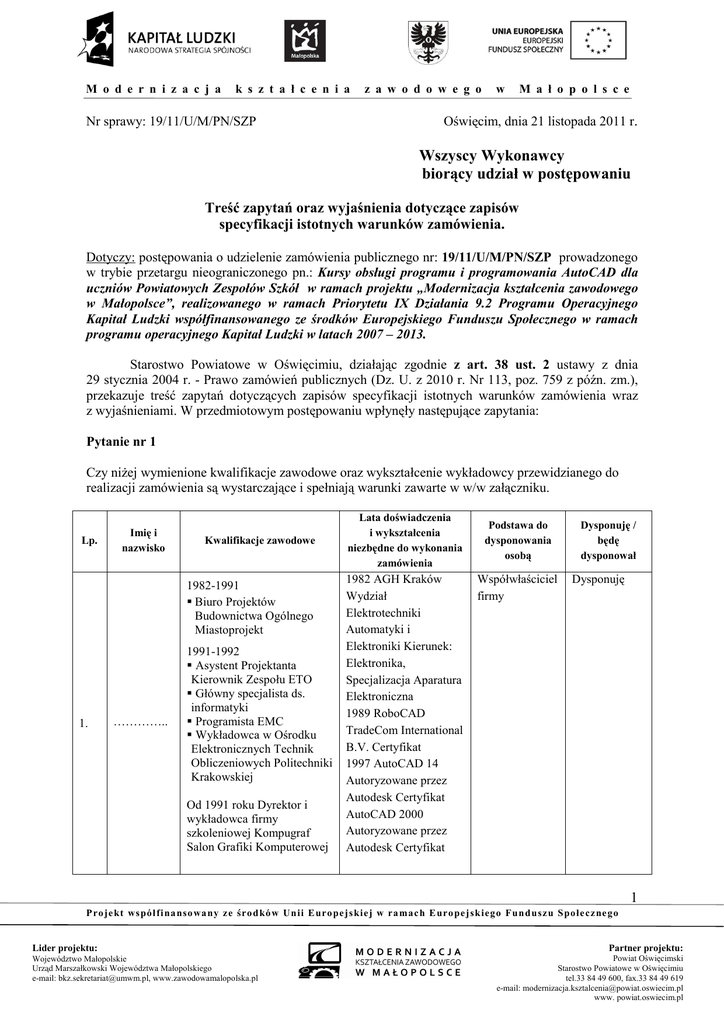 M o d e r n i z a c j a k s z t a ł c e n i a Nr sprawy: 19/11/U/M/PN/SZP z a w o d o w e g o w M a ł o p o l s c e Oświęcim, dnia 21 listopada 2011 r. Wszyscy Wykonawcy biorący udział w postępowaniu Treść zapytań oraz wyjaśnienia dotyczące zapisów specyfikacji istotnych warunków zamówienia. Dotyczy: postępowania o udzielenie zamówienia publicznego nr: 19/11/U/M/PN/SZP prowadzonego w trybie przetargu nieograniczonego pn.: Kursy obsługi programu i programowania AutoCAD dla uczniów Powiatowych Zespołów Szkół w ramach projektu „Modernizacja kształcenia zawodowego w Małopolsce”, realizowanego w ramach Priorytetu IX Działania 9.2 Programu Operacyjnego Kapitał Ludzki współfinansowanego ze środków Europejskiego Funduszu Społecznego w ramach programu operacyjnego Kapitał Ludzki w latach 2007 – 2013. Starostwo Powiatowe w Oświęcimiu, działając zgodnie z art. 38 ust. 2 ustawy z dnia 29 stycznia 2004 r. - Prawo zamówień publicznych (Dz. U. z 2010 r. Nr 113, poz. 759 z późn. zm.), przekazuje treść zapytań dotyczących zapisów specyfikacji istotnych warunków zamówienia wraz z wyjaśnieniami. W przedmiotowym postępowaniu wpłynęły następujące zapytania: Pytanie nr 1 Czy niżej wymienione kwalifikacje zawodowe oraz wykształcenie wykładowcy przewidzianego do realizacji zamówienia są wystarczające i spełniają warunki zawarte w w/w załączniku. Lp. Imię i nazwisko Kwalifikacje zawodowe 1982-1991 Biuro Projektów Budownictwa Ogólnego Miastoprojekt 1. ………….. 1991-1992 Asystent Projektanta Kierownik Zespołu ETO Główny specjalista ds. informatyki Programista EMC Wykładowca w Ośrodku Elektronicznych Technik Obliczeniowych Politechniki Krakowskiej Od 1991 roku Dyrektor i wykładowca firmy szkoleniowej Kompugraf Salon Grafiki Komputerowej Lata doświadczenia i wykształcenia niezbędne do wykonania zamówienia 1982 AGH Kraków Wydział Elektrotechniki Automatyki i Elektroniki Kierunek: Elektronika, Specjalizacja Aparatura Elektroniczna 1989 RoboCAD TradeCom International B.V. Certyfikat 1997 AutoCAD 14 Autoryzowane przez Autodesk Certyfikat AutoCAD 2000 Autoryzowane przez Autodesk Certyfikat Podstawa do dysponowania osobą Współwłaściciel firmy Dysponuję / będę dysponował Dysponuję 1 P ro je kt ws pół fi na nso wa ny z e śro d kó w Un ii E uro pe j s kie j w ra mac h E uro pe j sk iego Fu nd u sz u S połe cz nego Lider projektu: Województwo Małopolskie Urząd Marszałkowski Województwa Małopolskiego e-mail: [email protected], www.zawodowamalopolska.pl Partner projektu: Powiat Oświęcimski Starostwo Powiatowe w Oświęcimiu tel.33 84 49 600, fax.33 84 49 619 e-mail: [email protected] www. powiat.oswiecim.pl M o d e r n i z a c j a k s z t a ł c e n i a 2005 Kurs metodycznopedagogiczny dla wykładowców i organizatorów szkoleń Certyfikat Doświadczenie nabyte w trakcie wieloletniego prowadzenia szkoleń m.in. Prowadzenie zajęć dydaktycznych ze studentami w zakresie oprogramowania CAD Szkolenia w ramach PHARE 2001 RZL woj. Małopolskie Szkolenie w ramach SPO RZL 2, 3 – prowadzenie szkoleń AutoCAD I, II, III Stopień Prowadzenie szkloeń „System wsparcia kobiet na małopolskim rynku pracy” realizowanego przez MARR Prowadzenie szkoleń w zakresie oprogramowania AutoCAD dla: Miejska Komenda Policji w Krakowie PKN Orlen Grodzki Urząd Pracy PUP Dąbrowa Tarnowska PUP Chrzanów PUP Kraków GUP Kraków PUP Bochnia PUP Olkusz Stow. Księgowych w Polsce Stowarzyszenie Integracja PUP Tarnów PUP Sanok PUP Andrychów PUP Brzesko PUP Wieliczka PUP Zakopane Grupy studentów AGH Kujawsko Pomorskie Centrum Edukacji nauczycieli z a w o d o w e g o 2001 AutoCAD 2002 Autoryzowane przez Autodesk 2002 Certyfikat Obsługa cyfrowego zapisu obrazu DVX i DVA – Integral Corporation INC Certyfikat Wykładowca posiada status „Autodesk Approved Instructor” (Autoryzowany Instruktor Autodesk) oraz certyfikaty ukończenia autoryzowanych szkoleń Autodesk. Certyfikat Egzaminatora ECDLCAD AutoCAD Certified Associate AutoCAD Certified professional Biegły sądowy w zakresie komputeryzacji i informatyki w M a ł o p o l s c e Współwłaściciel firmy Dysponuję Odpowiedź: Zamawiający wprowadził zmianę przedmiotowych wymagań w następującym zakresie: 2 P ro je kt ws pół fi na nso wa ny z e śro d kó w Un ii E uro pe j s kie j w ra mac h E uro pe j sk iego Fu nd u sz u S połe cz nego Lider projektu: Województwo Małopolskie Urząd Marszałkowski Województwa Małopolskiego e-mail: [email protected], www.zawodowamalopolska.pl Partner projektu: Powiat Oświęcimski Starostwo Powiatowe w Oświęcimiu tel.33 84 49 600, fax.33 84 49 619 e-mail: [email protected] www. powiat.oswiecim.pl M o d e r n i z a c j a k s z t a ł c e n i a z a w o d o w e g o w M a ł o p o l s c e Część I Kurs obsługi programu AutoCAD – co najmniej jedna osoba, która posiada: wykształcenie wyższe inż. budownictwa lub inne wyższe techniczne (pod warunkiem posiadania co najmniej 3 - letniego doświadczenia zawodowego w branży budowlanej), minimum 3-letnie doświadczenie w projektowaniu przy użyciu AutoCAD, doświadczenie w prowadzeniu kursów/zajęć projektowania w programie AutoCAD. W związku z powyższym przedstawione w zapytaniu kwalifikacje będą zgodne z przedstawionym przez Zamawiającego wymaganiami. Pytanie nr 2 Proszę o wyjaśnienie kwestii liczby grup skierowanych do szkolenia (w ramach zakładanych 150 uczniów dla części II: Kurs programowania AutoCAD) lub określenie liczebności 1 grupy. Odpowiedź: W zakresie liczebności grup w ramach planowanych do przeszkolenia 150 osób informuję, że Zamawiający w SIWZ w dziale III – Opis przedmiotu zamówienia, Części II Kurs programowania Auto CAD po pkt 1 wprowadził pkt 1a w następującym brzmieniu: „1a. Kurs ma być realizowany w grupach liczących od 10 do 15 osób, przy czym w 2011 r. planuje się przeszkolenie ogółem 14 osób, w 2012 r. – 56 osób, w 2013 r. 