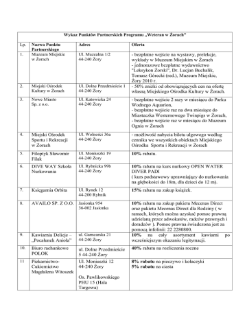 Wykaz Punktów Partnerskich Programu „Weteran w Żorach” Lp. Nazwa Punktu Partnerskiego Muzeum Miejskie w Żorach Adres Oferta Ul. Muzealna 1/2 44-240 Żory 2. Miejski Ośrodek Kultury w Żorach Ul. Dolne Przedmieście 1 44-240 Żory - bezpłatne wejście na wystawy, prelekcje, wykłady w Muzeum Miejskim w Żorach - jednorazowe bezpłatne wydawnictwo "Leksykon Żorski", Dr. Lucjan Buchalik, Tomasz Górecki (red.), Muzeum Miejskie, Żory 2010 r. - 50% zniżki od obowiązujących cen na ofertę własną Miejskiego Ośrodka Kultury w Żorach. 3. Nowe Miasto Sp. z o.o. Ul. Katowicka 24 44-240 Żory - bezpłatne wejście 2 razy w miesiącu do Parku Wodnego Aquarion, - bezpłatne wejście raz na dwa miesiące do Miasteczka Westernowego Twinpigs w Żorach, - bezpłatne wejście raz w miesiącu do Muzeum Ognia w Żorach 4. Miejski Ośrodek Sportu i Rekreacji w Żorach Ul. Wolności 36a 44-240 Żory - możliwość nabycia biletu ulgowego według cennika we wszystkich obiektach Miejskiego Ośrodka Sportu i Rekreacji w Żorach 5. Filoptyk Sławomir Filak Ul. Moniuszki 19 44-240 Żory 10% rabatu. 6. DIVE WAY Szkoła Nurkowania Ul. Rybnicka 99b 44-240 Żory 10% rabatu na kurs nurkowy OPEN WATER DIVER PADI ( kurs podstawowy uprawniający do nurkowania na głębokości do 18m, dla dzieci do 12 m). 7. Księgarnia Orbita Ul. Rynek 12 44-200 Rybnik 15% rabatu na zakup książek. 8. AVAILO SP. Z O.O. Jasionka 954 1. 36-002 Jasionka 9. Kawiarnia Delicje – „Pocałunek Anioła” ul. Garncarska 21 44-240 Żory 10. Biuro rachunkowe POLOK 11 PiekarnictwoCukiernictwo Magdalena Witoszek ul. Dolne Przedmieście 5 44-240 Żory Ul. Moniuszki 12 44-240 Żory Os. Pawlikowskiego PHU 15 (Hala Targowa) 10% rabatu na zakup pakietu Mecenas Direct oraz pakietu Mecenas Direct dla Rodziny ( w ramach, których można uzyskać pomoc prawną udzielaną przez adwokatów, radców prawnych i doradców ). Pomoc prawna świadczona jest za pomocą infolinii: 22 2280800. 10% na cały asortyment kawiarni po wcześniejszym okazaniu legitymacji. 40% rabatu na rozliczenia roczne 8% rabatu na pieczywo i kołaczyki 5% rabatu na ciasta 44-240 Żory Ul. Folwarecka 1c (Targowisko) 44-240 Żory Ul. Ludowego Wojska Polskiego 2c 43-251 Pawłowice