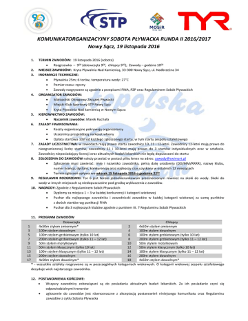 KOMUNIKATORGANIZACYJNY SOBOTA PŁYWACKA RUNDA II 2016/2017 Nowy Sącz, 19 listopada 2016 1. TERMIN ZAWODÓW: 19 listopada 2016 (sobota) Rozgrzewka – 900 (dziewczęta 900, chłopcy 930); Zawody – godzina 1000 2. MIEJSCE ZAWODÓW: Kryta Pływalnia Nad Kamienicą, 33-300 Nowy Sącz, ul. Nadbrzeżna 34 3. INORMACJE TECHNICZNE: Pływalnia 25m; 6 torów, temperatura wody: 27°C Pomiar czasu: ręczny Zawody rozgrywane są zgodnie z przepisami FINA, PZP oraz Regulaminem Sobót Pływackich 4. ORGANIZATOR ZAWODÓW: Małopolski Okręgowy Związek Pływacki Miejski Klub Sportowy STP Nowy Sącz Kryta Pływalnia Nad kamienicą w Nowym Sączu 5. KIEROWNICTWO ZAWODÓW: Naczelnik zawodów: Marek Ruchała 6. ZASADY FINANSOWANIA: Koszty organizacyjne pokrywają organizatorzy Uczestnicy przyjeżdżają na koszt własny Opłata startowa 10zł od każdego zgłoszonego startu, w tym startu zespołu sztafetowego 7. ZASADY UCZESTNICTWA: w zawodach mają prawo startu zawodnicy 10, 11 i 12-letni. Zawodnicy 12-letni mają prawo do nieograniczonej liczby startów, zawodnicy 11 i 10-letni mają prawo do 3 startów indywidualnych oraz w sztafecie. Zawodnicy nieposiadający licencji oraz aktualnych badań lekarskich nie będą dopuszczani do startu 8. ZGŁOSZENIA DO ZAWODÓW należy przesłać w postaci pliku lenex na adres: [email protected] Zgłoszenie musi zawierać: imię i nazwisko zawodnika, pełną datę urodzenia (DD/MM/RRRR), nazwę klubu, numer licencji, dystans, konkurencję oraz najlepszy czas uzyskany w ostatnich 12 miesiącach Termin zgłoszeń upływa we wtorek 15 listopada 2016 o godzinie 2200 9. REGULAMIN ROZGRZEWKI: Tor 6 jest torem jednokierunkowym przeznaczonym również na skoki do wody. Skoki do wody w innych miejscach są niedopuszczalne pod groźbą wykluczenia z zawodów. 10. NAGRODY: Zgodnie z Regulaminem Sobót Pływackich Dyplomy za miejsca 1 – 3 w każdej konkurencji i kategorii wiekowej Puchar dla najlepszego zawodnika i zawodniczki zawodów w każdej kategorii wiekowej za sumę punktów z dwóch startów wg punktacji FINA Puchar dla 3 najlepszych klubów zgodnie z punktem III. 7 Regulaminu Sobót Pływackich 11. PROGRAM ZAWODÓW Dziewczęta 1 4x50m stylem zmiennym* 2 3 100m stylem dowolnym 4 5 100m stylem grzbietowym (tylko 10 lat) 6 7 200m stylem grzbietowym (tylko 11 – 12 lat) 8 9 50m stylem motylkowym 10 11 50m stylem klasycznym (tylko 10 lat) 12 13 100m stylem klasycznym (tylko 11 – 12 lat) 14 15 200m stylem dowolnym 16 17 4x50m stylem dowolnym* 18 * - wszystkie sztafety rozgrywane są w poszczególnych kategoriach decyduje wiek najstarszego zawodnika. Chłopcy 4x50m stylem zmiennym 100m stylem dowolnym 100m stylem grzbietowym (tylko 10 lat) 200m stylem grzbietowym (tylko 11 – 12 lat) 50m stylem motylkowym 50m stylem klasycznym (tylko 10 lat) 100m stylem klasycznym (tylko 11 – 12 lat) 200m stylem dowolnym 4x50m stylem dowolnym* wiekowych. O kategorii wiekowej zespołu sztafetowego 12. POSTANOWIENIA KOŃCOWE: Wszyscy zawodnicy zobowiązani są do posiadania aktualnych badań lekarskich. Za ich posiadanie czyni się odpowiedzialnymi trenerów zgłoszenie do zawodów jest równoznaczne z akceptacją postanowień niniejszego komunikatu oraz Regulaminu zawodów z cyklu Sobota Pływacka
