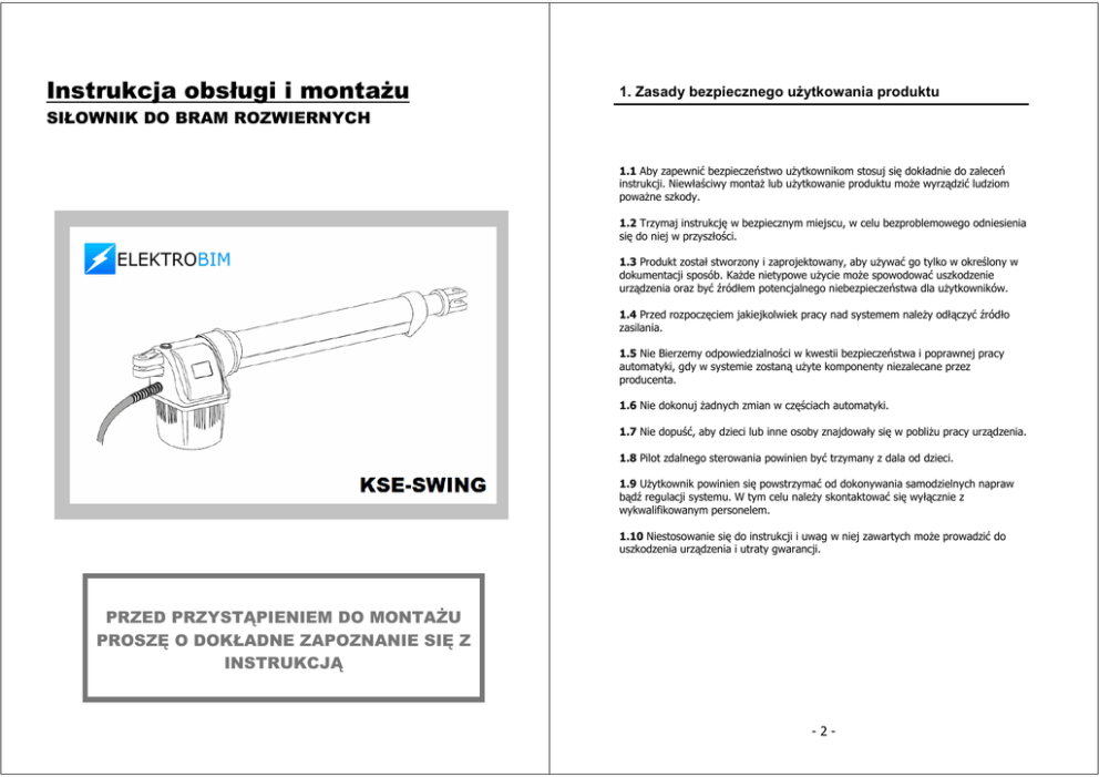 Instrukcja obsługi i montażu 1. Zasady bezpiecznego użytkowania produktu SIŁOWNIK DO BRAM ROZWIERNYCH 1.1 Aby zapewnić bezpieczeństwo użytkownikom stosuj się dokładnie do zaleceń instrukcji. Niewłaściwy montaż lub użytkowanie produktu może wyrządzić ludziom poważne szkody. 1.2 Trzymaj instrukcję w bezpiecznym miejscu, w celu bezproblemowego odniesienia się do niej w przyszłości. 1.3 Produkt został stworzony i zaprojektowany, aby używać go tylko w określony w dokumentacji sposób. Każde nietypowe użycie może spowodować uszkodzenie urządzenia oraz być źródłem potencjalnego niebezpieczeństwa dla użytkowników. 1.4 Przed rozpoczęciem jakiejkolwiek pracy nad systemem należy odłączyć źródło zasilania. 1.5 Nie Bierzemy odpowiedzialności w kwestii bezpieczeństwa i poprawnej pracy automatyki, gdy w systemie zostaną użyte komponenty niezalecane przez producenta. 1.6 Nie dokonuj żadnych zmian w częściach automatyki. 1.7 Nie dopuść, aby dzieci lub inne osoby znajdowały się w pobliżu pracy urządzenia. 1.8 Pilot zdalnego sterowania powinien być trzymany z dala od dzieci. 1.9 Użytkownik powinien się powstrzymać od dokonywania samodzielnych napraw bądź regulacji systemu. W tym celu należy skontaktować się wyłącznie z wykwalifikowanym personelem. 1.10 Niestosowanie się do instrukcji i uwag w niej zawartych może prowadzić do uszkodzenia urządzenia i utraty gwarancji. PRZED PRZYSTĄPIENIEM DO MONTAŻU PROSZĘ O DOKŁADNE ZAPOZNANIE SIĘ Z INSTRUKCJĄ -2- 2. Specyfikacja techniczna 3. Wymiary i montaż mechaniczny Powyższe wymiary mogą się niewiele różnić. Moc silnika 24VDC 60W Prędkość obrotowa 1500 obr./min Prędkość przesuwu ramienia 16 mm/sek Wysuw ramienia 300mm Maksymalna długość otwieranego skrzydła Zakres temperatur 3m -25°C ~ 65°C Klasa ochrony IP54 Wyłączniki krańcowe magnetyczne -3- UWAGA !!! Aby nie doszło do uszkodzenia mechanizmu wysuwany trzpień siłownika nie może osiągać swojej pozycji maksymalnie wsuniętej ani maksymalnie wysuniętej – należy zapewnić przynajmniej 5mm luzu. Na przykładzie Rys. 2 oznacza to, że dystans pomiędzy środkiem tylnego mocowania i środkiem przedniego mocowania siłownika zamontowanego na bramie musi być dłuższy niż 655mm w przypadku siłownika w pełni złożonego (Rys. 12). Wymagany luz należy zapewnić poprzez odpowiednie ustawienie magnetycznych wyłączników krańcowych (Rys. 14) lub odbojników (Rys. 15) w tym przypadku skrzydło powinno dojść do odboju zanim wysuwany trzpień osiągnie pozycje w pełni wsuniętą lub w pełni wysuniętą. -4- UWAGA !!! Siłownik powinien być pochylony lekko ramieniem ku dołowi (Rys. 10) – tylko taki montaż zapewnia prawidłowe odprowadzanie wody i wilgoci zbierającej się na siłowniku. Nie należy montować siłowników narażonych na warunki atmosferyczne „silnikiem do góry”. Przykład: L=650+5mm A B C D E F L 100 188 30 90° 98 843 655 90 198 40 90° 98 853 655 98 188 30 90° 98 849 655 -5- W przypadku niestosowania się do powyższych zaleceń może dojść do awarii silnika. -6- -7- -8- 4. Regulacja wysuwu siłowników UWAGA !!! Podczas eksploatacji zadbaj o to, aby: Gumowy kapturek uszczelniający bezwzględnie zawsze był założony na zamku, Przewód zasilający siłownik (dławica kablowa) był zawsze dobrze dokręcony do korpusu siłownika, Przewód zasilający nie był narażony na nadmierne wyginanie. -9-