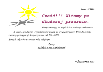 Numer 1/2011 Cześć!!! Witamy po dłuższej przerwie. Mamy nadzieję, że spędziliście wakacje znakomicie. A teraz… po długim wypoczynku wracamy do wytężonej pracy. Więc do roboty, ruszamy pełną parą! Rozpoczynamy rok 2011/2012. Samych sukcesów w nowym roku szkolnym Życzy: Redakcja wraz z opiekunami PAŹDZIERNIK 2011 14 października Święto Edukacji Narodowej "Najcenniejszym i najtrwalszym podarunkiem jaki można dać dziecku - jest wykształcenie". W podzięce za trud włożony w naszą edukację, samych radości, sukcesów zawodowych oraz energii i wytrwałości w realizacji planów życiowych, Dyrekcji, Nauczycielom i Wychowawcom życzą uczniowie całej szkoły oraz Redakcja. PAŹDZIERNIK 2011 · Otrzęsiny klas pierwszych w Gimnazjum!!! 5 października odbyło się oficjalne przyjęcie uczniów klas I w poczet gimnazjalistów . Otrzęsiny przygotował Samorząd Uczniowski pod okiem pani Celiny Świebockiej. Imprezie towarzyszyły liczne zabawy i konkurencje takie jak: skakanie na skakance w gumofilcach, jedzenie płatków z jogurtem bez używania rąk, tzw. „krzesełka”, pompowanie „balona” łokciem. Po konkurencjach wszyscy uczniowie, w tym także i pierwszoklasiści zaproszeni zostali do wspólnej zabawy. Lecz cóż, duża część uczniów opuściła szkołę rezygnując z dalszej części imprezy… -Niech żałują!- mówi Magda z IA. Uczniowie, którzy zdecydowali się zostać w szkole mieli okazję aż kilka razy tańczyć słynny taniec Belgijski, nasze polskie „kaczuszki” oraz bawić się przy nowoczesnej muzyce. Zabawie, która trwała do 17.00 towarzyszyła wspaniała atmosfera i dobry humor. A my „otrzęsieni” pierwszoklasiści nie zapomnijmy jej chyba na bardzo długo. A oto kilka zdjęć. Więcej w galerii SU Gimnazjum. Zapraszamy ! Przygotowała : M. Matusiewicz Wybajał wielki sukces – Kamil na Sabałowych Bajaniach w Bukowinie. Wielki sukces odniósł kolega naszej szkoły – Kamil Basta, który w Bukowinie Tatrzańskiej zdobył pierwszą nagrodę w Konkursie Gwary Ludowej – zwanym Sabałowe Bajania. Zaprezentował On gadkę własnego autorstwa, pt. Utarg Występ Kamila okazał się być na bardzo wysokim poziomie. Swoją prezentacją zachwycił On zarówno Jury jak i widownię. Wykazał się niesamowitymi zdolnościami aktorskimi i pięknym podegrodzkim strojem regionalnym. Występowi towarzyszyły ogromne emocje i gromkie brawa. Sabałowe Bajania - jest to impreza o prestiżu ogólnopolskim, tym bardziej jesteśmy dumni z naszego kolegi i mamy nadzieję, że znajdziemy wśród uczniów naszej szkoły godnego zastępcę. Artyście gratulujemy i życzymy dalszych sukcesów… D.Majerska, D.Król 1A JAK PRZEŻYĆ PIERWSZE DNI I TYGODNIE W SZKOLE – RADY DLA PIERWSZOKLASISTÓW I NIE TYLKO !! Pierwszy dzień szkoły jest bardzo stresujący dla wszystkich – szczególnie dla pierwszoklasistów. DLATEGO ZAPAMIĘTAJ!!! 1. Najważniejsze – to dotrzeć na miejsce i na czas – spóźnialstwo nie popłaca! Do szkoły najlepiej przyjść wcześniej niż trzeba. Gdy masz problem ze znalezieniem klasy zapoznaj się z kimśwe dwójkę raźniej. Gdybyś się zgubił nie wstydź się pytać .Ale nasza szkoła nie jest taka duża więc na pewno szybko się zlokalizujesz. 2. Kto z kim przestaje… Nowa szkoła to nowi znajomi. Najważniejsze jest to by zapoznać się z rówieśnikami z twojej klasy. Nie wstydź się do nich zagadać, ale też nie bądź wylewny, bo ich jeszcze nie znasz. Nie staraj się na się przypodobać, ale też nie krytykuj nikogo. 3. Nauczyciel, nasz pan…? Niestety TA PRAWDA STARA JAK ŚWIAT. Dlatego z nauczycielem nie należy „zaczynać”, ani się sprzeciwiać .Pamiętaj, że nauczyciel ma pełna władzę nad ocenami i zawsze może się odwdzięczyć. A zbytnie narzucanie się, czy pospolite lizusostwo też jest niewskazane. 4. Zrób sobie przerwę! Na przerwach na reszcie jesteś wolny ! Możesz zjeść kanapkę, pogadać z koleżankami / kolegami. Przerwy trwają 15min.po 2 i 4 lekcji, a inne 5 min. Ale Uwaga! W tym czasie zabronione jest wychodzenie poza teren szkoły. No i grozi to dodatkowa uwagą. O wagarach nie ma mowy. Dla odważnych … ostrzeżenie – więcej niż 50% nieobecności na zajęciach z danego przedmiotu grozi nieklasyfikowaniem. 5.Uczeń bez jedynki, to jak żołnierz bez karabinu? Jedynki się zdarzają, ale najczęściej z głupoty: za nieodrobienie zadania albo ściąganie w czasie sprawdzianu. To ostatnie jest najboleśniejsze wtedy, kiedy to ktoś ściągał od Ciebie, dlatego radzę uważać. Każdy nauczyciel robi przed klasówką powtórzenie- rzetelny da podobne pytania na lekcji. Ale czasami zdarzają się niespodzianki i pytania nie są w rodzaju tych powtarzanych i wtedy pojawia się problem. 6. Kuć, nie kuć?- oto jest pytanie Sprecyzuj , co chcesz robić w przyszłości, na jakie zamierzasz iść studia, żeby wiedzieć, jakie przedmioty są dla Ciebie ważne – i ich się uczyć. A resztę powtarzać sobie od czasu do czasu, żeby było przyzwoicie, a i oceny nie były straszydłem na świadectwie ukończenia szkoły. Zatem głowy do góry i marsz do szkoły! J N.Stanisz, P.Hebda Szkoła Podstawowa 15 września odbyły się zawody „Pucharu Orlika”, w których udział wzięła drużyna ze Szkoły Podstawowej w składzie: Sebastian Majerski, Rafał Majerski, Michał Warzecha, Łukasz Sajdak, Piotr Pierzchała, Paweł Kozik, Dawid Szelec, Krzysztof Majerski. Niestety po zaciętej walce przegrali z drużyną z Zagorzyna. Gratulujemy wytrwałości i życzymy naszym piłkarzom sukcesów!!! 21 września obok boiska ,,Orlik” odbyły się Gminne Indywidualne Biegi Przełajowe. Opiekunami naszych drużyn byli p. Krzysztof Duda i p. Mariusz Adamczyk naszą szkołę reprezentowało 14 dziewcząt i 15 chłopców. Gratulujemy sukcesu naszym zawodnikom!!! Spośród dziewcząt najlepszy wynik osiągnęły i zakwalifikowały się do kolejnego etapu Agnieszka Stec (4 miejsce) kl.6 Ang