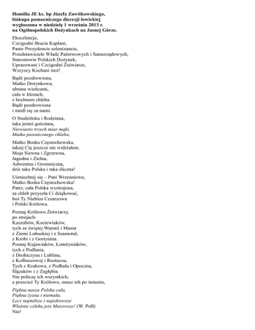 Homilia JE ks. bp Józefa Zawitkowskiego, biskupa pomocniczego diecezji łowickiej wygłoszona w niedzielę 1 września 2013 r. na Ogólnopolskich Dożynkach na Jasnej Górze. Ekscelencje, Czcigodni Bracia Kapłani, Panie Prezydencie solenizancie, Przedstawiciele Władz Państwowych i Samorządowych, Starostowie Polskich Dożynek, Upracowani i Czcigodni Żniwiarze, Wszyscy Kochani moi! Bądź pozdrowiona, Matko Dożynkowa, ubrana wieńcami, cała w kłosach, z bochnem chleba. Bądź pozdrowiona i módl się za nami. O Studzińska i Rodzinna, taka jesteś gościnna, Niewiasto trzech miar mąki, Matko pszenicznego chleba, Matko Boska Częstochowska, takiej Cię jeszcze nie widziałem. Moja Siewna i Zgrzewna, Jagodna i Zielna, Adwentna i Gromniczna, dziś taka Polska i taka śliczna! Uśmiechnij się – Pani Wrześniowa, Matko Boska Częstochowska! Patrz, cała Polska wystrojona, za chleb przyszła Ci dziękować, boś Ty Niebios Cesarzowa i Polski Królowa. Poznaj Królowo Żniwiarzy, po strojach: Kaszubów, Kociewiaków, tych ze świętej Warmii i Mazur z Ziemi Lubuskiej i z Szamotuł, z Krobi i z Gostynina. Poznaj Kujawiaków, Łomżyniaków, tych z Podlasia, z Drohiczyna i Lublina, z Kolbuszowej i Roztocza, Tych z Krakowa, z Podhala i Opoczna, Ślązaków i z Zagłębia. Nie policzę ich wszystkich, a przecież Ty Królowo, znasz ich po imieniu, Piękna nasza Polska cała, Piękna żyzna i niemała, Lecz najmilsze i najzdrowsze Właśnie człeku jest Mazowsze! (W. Poll) Nie! Matko Boska powiedz sama czy jest naród taki, co by kochał Cię Królowo, tak jak my Księżaki? (ks. Tymoteusz) Dożynki to święto dziękczynienia. Lud wierzący to lud kultury, bo potrafi Bogu i ludziom dziękować, Tylko chamowie, ani sobie, ani Bogu nie dziękują. Skąd się tego tak namnożyło? Jestem chłopem z krwi i kości. Jestem oraczem, siewcą i żniwiarzem. I dumny jestem że Pan Jezus tak często mówił o chłopach i sam nazywał się siewcą, i siał, dobrze siał Jedno ziarno padło przy drodze. Ludzie je podeptali, ptaki wydziobały i nic z tego. Drugie padło na grunt skalisty. Chciało rosnąć, ale słońce je wysuszyło, wiatr zadmuchał i znów nic z tego. Trzecie padło między ciernie. Rosło, ale ciernie je zagłuszyły. Też nic z tego. Dopiero czwarte ziarna przyniosły plon trzydziesty, sześćdziesiąty i setny. (por. Mt. 13, 3 – 9) Żniwiarze, Ludzie Częstochowskich Dożynek! Zrozumieliście to wszystko? Tak, to o nas chodzi. Los słowa Bożego, los naszej wiary, od nas zależy. O ziarno trzeba dbać! Żal mi Was – mówił Pan Jezus. Tyle lat trwacie przy Mnie i jesteście głodni. Panie roześlij ich do domów, bo niektórzy przyszli z daleka. Ustaną Ci w drodze. (por. Mk 8,3) Dajcie Wy im jeść: Księża, Biskupi, Prezydenci, Ekonomiści, Ministry, Wójty i Sołtysy! Dajcie Wy im jeść! Panie, ile to trzeba pieniędzy, żeby każdemu dać choćby po kanapce? Jest tu jeden chłopiec z Kocierzewa, co ma jeszcze pięć chlebów i dwie ryby, ale co to jest na tyle ludzi? Wystarczy! Jezus wziął chleby, błogosławił i łamał, i łamał, i łamał, dawał uczniom, a ci rozdawali ludziom. I najedli się wszyscy, ile kto chciał. I starczyło, dla wszystkich. Tylko brzydko jedli. Apostołowie zebrali dwanaście koszów ułomków. Do kraju tego, Gdzie kruszynę chleba Podnoszę z ziemi przez Uszanowanie Tęskno mi Panie! (C. K. Norwid) Nie segregujecie śmieci. Będzie głód! Chleb wrzucacie do śmietników. Już nie tęsknij, Panie Norwid! Ludzie Dożynkowi, dlaczego Wy mnie szukacie? - pytał Pan Jezus. Czy dlatego, żeście widzieli cud, jak Pan Bóg na polach chleb rozmnaża? Czy dlatego, żeście widzieli jak rośnie chleb, jak łan dojrzewa, jak pachnie świeżym chlebem? Czy dlatego, że znów jesteście głodni? Byli bardzo głodni. To postarajcie się o taki chleb, abyście się najedli i więcej nie czuli głodu. Panie daj nam takiego chleba! (J. 6, 34) Ten chleb zstąpił z nieba! (J. 6, 41) Tak pamiętamy! Ojcowie nasi przez czterdzieści lat mieli co dzień mannę z nieba. Ale ten chleb, który Ja mam dla Was, daje życie wieczne. Chlebem tym jest Ciało Moje! Kto pożywa ten chleb, choćby umarł żyć będzie. (por. J. 6, 58) Przesadziłeś Panie! A wczoraj tak mówiłeś pięknie. Jak Ty możesz dać nam Ciało swoje do jedzenia? Twarda jest ta mowa (J. 6, 60) My Cię nie rozumiemy. Posłuchamy cię innym razem (Dz. 17, 32). I z dożynek wracali ludzie do domów zawiedzeni, stracili wiarę. Dość tej ideologii, polityki! Trzeba się wziąć za robotę, pora siać! Co wtedy przeżywał Pan Jezus? Powiedziałem im największą, najświętszą prawdę – nie uwierzyli, odeszli. A ja pytam Was, Czcigodni Ludzie Dożynkowi! Może Wy też chcecie odejść? (J. 6, 67) Nie krępujcie się, Tylu odeszło. Może im lepiej bez Boga? Cisza? Dobrze, że pośród nas był Piotr, że pośród nas jest Franciszek – papież Panie, Nie odsyłaj nas do domów. Do kogo my pójdziemy? Wszyscy nas oszukali. Tylko Ty Słowa Życia masz (J. 6, 67) Ty nas nigdy nie okłamałeś. Piotrze, Ty naprawdę tak wierzysz? Zobaczymy za rok, gdy będzie Ostatnia Wieczerza, gdy będzie sąd u Kajfasza. Ludzie Dożynkowi, ale wy jeszcze wierzycie w rozmnożenie chleba? Ale Wy już nie wiecie, co to na wsi był przednówek? Pośród Was nie ma już rasowych chłopów, nie ma już rolników. Zostali tylko producenci, Ministerstwo Rolnictwa i Rozwoju Wsi Wy już nie znacie wołania przepiórek: Pójdzie żąć! U Was już nie słychać śpiewów skowronka. Jaskółek już nie ma. Bociany, Babie lato, Żurawie, Kuropatwy, zostały tylko na obrazach Chełmońskiego z moich Boczek i z Kulkówki. Do kwiatów trzeba mówić, Ze zwierzętami trzeba rozmawiać, w niebo trzeba z wiarą spoglądać, a ziemię jak matkę rodzoną kochać. Dobrze że przy żniwach, dla podbieraczki i kosiarza nie ma już niewolniczej pracy. To była bardzo ciężka praca, Dziś niech robią to maszyny, ale czy ludzie pr