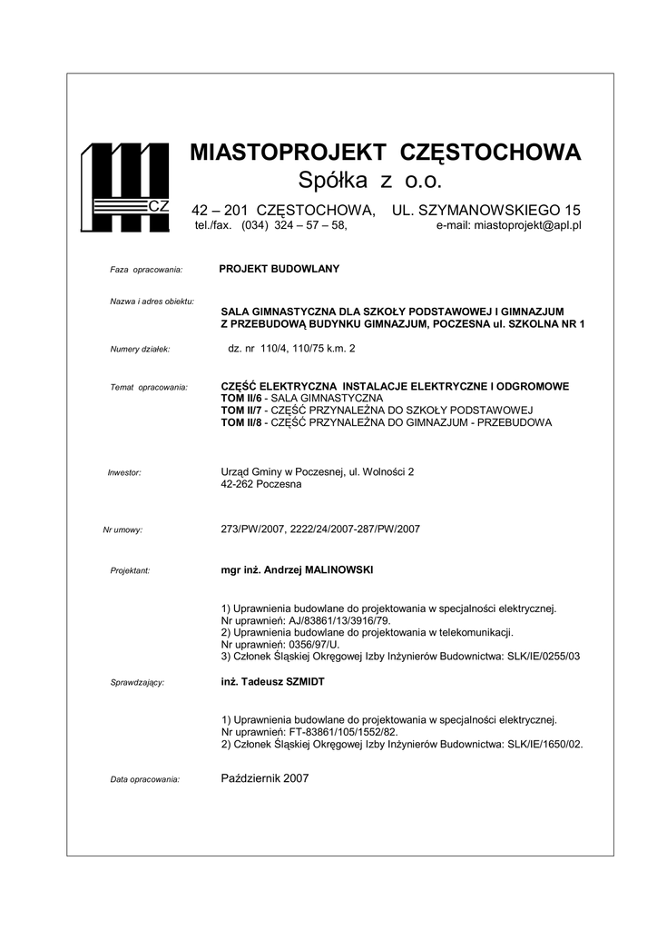 MI MIASTOPROJEKT CZĘSTOCHOWA Spółka z o.o. 42 – 201 CZĘSTOCHOWA, UL. SZYMANOWSKIEGO 15 tel./fax. (034) 1324 – 57 – 58, tytułowa Karta Faza opracowania: e-mail: [email protected] PROJEKT BUDOWLANY Nazwa i adres obiektu: SALA GIMNASTYCZNA DLA SZKOŁY PODSTAWOWEJ I GIMNAZJUM Z PRZEBUDOWĄ BUDYNKU GIMNAZJUM, POCZESNA ul. SZKOLNA NR 1 Numery działek: dz. nr 110/4, 110/75 k.m. 2 Temat opracowania: CZĘŚĆ ELEKTRYCZNA INSTALACJE ELEKTRYCZNE I ODGROMOWE TOM II/6 - SALA GIMNASTYCZNA TOM II/7 - CZĘŚĆ PRZYNALEŻNA DO SZKOŁY PODSTAWOWEJ TOM II/8 - CZĘŚĆ PRZYNALEŻNA DO GIMNAZJUM - PRZEBUDOWA Inwestor: Urząd Gminy w Poczesnej, ul. Wolności 2 42-262 Poczesna Nr umowy: Projektant: 273/PW/2007, 2222/24/2007-287/PW/2007 mgr inż. Andrzej MALINOWSKI 1) Uprawnienia budowlane do projektowania w specjalności elektrycznej. Nr uprawnień: AJ/83861/13/3916/79. 2) Uprawnienia budowlane do projektowania w telekomunikacji. Nr uprawnień: 0356/97/U. 3) Członek Śląskiej Okręgowej Izby Inżynierów Budownictwa: SLK/IE/0255/03 Sprawdzający: inż. Tadeusz SZMIDT 1) Uprawnienia budowlane do projektowania w specjalności elektrycznej. Nr uprawnień: FT-83861/105/1552/82. 2) Członek Śląskiej Okręgowej Izby Inżynierów Budownictwa: SLK/IE/1650/02. Data opracowania: Październik 2007 Niniejsza dokumentacja jest projektem budowlanym i wykonawczym. 2 Projekty związane 2.1 Tom I. Projekt zagospodarowania terenu, przyłącza, sieci Nazwisko i podpis projektanta Nr części projektu Złożone poniżej podpisy potwierdzają, że projekty w branży elektrycznej zostały uzgodnione z autorami niżej wymienionych projektów i dotyczą wszystkich treści zawartych w opisie oraz wszystkich rozwiązań ujętych w rysunkach zawartych w niniejszym projekcie elektrycznym i są potwierdzeniem ujęcia wszystkich wzajemnych wymagań wynikających z branżowych projektów związanych oraz brakiem kolizji z robotami i instalacjami wynikającymi z projektów branżowych. Tom I/1 Projekt zagospodarowania terenu z częścią drogową mgr mgr mgr mgr mgr inż. inż. inż. inż. inż. arch. Antoni Czakiert arch. Małgorzata Czakiert Andrzej Malinowski Jolanta Caban Paweł Rajca Tom I/2 Sieci wod.-kan i sanitarne Przyłącza wod.-kan. Autor, mgr inż. Paweł Rajca Tom I/3 Sieci wod.-kan i sanitarne Przyłącza i przekładka kanalizacji deszczowej. Autor, mgr inż. Paweł Rajca Sieci elektryczne 1 kV Zasilanie kablowe 1 kV sali gimnastycznej i zmiana zasilania gimnazjum po przebudowie. Autor, mgr inż. Andrzej Malinowski Tom I/5 Sieci elektryczne 15 kV Przebudowa linii kablowej 15 kV. Autor, mgr inż. Andrzej Malinowski strona - 2 - 2.2 Tom II. Projekt architektoniczno-budowlany Nazwisko i podpis projektanta Nr części projektu Złożone poniżej podpisy potwierdzają, że projekty w branży elektrycznej zostały uzgodnione z autorami niżej wymienionych projektów i dotyczą wszystkich treści zawartych w opisie oraz wszystkich rozwiązań ujętych w rysunkach zawartych w niniejszym projekcie elektrycznym i są potwierdzeniem ujęcia wszystkich wzajemnych wymagań wynikających z branżowych projektów związanych oraz brakiem kolizji z robotami Tom II/1 Tom II/1a Architektura i detale architektoniczne. Autorzy: mgr inż. arch. Antoni Czakiert mgr inż. arch. Małgorzata Czakiert Tom II/2 Konstrukcje. Autor, inż. Cezary Markowski Tom II/3 Część sanitarna. Instalacje wod.-kan., c.w. i gazu. Autor, mgr inż. Paweł Rajca Tom II/4 Część sanitarna. Instalacje c.o. i wentylacji. Autor, mgr inż. Paweł Rajca Tom II/5 Część sanitarna. Wentylacja mechaniczna sali gimnastycznej. Autor, mgr inż. Paweł Rajca Tom II/6 Część elektryczna. Sala gimnastyczna. Instalacje elektryczne i odgromowe. Autor, mgr inż. Andrzej Malinowski Tom II/7 Tom II/8 Część elektryczna. Część przynależna do szkoły podstawowej. Instalacje elektryczne i odgromowe. Część elektryczna. Część przynależna do gimnazjum. Instalacje elektryczne i odgromowe. strona - 3 - 3 Oświadczenie o wykonaniu projektu zgodnie z przepisami i zasadami wiedzy technicznej Dotyczy Projekt budowlany i wykonawczy w branży elektrycznej Nazwa i adres inwestycji SALA GIMNASTYCZNA DLA SZKOŁY PODSTAWOWEJ I GIMNAZJUM Z PRZEBUDOWĄ BUDYNKU GIMNAZJUM, POCZESNA ul. SZKOLNA NR 1 Temat opracowania Instalacje elektryczne i odgromowe: Tom II/6, Tom II/7, Tom II/8 Inwestor Urząd Gminy w Poczesnej Oświadczamy, że niniejszy projekt budowlany i wykonawczy został wykonany zgodnie z obowiązującymi przepisami oraz zasadami wiedzy technicznej. Projektant mgr inż. Andrzej Malinowski 1) Uprawnienia budowlane do projektowania w specjalności elektrycznej. Nr uprawnień AJ/83861/13/3916/79. 2) Uprawnienia budowlane do projektowania w telekomunikacji. Nr uprawnień 0356/97/U. 3) Członek Śląskiej Okręgowej Izby Inżynierów Budownictwa. Nr rej. SLK/IE/0255/03 Sprawdzający inż. Tadeusz Szmidt 1) Uprawnienia budowlane do projektowania w specjalności elektrycznej. Nr uprawnień FT-83861/105/1552/82. 2) Członek Śląskiej Okręgowej Izby Inżynierów Budownictwa. Nr rej. SLK/IE/1650/02 strona - 4 - 4 Opis zawartości dokumentacji 1 Karta tytułowa ____________________________________________________________________________ 1 2 Projekty związane __________________________________________________________________________ 2 2.1 Tom I. Projekt zagospodarowania terenu, przyłącza, sieci____________________________________ 2 2.2 Tom II. Projekt architektoniczno-budowlany ______________________________________________ 3 3 Oświadczenie o wykonaniu projektu zgodnie z przepisami i zasadami wiedzy technicznej_________________ 4 4 Opis zawartości dokumentacji ________________________________________________________________ 5 5 Bezpieczeństwo i ochrona zdrowia osób w trakcie fizycznej realizacji projektowanego obiektu (BIOZ) _____ 7 5.1 Elementy zagospodarowania działki lub terenu które mogą stwarzać zagrożenie bezpieczeństwa i zdrowia ludzi _______________________