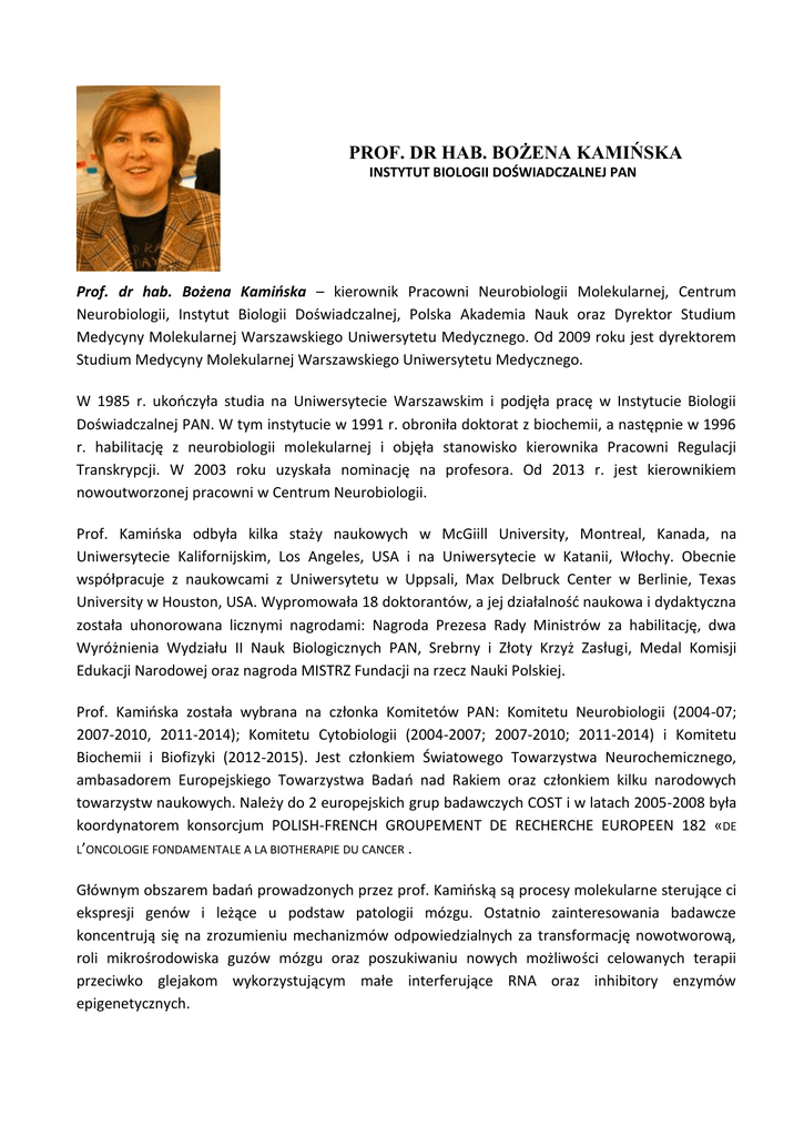 PROF. DR HAB. BOŻENA KAMIŃSKA INSTYTUT BIOLOGII DOŚWIADCZALNEJ PAN Prof. dr hab. Bożena Kamińska – kierownik Pracowni Neurobiologii Molekularnej, Centrum Neurobiologii, Instytut Biologii Doświadczalnej, Polska Akademia Nauk oraz Dyrektor Studium Medycyny Molekularnej Warszawskiego Uniwersytetu Medycznego. Od 2009 roku jest dyrektorem Studium Medycyny Molekularnej Warszawskiego Uniwersytetu Medycznego. W 1985 r. ukończyła studia na Uniwersytecie Warszawskim i podjęła pracę w Instytucie Biologii Doświadczalnej PAN. W tym instytucie w 1991 r. obroniła doktorat z biochemii, a następnie w 1996 r. habilitację z neurobiologii molekularnej i objęła stanowisko kierownika Pracowni Regulacji Transkrypcji. W 2003 roku uzyskała nominację na profesora. Od 2013 r. jest kierownikiem nowoutworzonej pracowni w Centrum Neurobiologii. Prof. Kamińska odbyła kilka staży naukowych w McGiill University, Montreal, Kanada, na Uniwersytecie Kalifornijskim, Los Angeles, USA i na Uniwersytecie w Katanii, Włochy. Obecnie współpracuje z naukowcami z Uniwersytetu w Uppsali, Max Delbruck Center w Berlinie, Texas University w Houston, USA. Wypromowała 18 doktorantów, a jej działalność naukowa i dydaktyczna została uhonorowana licznymi nagrodami: Nagroda Prezesa Rady Ministrów za habilitację, dwa Wyróżnienia Wydziału II Nauk Biologicznych PAN, Srebrny i Złoty Krzyż Zasługi, Medal Komisji Edukacji Narodowej oraz nagroda MISTRZ Fundacji na rzecz Nauki Polskiej. Prof. Kamińska została wybrana na członka Komitetów PAN: Komitetu Neurobiologii (2004-07; 2007-2010, 2011-2014); Komitetu Cytobiologii (2004-2007; 2007-2010; 2011-2014) i Komitetu Biochemii i Biofizyki (2012-2015). Jest członkiem Światowego Towarzystwa Neurochemicznego, ambasadorem Europejskiego Towarzystwa Badań nad Rakiem oraz członkiem kilku narodowych towarzystw naukowych. Należy do 2 europejskich grup badawczych COST i w latach 2005-2008 była koordynatorem konsorcjum POLISH-FRENCH GROUPEMENT DE RECHERCHE EUROPEEN 182 «DE L’ONCOLOGIE FONDAMENTALE A LA BIOTHERAPIE DU CANCER . Głównym obszarem badań prowadzonych przez prof. Kamińską są procesy molekularne sterujące ci ekspresji genów i leżące u podstaw patologii mózgu. Ostatnio zainteresowania badawcze koncentrują się na zrozumieniu mechanizmów odpowiedzialnych za transformację nowotworową, roli mikrośrodowiska guzów mózgu oraz poszukiwaniu nowych możliwości celowanych terapii przeciwko glejakom wykorzystującym małe interferujące RNA oraz inhibitory enzymów epigenetycznych. Prof. Kamińska opublikowała 91 prac oryginalnych w czołowych światowych czasopismach naukowych i 8 rozdziałów w książkach międzynarodowych wydawców; jej prace były cytowane ponad 2200 razy (indeks Hirscha 28).