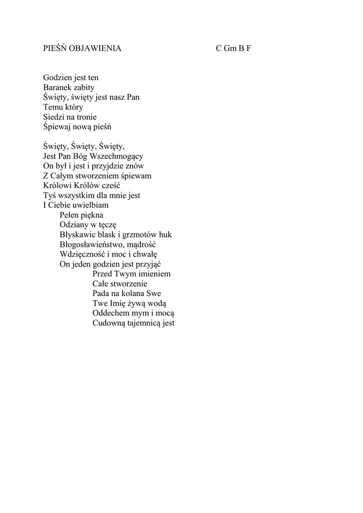 PIEŚŃ OBJAWIENIA Godzien jest ten Baranek zabity Święty, święty jest nasz Pan Temu który Siedzi na tronie Śpiewaj nową pieśń Święty, Święty, Święty, Jest Pan Bóg Wszechmogący On był i jest i przyjdzie znów Z Całym stworzeniem śpiewam Królowi Królów cześć Tyś wszystkim dla mnie jest I Ciebie uwielbiam Pełen piękna Odziany w tęczę Błyskawic blask i grzmotów huk Błogosławieństwo, mądrość Wdzięczność i moc i chwałę On jeden godzien jest przyjąć Przed Twym imieniem Całe stworzenie Pada na kolana Swe Twe Imię żywą wodą Oddechem mym i mocą Cudowną tajemnicą jest C Gm B F