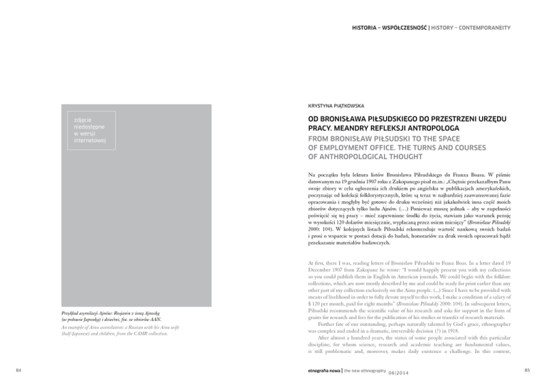 HISTORIA – WSPÓŁCZESNOŚĆ | HISTORY – Contemporaneity KRYSTYNA PIĄTKOWSKA zdjęcie niedostępne w wersji internetowej Od Bronisława Piłsudskiego do przestrzeni Urzędu Pracy. Meandry refleksji antropologa From Bronisław Piłsudski to the space of Employment Office. The turns and courses of anthropological thought Na początku była lektura listów Bronisława Piłsudskiego do Franza Boasa. W piśmie datowanym na 19 grudnia 1907 roku z Zakopanego pisał m.in.: „Chętnie przekazałbym Panu swoje zbiory w celu ogłoszenia ich drukiem po angielsku w publikacjach amerykańskich, poczynając od kolekcji folklorystycznych, które są teraz w najbardziej zaawansowanej fazie opracowania i mogłyby być gotowe do druku wcześniej niż jakakolwiek inna część moich zbiorów dotyczących tylko ludu Ajnów. (…) Ponieważ muszę jednak – aby w zupełności poświęcić się tej pracy – mieć zapewnione środki do życia, stawiam jako warunek pensję w wysokości 120 dolarów miesięcznie, wypłacaną przez osiem miesięcy” (Bronisław Piłsudski 2000: 104). W kolejnych listach Piłsudski rekomenduje wartość naukową swoich badań i prosi o wsparcie w postaci dotacji do badań, honorariów za druk swoich opracowań bądź przekazanie materiałów badawczych. Przykład asymilacji Ajnów: Rosjanin z żoną Ajnoską (w połowie Japonką) i dziećmi, fot. ze zbiorów AAN. An example of Ainu assimilation: a Russian with his Ainu wife (half-Japanese) and children, from the CAMR collection. 84 At first, there I was, reading letters of Bronisław Piłsudski to Franz Boas. In a letter dated 19 December 1907 from Zakopane he wrote: “I would happily present you with my collections so you could publish them in English in American journals. We could begin with the folklore collections, which are now mostly described by me and could be ready for print earlier than any other part of my collection exclusively on the Ainu people. (...) Since I have to be provided with means of livelihood in order to fully devote myself to this work, I make a condition of a salary of $ 120 per month, paid for eight months” (Bronisław Piłsudski 2000: 104). In subsequent letters, Piłsudski recommends the scientific value of his research and asks for support in the form of grants for research and fees for the publication of his studies or transfer of research materials. Further fate of our outstanding, perhaps naturally talented by God’s grace, ethnographer was complex and ended in a dramatic, irreversible decision (?) in 1918. After almost a hundred years, the status of some people associated with this particular discipline, for whom science, research and academic teaching are fundamental values, is still problematic and, moreover, makes daily existence a challenge. In this context, etnografia nowa | the new ethnography 06|2014 85 K R YST Y N A P I ĄT KOWS K A | Od Bronisława Piłsudskiego do przestrzeni Urzędu Pracy... From Bronisław Piłsudski to the space... Dalsze losy naszego znakomitego etnografa – być może z „bożej łaski” – były skomplikowane i zakończyły się dramatyczną, nieodwracalną decyzją (?) w 1918 roku. Po prawie stu latach status części osób związanych z tą wyjątkową dyscypliną, dla których nauka, badania i dydaktyka akademicka mają wartość fundamentalną, nadal jest problematyczny i co więcej, uniemożliwia codzienną egzystencję. W tym kontekście kompetencje, potencjał naukowy, czy zebrane materiały badawcze w ogóle się nie liczą. Zamiast troskliwego Franza Boasa, spotykają one na swojej drodze „mędrców”, przed których obliczem trzeba być „pokornym i malutkim”. Mankament w postaci świadomości swojej wartości i wiedzy oraz transgresja w formie istnienia naukowego – poza „punktami parametryzacyjnymi” – powoduje unicestwienie, wykluczenie ze społeczności tzw. „uczonych”, wreszcie pozbawienie środków do życia. W 2013 roku w mojej Alma Mater zaczęto zwalniać wieloletnich pracowników – świetnych, lubianych przez studentów dydaktyków, pasjonatów swojego zawodu nie pytając, czy mają jakieś możliwości przetrwania, kontynuowania badań i swoiście pojętej misji społecznej. Wyjazdy w teren – zapisy obserwacji, dokumentacja fotograficzna, rejestracje rozmów – przestały się liczyć jako autonomiczne działania w ramach dyscypliny. Nikt już nie będzie uhonorowany jak Bronisław Piłsudski w Shiraoi na Hokkaido w Japonii, któremu postawiono pomnik na terenie Muzeum Ajnów, a umieszczony nań napis głosi, że tu „przebywał i pracował w sierpniu 1903 roku”. Sytuacja stała się na tyle niepokojąca, również dla części pracowników akademickich, którzy na razie „zmieścili się” w kryteriach umożliwiających kontynuację zatrudnienia, że w grudniu 2013 roku zdecydowałam się podjąć projekt badawczy w Powiatowym Urzędzie Pracy w Łodzi1. Poniższy fragment rozmowy stanowi egzemplifikację kontekstu problemu: Mężczyzna 45 lat, z tytułem naukowym – Opowiedz swoją historię – określ przyczyny, dla których musisz kontaktować się z Urzędem Pracy. – To jest oczywiste – bo nie mam pracy, prawda? Nie wiem jak głęboko mogę sięgnąć w problem. Na pewno czuję się osobą w ogóle nie przystosowaną do tej sytuacji. Przez całe swoje życie zawodowe byłem jakby wychowywany w zupełnie innym systemie wartości. Praca na Uniwersytecie zawsze kojarzyła mi się ze stabilizacją. Nagle się okazało, że są pewne wymogi, którym bądź nie mogę podołać, bądź z którymi nie mogę się zgodzić. Pomijając całą aferę itd. cały czas mam ochotę wpisywać w CV, że pozwałem swojego szefa, straciłem pracę, wpadłem w depresję i nagle stwierdziłem, że do tego zmiana jest niemożliwa, że przez całe życie dążyłem tylko do jednego celu – być po prostu badaczem, naukowcem i nic więcej. Nie wiem z czym się kojarzy pojęcie bezrobotny – wiem z czym mi się koja