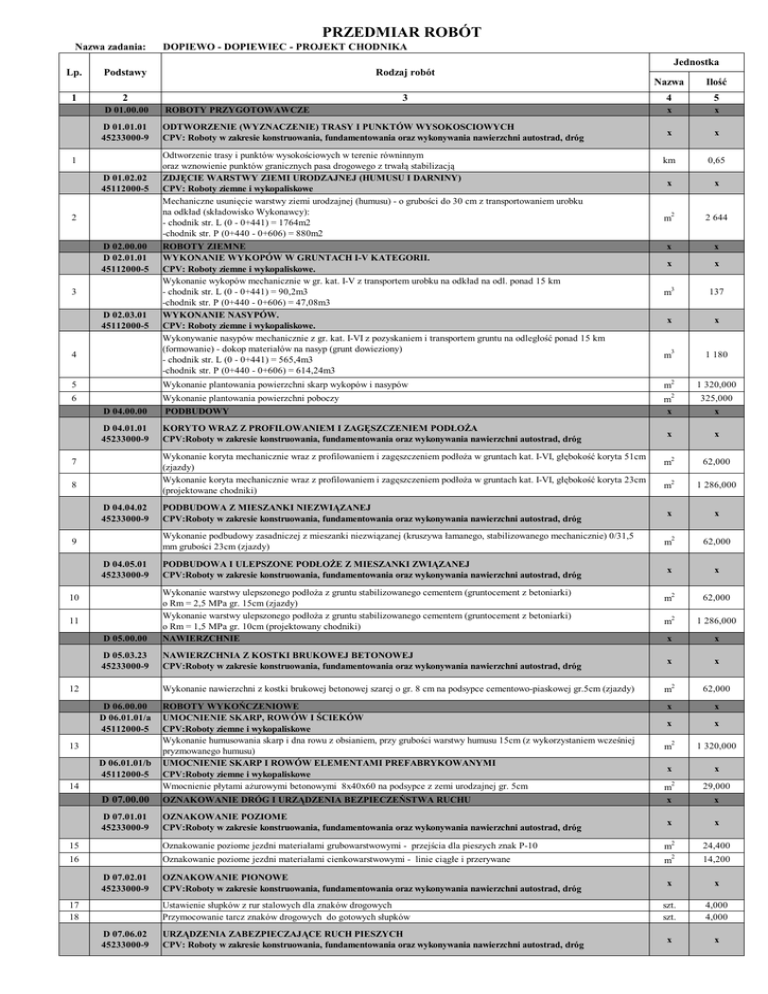 PRZEDMIAR ROBÓT Nazwa zadania: DOPIEWO - DOPIEWIEC - PROJEKT CHODNIKA Jednostka Lp. Podstawy Rodzaj robót 1 2 3 D 01.00.00 D 01.01.01 45233000-9 1 D 01.02.02 45112000-5 2 D 02.00.00 D 02.01.01 45112000-5 3 D 02.03.01 45112000-5 4 Nazwa Ilość 4 5 ROBOTY PRZYGOTOWAWCZE x x ODTWORZENIE (WYZNACZENIE) TRASY I PUNKTÓW WYSOKOSCIOWYCH CPV: Roboty w zakresie konstruowania, fundamentowania oraz wykonywania nawierzchni autostrad, dróg x x km 0,65 x x m2 2 644 x x x x m3 137 x x m3 1 180 Odtworzenie trasy i punktów wysokościowych w terenie równinnym oraz wznowienie punktów granicznych pasa drogowego z trwałą stabilizacją ZDJĘCIE WARSTWY ZIEMI URODZAJNEJ (HUMUSU I DARNINY) CPV: Roboty ziemne i wykopaliskowe Mechaniczne usunięcie warstwy ziemi urodzajnej (humusu) - o grubości do 30 cm z transportowaniem urobku na odkład (składowisko Wykonawcy): - chodnik str. L (0 - 0+441) = 1764m2 -chodnik str. P (0+440 - 0+606) = 880m2 ROBOTY ZIEMNE WYKONANIE WYKOPÓW W GRUNTACH I-V KATEGORII. CPV: Roboty ziemne i wykopaliskowe. Wykonanie wykopów mechanicznie w gr. kat. I-V z transportem urobku na odkład na odl. ponad 15 km - chodnik str. L (0 - 0+441) = 90,2m3 -chodnik str. P (0+440 - 0+606) = 47,08m3 WYKONANIE NASYPÓW. CPV: Roboty ziemne i wykopaliskowe. Wykonywanie nasypów mechanicznie z gr. kat. I-VI z pozyskaniem i transportem gruntu na odległość ponad 15 km (formowanie) - dokop materiałów na nasyp (grunt dowieziony) - chodnik str. L (0 - 0+441) = 565,4m3 -chodnik str. P (0+440 - 0+606) = 614,24m3 5 Wykonanie plantowania powierzchni skarp wykopów i nasypów m2 1 320,000 6 D 04.00.00 Wykonanie plantowania powierzchni poboczy PODBUDOWY m2 x 325,000 x D 04.01.01 45233000-9 KORYTO WRAZ Z PROFILOWANIEM I ZAGĘSZCZENIEM PODŁOŻA CPV:Roboty w zakresie konstruowania, fundamentowania oraz wykonywania nawierzchni autostrad, dróg x x m2 62,000 m2 1 286,000 PODBUDOWA Z MIESZANKI NIEZWIĄZANEJ CPV:Roboty w zakresie konstruowania, fundamentowania oraz wykonywania nawierzchni autostrad, dróg x x Wykonanie podbudowy zasadniczej z mieszanki niezwiązanej (kruszywa łamanego, stabilizowanego mechanicznie) 0/31,5 mm grubości 23cm (zjazdy) m2 62,000 D 04.05.01 45233000-9 PODBUDOWA I ULEPSZONE PODŁOŻE Z MIESZANKI ZWIĄZANEJ CPV:Roboty w zakresie konstruowania, fundamentowania oraz wykonywania nawierzchni autostrad, dróg x x m2 62,000 m2 1 286,000 D 05.00.00 Wykonanie warstwy ulepszonego podłoża z gruntu stabilizowanego cementem (gruntocement z betoniarki) o Rm = 2,5 MPa gr. 15cm (zjazdy) Wykonanie warstwy ulepszonego podłoża z gruntu stabilizowanego cementem (gruntocement z betoniarki) o Rm = 1,5 MPa gr. 10cm (projektowany chodniki) NAWIERZCHNIE x x D 05.03.23 45233000-9 NAWIERZCHNIA Z KOSTKI BRUKOWEJ BETONOWEJ CPV:Roboty w zakresie konstruowania, fundamentowania oraz wykonywania nawierzchni autostrad, dróg x x Wykonanie nawierzchni z kostki brukowej betonowej szarej o gr. 8 cm na podsypce cementowo-piaskowej gr.5cm (zjazdy) m2 62,000 Wykonanie koryta mechanicznie wraz z profilowaniem i zagęszczeniem podłoża w gruntach kat. I-VI, głębokość koryta 51cm (zjazdy) Wykonanie koryta mechanicznie wraz z profilowaniem i zagęszczeniem podłoża w gruntach kat. I-VI, głębokość koryta 23cm (projektowane chodniki) 7 8 D 04.04.02 45233000-9 9 10 11 12 D 06.00.00 D 06.01.01/a 45112000-5 13 D 06.01.01/b 45112000-5 14 ROBOTY WYKOŃCZENIOWE UMOCNIENIE SKARP, ROWÓW I ŚCIEKÓW CPV:Roboty ziemne i wykopaliskowe Wykonanie humusowania skarp i dna rowu z obsianiem, przy grubości warstwy humusu 15cm (z wykorzystaniem wcześniej pryzmowanego humusu) UMOCNIENIE SKARP I ROWÓW ELEMENTAMI PREFABRYKOWANYMI CPV:Roboty ziemne i wykopaliskowe Wmocnienie płytami ażurowymi betonowymi 8x40x60 na podsypce z zemi urodzajnej gr. 5cm x x x x m2 1 320,000 x x 2 m x 29,000 OZNAKOWANIE POZIOME CPV:Roboty w zakresie konstruowania, fundamentowania oraz wykonywania nawierzchni autostrad, dróg x x 15 Oznakowanie poziome jezdni materiałami grubowarstwowymi - przejścia dla pieszych znak P-10 m2 24,400 16 Oznakowanie poziome jezdni materiałami cienkowarstwowymi - linie ciągłe i przerywane m2 14,200 OZNAKOWANIE PIONOWE CPV:Roboty w zakresie konstruowania, fundamentowania oraz wykonywania nawierzchni autostrad, dróg x x szt. szt. 4,000 4,000 x x D 07.00.00 OZNAKOWANIE DRÓG I URZĄDZENIA BEZPIECZEŃSTWA RUCHU D 07.01.01 45233000-9 D 07.02.01 45233000-9 17 18 Ustawienie słupków z rur stalowych dla znaków drogowych Przymocowanie tarcz znaków drogowych do gotowych słupków D 07.06.02 45233000-9 URZĄDZENIA ZABEZPIECZAJĄCE RUCH PIESZYCH CPV: Roboty w zakresie konstruowania, fundamentowania oraz wykonywania nawierzchni autostrad, dróg x 19 D 08.00.00 Balustrada ochronna stalowa (z płaskowników) U-11a (h=1,10 m) ELEMENTY ULIC m x 617,000 x D 08.01.01 45233000-9 KRAWĘŻNIKI BETONOWE. CPV: Roboty w zakresie konstruowania, fundamentowania oraz wykonywania nawierzchni autostrad, dróg x x m 627,000 m 42,000 m 36,500 CHODNIKI Z BRUKOWEJ KOSTKI BETONOWEJ CPV:Roboty w zakresie konstruowania, fundamentowania oraz wykonywania nawierzchni autostrad, dróg x x Wykonanie nawierzchni chodników z kostki brukowej betonowej szarej grubości 8 cm na podsypce piaskowo-cementowej 4:1 gr. 5cm m2 1 294,000 D 08.03.01 45233000-9 OBRZEŻA BETONOWE CPV:Roboty w zakresie konstruowania, fundamentowania oraz wykonywania nawierzchni autostrad, dróg x x Ustawienie obrzeży betonowych o wymiarach 30x8cm na podsypce piaskowej ŚCIEKI Z PREFABRYKOWANYCH ELEMENTÓW BETONOWYCH CPV: Roboty pomocnicze w zakresie rurociągów i kabli m 1030,000 D 08.05.01 45232000-2 x x Wykonanie ścieku podchodnikowego z dwóch płyt ściekowych wg KPED k.01.03 Wykonanie ścieku skarpowego wg KPED k.01.11 m m 26,00 31,00 x x m 650,000 Krawężnik betonowy o wymiarach 20x30cm (wystający 12 cm) z wykonaniem ławy betonowej z oporem z betonu C12/15 na podsypce cementowo-piaskowej 1:4 gr. 5cm Krawężnik betonowy o wymiarach 20x30cm (obniżony 2 cm) z wykonaniem ławy