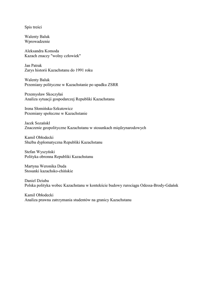 Spis treści Walenty Baluk Wprowadzenie Aleksandra Komoda Kazach znaczy "wolny człowiek" Jan Patrak Zarys historii Kazachstanu do 1991 roku Walenty Baluk Przemiany polityczne w Kazachstanie po upadku ZSRR Przemysław Skoczyłaś Analiza sytuacji gospodarczej Republiki Kazachstanu Irena Słomińska-Szkutowicz Przemiany społeczne w Kazachstanie Jacek Sozańskl Znaczenie geopolityczne Kazachstanu w stosunkach międzynarodowych Kamil Obłodecki SłuŜba dyplomatyczna Republiki Kazachstanu Stefan Wyszyński Polityka obronna Republiki Kazachstanu Martyna Weronika Duda Stosunki kazachsko-chińskie Daniel Dziuba Polska polityka wobec Kazachstanu w kontekście budowy rurociągu Odessa-Brody-Gdańsk Kamil Obłodecki Analiza prawna zatrzymania studentów na granicy Kazachstanu