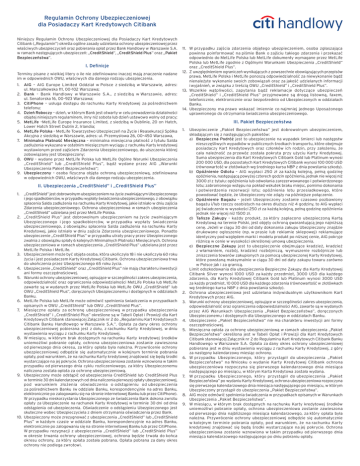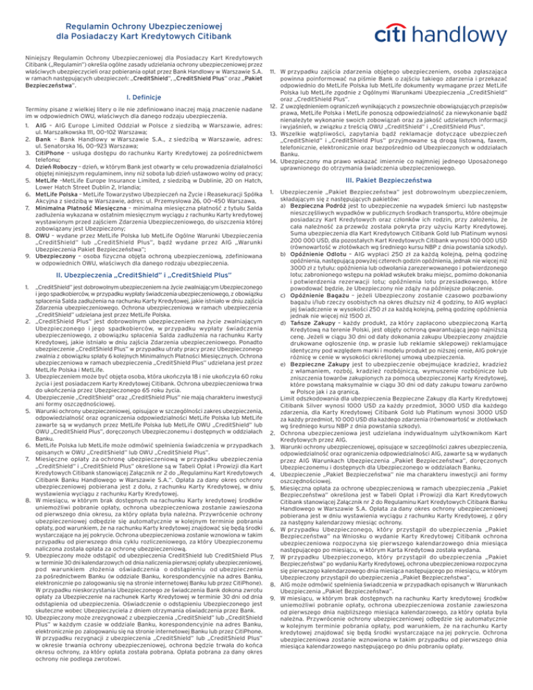 Regulamin Ochrony Ubezpieczeniowej dla Posiadaczy Kart Kredytowych Citibank Niniejszy Regulamin Ochrony Ubezpieczeniowej dla Posiadaczy Kart Kredytowych Citibank („Regulamin”) określa ogólne zasady udzielania ochrony ubezpieczeniowej przez właściwych ubezpieczycieli oraz pobierania opłat przez Bank Handlowy w Warszawie S.A. w ramach następujących ubezpieczeń: „CreditShield”, „CreditShield Plus” oraz „Pakiet Bezpieczeństwa”. I. Definicje Terminy pisane z wielkiej litery o ile nie zdefiniowano inaczej mają znaczenie nadane im w odpowiednich OWU, właściwych dla danego rodzaju ubezpieczenia. 1. AIG – AIG Europe Limited Oddział w Polsce z siedzibą w Warszawie, adres: ul. Marszałkowska 111, 00–102 Warszawa; 2. Bank – Bank Handlowy w Warszawie S.A., z siedzibą w Warszawie, adres: ul. Senatorska 16, 00–923 Warszawa; 3. CitiPhone – usługa dostępu do rachunku Karty Kredytowej za pośrednictwem telefonu; 4. Dzień Roboczy – dzień, w którym Bank jest otwarty w celu prowadzenia działalności objętej niniejszym regulaminem, inny niż sobota lub dzień ustawowo wolny od pracy; 5. MetLife –MetLife Europe Insurance Limited, z siedzibą w Dublinie, 20 on Hatch, Lower Hatch Street Dublin 2, Irlandia; 6. MetLife Polska – MetLife Towarzystwo Ubezpieczeń na Życie i Reasekuracji Spółka Akcyjna z siedzibą w Warszawie, adres: ul. Przemysłowa 26, 00–450 Warszawa, 7. Minimalna Płatność Miesięczna – minimalna miesięczna płatność z tytułu Salda zadłużenia wykazana w ostatnim miesięcznym wyciągu z rachunku Karty kredytowej wystawionym przed zajściem Zdarzenia Ubezpieczeniowego, do uiszczenia której zobowiązany jest Ubezpieczony; 8. OWU – wydane przez MetLife Polska lub MetLife Ogólne Warunki Ubezpieczenia „CreditShield” lub „CreditShield Plus”, bądź wydane przez AIG „Warunki Ubezpieczenia Pakiet Bezpieczeństwa”; 9. Ubezpieczony – osoba fizyczna objęta ochroną ubezpieczeniową, zdefiniowana w odpowiednich OWU, właściwych dla danego rodzaju ubezpieczenia. II. Ubezpieczenia „CreditShield” i „CreditShield Plus” 1. „CreditShield” jest dobrowolnym ubezpieczeniem na życie zwalniającym Ubezpieczonego i jego spadkobierców, w przypadku wypłaty świadczenia ubezpieczeniowego, z obowiązku spłacenia Salda zadłużenia na rachunku Karty Kredytowej, jakie istniało w dniu zajścia Zdarzenia ubezpieczeniowego. Ochrona ubezpieczeniowa w ramach ubezpieczenia „CreditShield” udzielana jest przez MetLife Polska. 2. „CreditShield Plus” jest dobrowolnym ubezpieczeniem na życie zwalniającym Ubezpieczonego i jego spadkobierców, w przypadku wypłaty świadczenia ubezpieczeniowego, z obowiązku spłacenia Salda zadłużenia na rachunku Karty Kredytowej, jakie istniało w dniu zajścia Zdarzenia ubezpieczeniowego. Ponadto ubezpieczenie „CreditShield Plus” w przypadku utraty pracy przez Ubezpieczonego zwalnia z obowiązku spłaty 6 kolejnych Minimalnych Płatności Miesięcznych. Ochrona ubezpieczeniowa w ramach ubezpieczenia „CreditShield Plus” udzielana jest przez MetLife Polska i MetLife. 3. Ubezpieczeniem może być objęta osoba, która ukończyła 18 i nie ukończyła 60 roku życia i jest posiadaczem Karty Kredytowej Citibank. Ochrona ubezpieczeniowa trwa do ukończenia przez Ubezpieczonego 65 roku życia. 4. Ubezpieczenie „CreditShield” oraz „CreditShield Plus” nie mają charakteru inwestycji ani formy oszczędnościowej. 5. Warunki ochrony ubezpieczeniowej, opisujące w szczególności zakres ubezpieczenia, odpowiedzialność oraz ograniczenia odpowiedzialności MetLife Polska lub MetLife zawarte są w wydanych przez MetLife Polska lub MetLife OWU „CreditShield” lub OWU „CreditShield Plus”, doręczonych Ubezpieczonemu i dostępnych w oddziałach Banku. 6. MetLife Polska lub MetLife może odmówić spełnienia świadczenia w przypadkach opisanych w OWU „CreditShield” lub OWU „CreditShield Plus”. 7. Miesięczne opłaty za ochronę ubezpieczeniową w przypadku ubezpieczenia „CreditShield” i „CreditShield Plus” określone są w Tabeli Opłat i Prowizji dla Kart Kredytowych Citibank stanowiącej Załącznik nr 2 do „Regulaminu Kart Kredytowych Citibank Banku Handlowego w Warszawie S.A.”. Opłata za dany okres ochrony ubezpieczeniowej pobierana jest z dołu, z rachunku Karty Kredytowej, w dniu wystawienia wyciągu z rachunku Karty Kredytowej. 8. W miesiącu, w którym brak dostępnych na rachunku Karty kredytowej środków uniemożliwi pobranie opłaty, ochrona ubezpieczeniowa zostanie zawieszona od pierwszego dnia okresu, za który opłata była należna. Przywrócenie ochrony ubezpieczeniowej odbędzie się automatycznie w kolejnym terminie pobrania opłaty, pod warunkiem, że na rachunku Karty kredytowej znajdować się będą środki wystarczające na jej pokrycie. Ochrona ubezpieczeniowa zostanie wznowiona w takim przypadku od pierwszego dnia cyklu rozliczeniowego, za który Ubezpieczonemu naliczona została opłata za ochronę ubezpieczeniową. 9. Ubezpieczony może odstąpić od ubezpieczenia CreditShield lub CreditShield Plus w terminie 30 dni kalendarzowych od dnia naliczenia pierwszej opłaty ubezpieczeniowej, pod warunkiem złożenia oświadczenia o odstąpieniu od ubezpieczenia za pośrednictwem Banku (w oddziale Banku, korespondencyjnie na adres Banku, elektronicznie po zalogowaniu się na stronie internetowej Banku lub przez CitiPhone). W przypadku nieskorzystania Ubezpieczonego ze świadczenia Bank dokona zwrotu opłaty za Ubezpieczenie na rachunek Karty Kredytowej w terminie 30 dni od dnia odstąpienia od ubezpieczenia. Oświadczenie o odstąpieniu Ubezpieczonego jest skuteczne wobec Ubezpieczyciela z dniem otrzymania oświadczenia przez Bank. 10. Ubezpieczony może zrezygnować z ubezpieczenia „CreditShield” lub „CreditShield Plus” w każdym czasie w oddziale Banku, korespondencyjnie na adres Banku, elektronicznie po zalogowaniu się na stronie