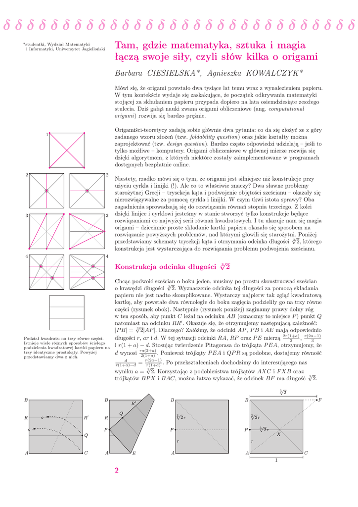 δδδδδδδδδδδδδδδδδδδδδδδδδδδδδδ *studentki, Wydział Matematyki i Informatyki, Uniwersytet Jagielloński Tam, gdzie matematyka, sztuka i magia łączą swoje siły, czyli słów kilka o origami Barbara CIESIELSKA*, Agnieszka KOWALCZYK* Mówi się, że origami powstało dwa tysiące lat temu wraz z wynalezieniem papieru. W tym kontekście wydaje się zaskakujące, że początek odkrywania matematyki stojącej za składaniem papieru przypada dopiero na lata osiemdziesiąte zeszłego stulecia. Dziś gałąź nauki zwana origami obliczeniowe (ang. computational origami ) rozwija się bardzo prężnie. Origamiści-teoretycy zadają sobie głównie dwa pytania: co da się złożyć ze z góry zadanego wzoru złożeń (tzw. foldability question) oraz jakie kształty można zaprojektować (tzw. design question). Bardzo często odpowiedzi udzielają – jeśli to tylko możliwe – komputery. Origami obliczeniowe w głównej mierze rozwija się dzięki algorytmom, z których niektóre zostały zaimplementowane w programach dostępnych bezpłatnie online. Niestety, rzadko mówi się o tym, że origami jest silniejsze niż konstrukcje przy użyciu cyrkla i linijki (!). Ale co to właściwie znaczy? Dwa sławne problemy starożytnej Grecji – trysekcja kąta i podwojenie objętości sześcianu – okazały się nierozwiązywalne za pomocą cyrkla i linijki. W czym tkwi istota sprawy? Oba zagadnienia sprowadzają się do rozwiązania równań stopnia trzeciego. Z kolei dzięki linijce i cyrklowi jesteśmy w stanie stworzyć tylko konstrukcje będące rozwiązaniami co najwyżej serii równań kwadratowych. I tu ukazuje nam się magia origami – dziecinnie proste składanie kartki papieru okazało się sposobem na rozwiązanie powyższych problemów, nad którymi głowili się starożytni. √ Poniżej przedstawiamy schematy trysekcji kąta i otrzymania odcinka długości 3 2, którego konstrukcja jest wystarczająca do rozwiązania problemu podwojenia sześcianu. Konstrukcja odcinka długości Podział kwadratu na trzy równe części. Istnieje wiele różnych sposobów ścisłego podzielenia kwadratowej kartki papieru na trzy identyczne prostokąty. Powyżej przedstawiamy dwa z nich. √ 3 2 Chcąc podwoić sześcian √ o boku jeden, musimy po prostu skonstruować sześcian o krawędzi długości 3 2. Wyznaczenie odcinka tej długości za pomocą składania papieru nie jest nadto skomplikowane. Wystarczy najpierw tak zgiąć kwadratową kartkę, aby powstałe dwa równoległe do boku zagięcia podzieliły go na trzy równe części (rysunek obok). Następnie (rysunek poniżej) zaginamy prawy dolny róg w ten sposób, aby punkt C leżał na odcinku AB (oznaczmy to miejsce P ) punkt Q ′ natomiast √ na odcinku RR . Okazuje się, że otrzymujemy następującą zależność: |P B| = 3 2|AP |. Dlaczego? Załóżmy, że odcinki AP , P B i AE mają odpowiednio długości r, ar i d. W tej sytuacji odcinki RA, RP oraz P E mierzą 2r(1+a) , r(2a−1) 3 3 i r(1 + a) − d. Stosując twierdzenie Pitagorasa do trójkąta P EA, otrzymujemy, że d wynosi ra(2+a) 2(1+a) . Ponieważ trójkąty P EA i QP R są podobne, dostajemy równość d r(1+a)−d = r(2a−1) r(1+a) . √ 3 Po przekształceniach dochodzimy do interesującego nas wyniku a = 2. Korzystając z podobieństwa trójkątów AXC i F XB oraz √ trójkątów BP X i BAC, można łatwo wykazać, że odcinek BF ma długość 3 2. 2