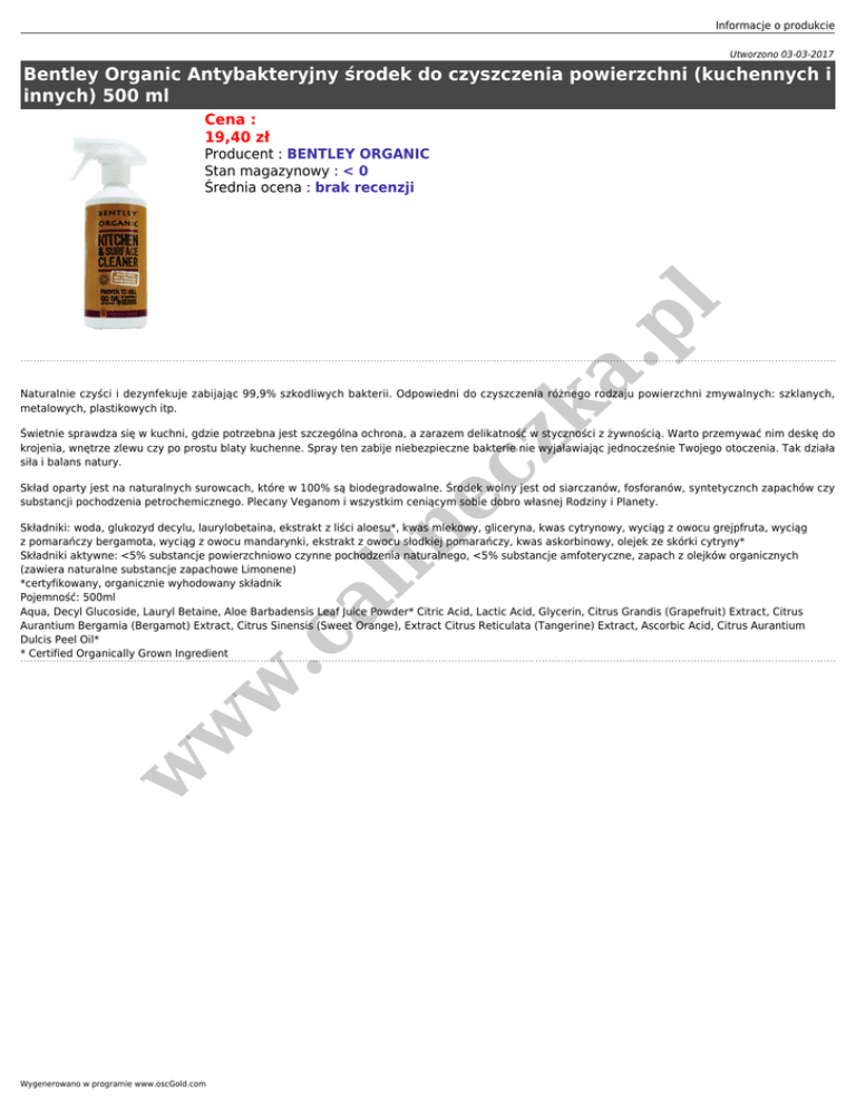 Informacje o produkcie Utworzono 03-03-2017 Bentley Organic Antybakteryjny środek do czyszczenia powierzchni (kuchennych i innych) 500 ml Cena : 19,40 zł zk a. pl Producent : BENTLEY ORGANIC Stan magazynowy : < 0 Średnia ocena : brak recenzji Naturalnie czyści i dezynfekuje zabijając 99,9% szkodliwych bakterii. Odpowiedni do czyszczenia różnego rodzaju powierzchni zmywalnych: szklanych, metalowych, plastikowych itp. ec Świetnie sprawdza się w kuchni, gdzie potrzebna jest szczególna ochrona, a zarazem delikatność w styczności z żywnością. Warto przemywać nim deskę do krojenia, wnętrze zlewu czy po prostu blaty kuchenne. Spray ten zabije niebezpieczne bakterie nie wyjaławiając jednocześnie Twojego otoczenia. Tak działa siła i balans natury. Skład oparty jest na naturalnych surowcach, które w 100% są biodegradowalne. Środek wolny jest od siarczanów, fosforanów, syntetycznch zapachów czy substancji pochodzenia petrochemicznego. Plecany Veganom i wszystkim ceniącym sobie dobro własnej Rodziny i Planety. w w w .c al in Składniki: woda, glukozyd decylu, laurylobetaina, ekstrakt z liści aloesu*, kwas mlekowy, gliceryna, kwas cytrynowy, wyciąg z owocu grejpfruta, wyciąg z pomarańczy bergamota, wyciąg z owocu mandarynki, ekstrakt z owocu słodkiej pomarańczy, kwas askorbinowy, olejek ze skórki cytryny* Składniki aktywne: <5% substancje powierzchniowo czynne pochodzenia naturalnego, <5% substancje amfoteryczne, zapach z olejków organicznych (zawiera naturalne substancje zapachowe Limonene) *certyfikowany, organicznie wyhodowany składnik Pojemność: 500ml Aqua, Decyl Glucoside, Lauryl Betaine, Aloe Barbadensis Leaf Juice Powder* Citric Acid, Lactic Acid, Glycerin, Citrus Grandis (Grapefruit) Extract, Citrus Aurantium Bergamia (Bergamot) Extract, Citrus Sinensis (Sweet Orange), Extract Citrus Reticulata (Tangerine) Extract, Ascorbic Acid, Citrus Aurantium Dulcis Peel Oil* * Certified Organically Grown Ingredient Wygenerowano w programie www.oscGold.com