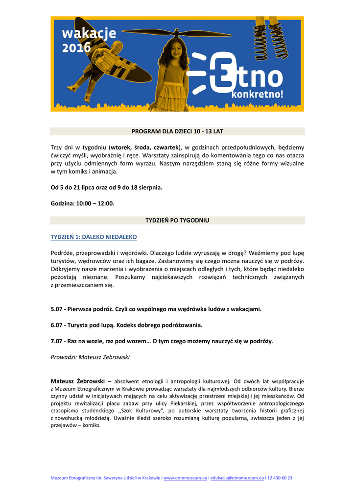 PROGRAM DLA DZIECI 10 - 13 LAT Trzy dni w tygodniu (wtorek, środa, czwartek), w godzinach przedpołudniowych, będziemy dwiczyd myśli, wyobraźnię i ręce. Warsztaty zainspirują do komentowania tego co nas otacza przy użyciu odmiennych form wyrazu. Naszym narzędziem staną się różne formy wizualne w tym komiks i animacja. Od 5 do 21 lipca oraz od 9 do 18 sierpnia. Godzina: 10:00 – 12:00. TYDZIEO PO TYGODNIU TYDZIEO 1: DALEKO NIEDALEKO Podróże, przeprowadzki i wędrówki. Dlaczego ludzie wyruszają w drogę? Weźmiemy pod lupę turystów, wędrowców oraz ich bagaże. Zastanowimy się czego można nauczyd się w podróży. Odkryjemy nasze marzenia i wyobrażenia o miejscach odległych i tych, które będąc niedaleko pozostają nieznane. Poszukamy najciekawszych rozwiązao technicznych związanych z przemieszczaniem się. 5.07 - Pierwsza podróż. Czyli co wspólnego ma wędrówka ludów z wakacjami. 6.07 - Turysta pod lupą. Kodeks dobrego podróżowania. 7.07 - Raz na wozie, raz pod wozem… O tym czego możemy nauczyd się w podróży. Prowadzi: Mateusz Żebrowski Mateusz Żebrowski – absolwent etnologii i antropologii kulturowej. Od dwóch lat współpracuje z Muzeum Etnograficznym w Krakowie prowadząc warsztaty dla najmłodszych odbiorców kultury. Bierze czynny udział w inicjatywach mających na celu aktywizację przestrzeni miejskiej i jej mieszkaoców. Od projektu rewitalizacji placu zabaw przy ulicy Piekarskiej, przez współtworzenie antropologicznego czasopisma studenckiego ,,Szok Kulturowy”, po autorskie warsztaty tworzenia historii graficznej z nowohucką młodzieżą. Uważnie śledzi szeroko rozumianą kulturę popularną, zwłaszcza jeden z jej przejawów – komiks. Muzeum Etnograficzne im. Seweryna Udzieli w Krakowie I www.etnomuzeum.eu I [email protected] I 12 430 60 23 TYDZIEO 2: WYNALAZKI NATURY Kryształy, jedwabniki i pancerze. Czego inżynier może nauczyd się od pszczoły i pająka? Przyjrzymy się strukturom, które z natury zostały przeniesione do techniki. Będziemy podglądad świat roślin i zwierząt w poszukiwaniu niezwykłych rozwiązao i bezkonkurencyjnych patentów. Damy się poprowadzid przyrodzie, która inspiruje. 12.07 - Jak pachnie zielone miasto? O ziołach, zapachu ziemi, kwiatów i skoszonej trawy. 13.07 - Czy miasto można zjeśd? O warzywach, jadalnych chwastach i miejskich uprawach. 14.07 - Czy z roślin można coś zbudowad? O poza-uprawnym, poza-medycznym i poza estetycznym wykorzystaniu roślin. Prowadzi: Magdalena Żyłka Magdalena Żyłka - architekt krajobrazu, rzemieślnik - ceramik i plecionkarz, instruktor rękodzieła artystycznego, animator kultury, arteterapeuta, współtwórczyni kolektywu ŻyWa Pracownia. Zajmuje się edukacją kulturalną, regionalną i ekologiczną, prowadzi działania społeczno-kulturalne na styku rzemiosła, sztuki, architektury, designu i miejskiego ogrodnictwa. Współpracuje z lokalnymi społecznościami, artystami, rzemieślnikami, instytucjami kultury, organizacjami pozarządowymi i placówkami terapeutycznymi. Od 4 lat koordynuje życie Ogrodu społecznego Poziomkowa Polana. TYDZIEO 3: SZTUCZKI SZTUKI Kształty, formy i faktury. Kto wynalazł sztukę i po co ona człowiekowi? Przyjrzymy się rzeczom ładnym, sztuce użytkowej i tradycyjnemu zdobnictwu z różnych stron świata. Dwiczyd będziemy ręce, oczy i myśli. Zastanowimy się co znaczy, że coś jest ładne. Pracując z różnymi materiałami i mediami rozbudzimy w sobie twórczy potencjał. 19.07 - Sztuka mieszkania. Zagadkowe wnętrza domów i ich mieszkaocy. 20.07 - Koronki i tatuaże. O funkcji wzorów, znaków i symboli w garderobie i na ciele. 21.07 - Czy kubek może byd dziełem sztuki? O sztuce użytkowej. Prowadzi: Nina Kulik Muzeum Etnograficzne im. Seweryna Udzieli w Krakowie I www.etnomuzeum.eu I [email protected] I 12 430 60 23 Nina Kulik - absolwentka animacji społeczno – kulturowej na Uniwersytecie Jagiellooskim. Edukatorka w Muzeum Etnograficznym w Krakowie. Od kilku lat prowadzi zajęcia edukacyjne dla dzieci, młodzieży i dorosłych we współpracy z krakowskim teatrem ulicznym „Teatr Jednej Miny”. TYDZIEO 4: NATURA WYNALAZKÓW Fascynujące maszyny i przełomowe wynalazki. Kto na to wszystko wpadł? Zgłębimy zdolnośd człowieka do wymyślania niezwykłych rozwiązao technicznych. Często niezwykłych w swej prostocie, ale też niezwykle skomplikowanych i złożonych. Przeprowadzimy serię fizycznych eksperymentów i nie poddamy się w szukaniu odpowiedzi na pytanie: Jak to działa? 9.08 - Sztuka zmiany. Galopem od wozu konnego po wóz pancerny. 10.08 - Kiedy należy zasypad studnie? O wynalazkach, które przeszkadzały. 11.08 - Od koła do plastra miodu. Czy potrzebujemy zmieniad przyrodę? Prowadzi: Mateusz Żebrowski Mateusz Żebrowski – absolwent etnologii i antropologii kulturowej. Od dwóch lat współpracuje z Muzeum Etnograficznym w Krakowie prowadząc warsztaty dla najmłodszych odbiorców kultury. Bierze czynny udział w inicjatywach mających na celu aktywizację przestrzeni miejskiej i jej mieszkaoców. Od projektu rewitalizacji placu zabaw przy ulicy Piekarskiej, przez współtworzenie antropologicznego czasopisma studenckiego ,,Szok Kulturowy”, po autorskie warsztaty tworzenia historii graficznej z nowohucką młodzieżą. Uważnie śledzi szeroko rozumianą kulturę popularną, zwłaszcza jeden z jej przejawów – komiks. TYDZIEO 5: (FU)TURYSTYKA Turystyka przyszłości i futurystyczne wizje. Czy podróże w czasie są możliwe? Zastanowimy się jaki wpływ mamy na to, co dopiero będzie i skąd czerpad wiedzę o tym, co może się zdarzyd. Postaramy się dowiedzied jak dawniej wyobrażano sobie XXI wiek. Na podstawie uważnych etnograficznych obserwacji przygotujemy wiadomośd o naszym świecie dla ludzi z przyszłości. Wyzwaniem będzie wymyślenie skutecznego sposobu jej doręczenia. 16.08 - W pogoni za cywilizacją. O szybkości zmian na świecie. 17.08 - Warsztaty z chom