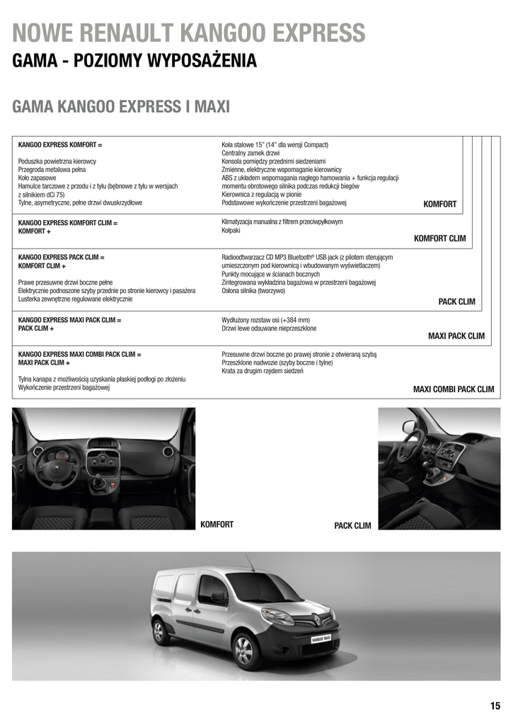 NOWE RENAULT KANGOO EXPRESS GAMA - POZIOMY WYPOSAŻENIA GAMA KANGOO EXPRESS I MAXI KANGOO EXPRESS KOMFORT = Poduszka powietrzna kierowcy Przegroda metalowa pełna Koło zapasowe Hamulce tarczowe z przodu i z tyłu (bębnowe z tyłu w wersjach z silnikiem dCi 75) Tylne, asymetryczne, pełne drzwi dwuskrzydłowe Koła stalowe 15” (14” dla wersji Compact) Centralny zamek drzwi Konsola pomiędzy przednimi siedzeniami Zmienne, elektryczne wspomaganie kierownicy ABS z układem wspomagania nagłego hamowania + funkcja regulacji momentu obrotowego silnika podczas redukcji biegów Kierownica z regulacją w pionie Podstawowe wykończenie przestrzeni bagażowej KANGOO EXPRESS KOMFORT CLIM = KOMFORT + Klimatyzacja manualna z filtrem przeciwpyłkowym Kołpaki KANGOO EXPRESS PACK CLIM = KOMFORT CLIM + Radioodtwarzacz CD MP3 Bluetooth® USB jack (z pilotem sterującym umieszczonym pod kierownicą i wbudowanym wyświetlaczem) Punkty mocujące w ścianach bocznych Zintegrowana wykładzina bagażowa w przestrzeni bagażowej Osłona silnika (tworzywo) Prawe przesuwne drzwi boczne pełne Elektrycznie podnoszone szyby przednie po stronie kierowcy i pasażera Lusterka zewnętrzne regulowane elektrycznie KOMFORT CLIM PACK CLIM KANGOO EXPRESS MAXI PACK CLIM = PACK CLIM + Wydłużony rozstaw osi (+384 mm) Drzwi lewe odsuwane nieprzeszklone KANGOO EXPRESS MAXI COMBI PACK CLIM = MAXI PACK CLIM + Przesuwne drzwi boczne po prawej stronie z otwieraną szybą Przeszklone nadwozie (szyby boczne i tylne) Krata za drugim rzędem siedzeń Tylna kanapa z możliwością uzyskania płaskiej podłogi po złożeniu Wykończenie przestrzeni bagażowej KOMFORT MAXI PACK CLIM MAXI COMBI PACK CLIM KOMFORT PACK CLIM 15 NOWE RENAULT KANGOO EXPRESS GAMA - WYPOSAŻENIE KOLORY NADWOZIA Każda wersja Nowego Kangoo pojawi się w innej barwie nadwozia w chwili wprowadzenia modelu na rynek. I tak, kolorem lakieru debiutu rynkowego Nowego Kangoo Express będzie Jasny Srebrny. BIAŁY MINERAL (1) CZERWIEŃ CARMEN (1) SZARY TAUPE (1) BŁĘKIT GWIAZD (2) BRĄZOWY MOKA (2) JASNY SREBRNY (2) SZARY KASJOPEA (2) CZARNY METAL (2) (1) : lakier niemetalizowany (2) : lakier metalizowany ZAPAMIĘTAJ: Lakiery Biały Mineral oraz Jasny Srebrny są nowymi barwami oferowanymi również w samochodzie Mercedes Citan. KOŁPAKI I OBRĘCZE KÓŁ KOMFORT KOMFORT CLIM PACK CLIM L0 L1 L1 L1 L2 Kołpaki Bol 14" S - - - - Kołpaki Bol 15" - S - - - Kołpaki Kirov 14" O - - - - Kołpaki kół Brigantin 15" - O S S S WIĘCEJ O WZAJEMNYM UZUPEŁNIANIU SIĘ OFERTY KANGOO I DACII DOKKER VAN Filozofią Dacii jest oferowanie funkcjonalnych, solidnych i niezawodnych pojazdów w konkurencyjnej cenie. Dacia Dokker Van jest oszczędną alternatywą dla Nowego Kangoo Express, jednakże nie oferującą najnowszych rozwiązań technologicznych. Natomiast w Nowym Kangoo Express zastosowano najnowocześniejsze metody montażu i uzyskano najwyższy poziom jakości postrzeganej. Ponadto oferta Nowego Kangoo Express jest znacznie szersza i lepiej przystosowana do zabudów i modyfikacji specjalistycznych. 16