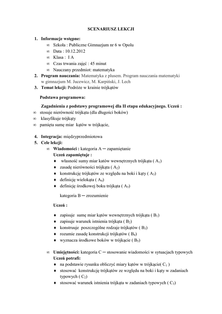 SCENARIUSZ LEKCJI 1. Informacje wstępne: • Szkoła : Publiczne Gimnazjum nr 6 w Opolu • Data : 10.12.2012 • Klasa : I A • Czas trwania zajęć : 45 minut • Nauczany przedmiot: matematyka 2. Program nauczania: Matematyka z plusem. Program nauczania matematyki w gimnazjum M. Jucewicz, M. Karpiński, J. Lech 3. Temat lekcji: Podróże w krainie trójkątów Podstawa programowa: • • • Zagadnienia z podstawy programowej dla II etapu edukacyjnego. Uczeń : stosuje nierówność trójkąta (dla długości boków) klasyfikuje trójkąty pamięta sumę miar kątów w trójkącie, 4. Integracja: międzyprzedmiotowa 5. Cele lekcji: • Wiadomości : kategoria A ─ zapamiętanie Uczeń zapamiętuje : ♦ własność sumy miar katów wewnętrznych trójkąta ( A1) ♦ zasadę nierówności trójkąta ( A2) ♦ konstrukcję trójkątów ze względu na boki i kąty ( A3) ♦ definicję wielokąta ( A4) ♦ definicję środkowej boku trójkąta ( A5) kategoria B ─ zrozumienie Uczeń : ♦ ♦ ♦ ♦ ♦ • zapisuje sumę miar kątów wewnętrznych trójkąta ( B1) zapisuje warunek istnienia trójkąta ( B2) konstruuje poszczególne rodzaje trójkątów ( B3) rozumie zasadę konstrukcji trójkątów ( B4) wyznacza środkowe boków w trójkącie ( B5) Umiejętności: kategoria C ─ stosowanie wiadomości w sytuacjach typowych Uczeń potrafi: ♦ na podstawie rysunku obliczyć miary kątów w trójkącie( C1 ) ♦ stosować konstrukcję trójkątów ze względu na boki i kąty w zadaniach typowych ( C2) ♦ stosować warunek istnienia trójkąta w zadaniach typowych ( C3) ♦ wyznaczyć środek ciężkości trójkąta ( C4) kategoria D ─ stosowanie wiadomości w sytuacjach problemowych ♦ Uczeń stosuje zależności między bokami i kątami w trójkącie podczas rozwiązywania zadań tekstowych ( D1) • Postawy i zainteresowania: ♦ Wyrabianie systematyczności w rozwiązywaniu zadań z trójkątów ♦ Kształtowanie wytrwałości w zdobywaniu wiedzy i umiejętności matematycznych ♦ Rozwijanie umiejętności pracy w zespole klasowym ♦ Motywowanie uczniów do kreatywności i samodzielności ♦ Kształtowanie postawy dialogu i kultury dyskusji ( komunikacji ) ♦ Dbanie o estetykę : jasne i przejrzyste rozwiązanie zadań 6. Strategie nauczania : • strategia asocjacyjna (kojarzenie) – uczenie się poprzez przyswajanie gotowej wiedzy ( A ) • strategia podająca ( P ) 7. Metody nauczania: • Pogadanka ( M1 ) • Burza mózgów( M2 ) • Metoda ćwiczeń ( M3 ) 8. Zasady nauczania: • Zasada przystępności • Zasada świadomego i aktywnego uczestnictwa • Zasada łączenia teorii z praktyką 9. Formy pracy uczniów: • Praca zespołowa • Praca w grupach : grupy dwuosobowe : uczniowie siedzący w jednej ławce 10. Środki dydaktyczne: • Tablica interaktywna • Prezentacja multimedialna • podręcznik 11. Wykaz piśmiennictwa : • Dla nauczyciela: ♦ Matematyka 1, podręcznik : gimnazjum pod red Małgorzaty Dobrowolskiej, GWO, 2009 ♦ Zasady nauczania matematyki, F.Urbańczyk • Dla ucznia : ♦ Matematyka 1, podręcznik : gimnazjum pod red Małgorzaty Dobrowolskiej, GWO, 2009 12. Organizacja zajęć lekcyjnych ( struktura lekcji ) Etapy / fazy lekcji Zagadnienia,zadania, problemy lekcji Faza wstępna Prezentacja multimedialna dotycząca klasyfikacji trójkątów. Faza realizacyjna Zadanie wynikające z prezentacji Wyznaczanie środka ciężkości trójkąta Faza podsumowująca Sposoby Realizacji Zagadnień Zadań problemów Zapisanie tematu i zapoznanie uczniów z celami lekcji Omawianie własności trójkątów ukazujących się w kolejnych slajdach. Uczniowie rozwiązują zadanie dotyczące wyznaczania miary kątów wewnętrznych trójkąta. Uczniowie otrzymują trójkąty, w których wyznaczają środkowe boków trójkąta. Punkt przecięcia się środkowych to środek ciężkości trójkąta. Zadanie 1 str.106 Zadanie 7 str. 106 Poszczególni uczniowie rozwiązują zadania. Podsumowanie zajęć Pytania sprawdzające stopień opanowania wiadomości o trójkątach przewidzianych w tej części programu w formie krzyżówki. Ocena pracy uczniów Spełnienie Założonych Celów lekcji Uwagi o realizacji A1─ A4, B1─ B4 Prezentacja w załączeniu M1, M2, A Zadanie w załączeniu C1, D1, B1, A1 M3 A5, B5, C4 C3, D1 C2, C1, D1 A2, B2 , B1, B3,B4 korelacja międzyprzedmiotowa z fizyką Zadania w załączeniu Krzyżówka w załączeniu Zadanie zadania domowego : zadanie 4,5 str.106 Opracowała : Agnieszka Tomalak PG 6 Opole Załącznik 1 Zadanie 1 str.106 Czy boki trójkąta mogą mieć podane poniżej długości : a) 5 cm, 7 cm, 6 cm c ) 70 cm, 0,7 m , 1 cm. Zadanie 7 str.106 a) Kąt między ramionami trójkąta równoramiennego ma 1700. Jakie są miary pozostałych kątów? b) Jakie kąty ma trójkąt równoramienny prostokątny? KRZYŻÓWKA Sformułuj pytania do krzyżówki O P K L A S Y F R Z Y P R R O O I W S Z K Y T W T A S O A S Ś R C O K R T R Ó J K Ą T R O J A O T Y O D K K K Ą Ś N Ć A Ą O T T W N A Y Opracowała : Agnieszka Tomalak PG 6 Opole