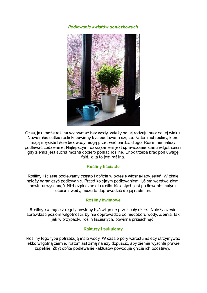 Podlewanie kwiatów doniczkowych Czas, jaki może roślina wytrzymać bez wody, zależy od jej rodzaju oraz od jej wieku. Nowe młodziutkie roślinki powinny być podlewane często. Natomiast rośliny, które mają mięsiste liście bez wody mogą przetrwać bardzo długo. Roślin nie należy podlewać codziennie. Najlepszym rozwiązaniem jest sprawdzanie stanu wilgotności i gdy ziemia jest sucha można dopiero podlać roślinę. Choć trzeba brać pod uwagę fakt, jaka to jest roślina. Rośliny liściaste Rośliny liściaste podlewamy często i obficie w okresie wiosna-lato-jesień. W zimie należy ograniczyć podlewanie. Przed kolejnym podlewaniem 1,5 cm warstwa ziemi powinna wyschnąć. Niebezpieczne dla roślin liściastych jest podlewanie małymi ilościami wody, może to doprowadzić do jej nadmiaru. Rośliny kwiatowe Rośliny kwitnące z reguły powinny być wilgotne przez cały okres. Należy często sprawdzać poziom wilgotności, by nie doprowadzić do niedoboru wody. Ziemia, tak jak w przypadku roślin liściastych, powinna przeschnąć. Kaktusy i sukulenty Rośliny tego typu potrzebują mało wody. W czasie pory wzrostu należy utrzymywać lekko wilgotną ziemie. Natomiast zimą należy dopuścić, aby ziemia wyschła prawie zupełnie. Zbyt obfite podlewanie kaktusów powoduje gnicie ich podstawy.