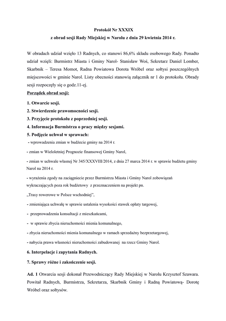 Protokół Nr XXXIX z obrad sesji Rady Miejskiej w Narolu z dnia 29 kwietnia 2014 r. W obradach udział wzięło 13 Radnych, co stanowi 86,6% składu osobowego Rady. Ponadto udział wzięli: Burmistrz Miasta i Gminy Narol- Stanisław Woś, Sekretarz Daniel Lomber, Skarbnik – Teresa Momot, Radna Powiatowa Dorota Wróbel oraz sołtysi poszczególnych miejscowości w gminie Narol. Listy obecności stanowią załącznik nr 1 do protokołu. Obrady sesji rozpoczęły się o godz.11-ej. Porządek obrad sesji: 1. Otwarcie sesji. 2. Stwierdzenie prawomocności sesji. 3. Przyjęcie protokołu z poprzedniej sesji. 4. Informacja Burmistrza o pracy między sesjami. 5. Podjęcie uchwał w sprawach: - wprowadzenia zmian w budżecie gminy na 2014 r. - zmian w Wieloletniej Prognozie finansowej Gminy Narol, - zmian w uchwale własnej Nr 345/XXXVIII/2014, z dnia 27 marca 2014 r. w sprawie budżetu gminy Narol na 2014 r. - wyrażenia zgody na zaciągniecie przez Burmistrza Miasta i Gminy Narol zobowiązań wykraczających poza rok budżetowy z przeznaczeniem na projekt pn. „Trasy rowerowe w Polsce wschodniej”, - zmieniająca uchwałę w sprawie ustalenia wysokości stawek opłaty targowej, - przeprowadzenia konsultacji z mieszkańcami, - w sprawie zbycia nieruchomości mienia komunalnego, - zbycia nieruchomości mienia komunalnego w ramach sprzedażny bezprzetargowej, - nabycia prawa własności nieruchomości zabudowanej na rzecz Gminy Narol. 6. Interpelacje i zapytania Radnych. 7. Sprawy różne i zakończenie sesji. Ad. 1 Otwarcia sesji dokonał Przewodniczący Rady Miejskiej w Narolu Krzysztof Szawara. Powitał Radnych, Burmistrza, Sekretarza, Skarbnik Gminy i Radną Powiatową- Dorotę Wróbel oraz sołtysów. Ad. 2 Przewodniczący obrad stwierdził prawomocność sesji w oparciu o listę obecności (zał. nr 1). Ad. 3 Protokół z poprzedniej sesji został przyjęty jednogłośnie. Ad.4 Informację o pracy między sesjami złożył Burmistrz Stanisław Woś, który poinformował cyt.:„ostatnia sesja zwyczajna miała miejsce 27 marca 2014 r. Od tego czasu odbyło się posiedzenie Konwentu, w dniu 24 kwietnia 2014, na którym przedstawiłem projekty uchwał na dzisiejszą sesję. Ważnym powodem zwołania sesji jest zmiana w organizacji wniosku, złożonego przez Województwo Podkarpackie dotycząca tras rowerowych, na ścianie wschodniej. Po audycie wewnętrznym głównego beneficjenta, wyszło to, że nie będą mogli realizować tego projektu ponieważ bezpośrednio z trwałością projektu później wiążą się koszty utrzymania tych tras. Wymyślono inną formułę. Beneficjent otrzyma środki, my jako partnerzy będziemy na terenie swoim realizować to zadanie poprzez: nadzór wykonawcy, przyjęcie faktury i zapłacenie tej faktury. W związku z powyższym tą część, która jest po stronie gminy musimy przyjąć do budżetu jako wydatek kwalifikowany i ten wydatek w stu procentach otrzymamy z Urzędu Marszałkowskiego, z chwilą, kiedy zgłosimy im wniosek o płatność. Natomiast wydatki niekwalifikowane, bo takie mamy w tym projekcie, chodzi o drogę w Hucie - Złomy (od krzyżówki z drogą powiatową do krzyżówki z drogą Starej Huty), tutaj musimy wyłożyć środki na poszerzenie tej drogi. Czas realizacji tego zadania wypada na rok bieżący i rok przyszły, dlatego jeśli Rada podejmie taką decyzję w trybie pilnym musimy zadanie wprowadzić do wieloletniej prognozy finansowej i w ślad za tym musimy podpisać aneks do umowy i przesłać go do Podkarpackiego Urzędu Marszałkowskiego. W miejscowości Huta Różaniecka w chwili obecnej wykonywany jest odwiert trzeci studni głębinowej. Najstarszy odwiert jest do likwidacji, wystąpimy do Starostwa o zgodę na likwidację studni. Nie możemy pracować na jednym ujęciu wody. Musimy mieć ujęcie zapasowe. Na dzisiejszej sesji przedstawiam projekt zmian w budżecie, aby zabezpieczyć środki na wykonanie dokumentacji i budowę nowej studni. Przykro to powiedzieć, ale przez przemieszczenie gruntów, przez sytuację od nas niezależną tracimy, ponad 100 tys. złotych. Rozstrzygnęliśmy przetarg na budowę drogi z Narola do Lipia. Przetarg wygrało Tomaszowskie Przedsiębiorstwo Robót Drogowych. Starostwo Powiatowe w Lubaczowie przeprowadziło przetarg na drogę do Bieniaszówki. Przetarg wygrało również Tomaszowskie Przedsiębiorstwo Robót Drogowych. W obu przypadkach mieścimy się w cenie, która przewidziana była jako wartość kosztorysu inwestorskiego. Zleciliśmy firmie projektowej wykonanie dziesięciu małych projektów na drogi gminne. Drogi gminne są w złym stanie, sytuacja jest nam dokładnie znana. W PRO-wie na lata 2014-2020 będzie można wnioskować o dofinansowanie na drogi gminne. Jest przewidziana kwota na gminę, beneficjenta 3 miliony złotych, a dofinansowanie będzie 63.63%.Tutaj jest nadzieja, że wszystkie drogi lokalne będziemy mogli wyremontować w masie bitumicznej. Rozstrzygnięty jest przetarg na budowę dwóch placów zabaw w Woli Wielkiej i Płazowie i dwa boiska sportowe w Rudzie Różanieckiej i w Narolu-Wsi. Przetarg wygrała firma Praktibud z Tomaszowa Lubelskiego. Otrzymaliśmy dofinansowanie w kwocie 637 tys. zł w ramach programu Biblioteka Plus, na modernizację pomieszczeń przejętej szkoły od Parafii Narol. Wartość projektu wynosi 849 tys. złotych. Zadanie rozłożone jest na dwa lata. Nie ogłosiliśmy jeszcze przetargu na remont i wyposażenie budynków świetlic wiejskich w miejscowościach Chlewiska, Łukawica, Wola Wielka, ma być uszczegółowienie ze strony firmy projektowych, ale myślę, że już w niedługim czasie przetarg będzie zamieszczony w naszym biuletynie informacji publicznej. Wspólnie z Przewodniczącym Rady byliśmy w Słowacji na spotkaniu studyjnym, bo jakiś czas temu informowałem Państwa o zamiarze budowy zakładu do zagospodarowania odpadów. Urząd Marszałkowski, Departament Ochrony Środowiska, postawił nam ultimatum że jeśli jesteśmy