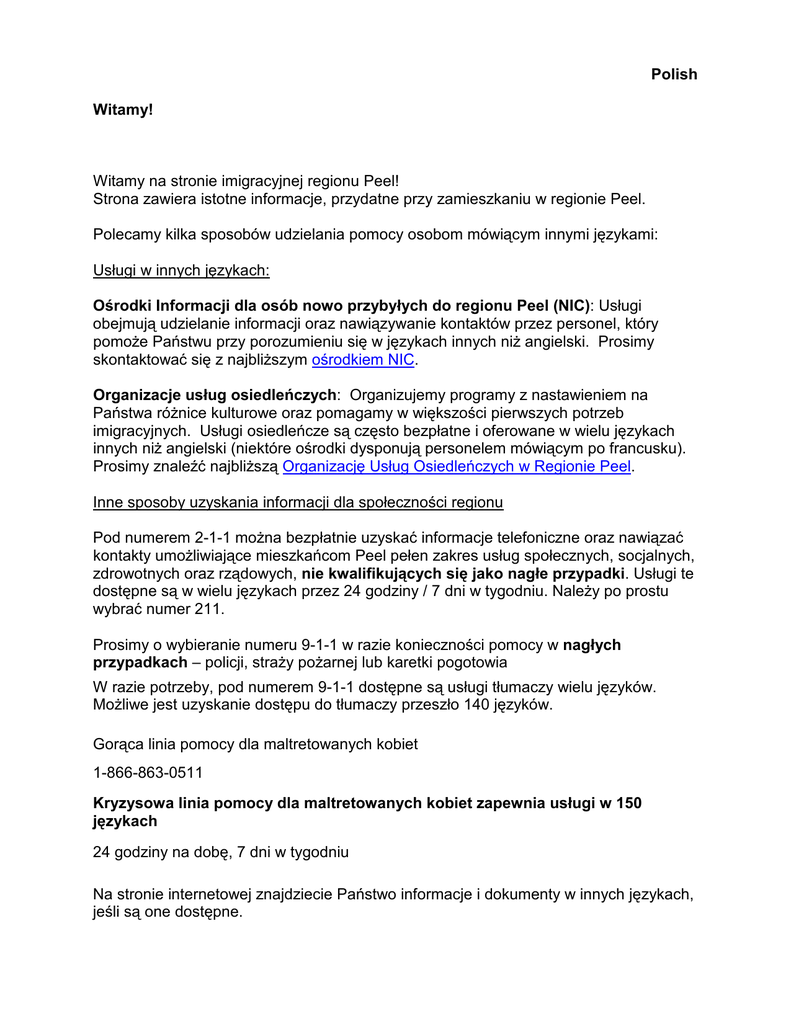 Polish Witamy! Witamy na stronie imigracyjnej regionu Peel! Strona zawiera istotne informacje, przydatne przy zamieszkaniu w regionie Peel. Polecamy kilka sposobów udzielania pomocy osobom mówiącym innymi językami: Usługi w innych językach: Ośrodki Informacji dla osób nowo przybyłych do regionu Peel (NIC): Usługi obejmują udzielanie informacji oraz nawiązywanie kontaktów przez personel, który pomoŜe Państwu przy porozumieniu się w językach innych niŜ angielski. Prosimy skontaktować się z najbliŜszym ośrodkiem NIC. Organizacje usług osiedleńczych: Organizujemy programy z nastawieniem na Państwa róŜnice kulturowe oraz pomagamy w większości pierwszych potrzeb imigracyjnych. Usługi osiedleńcze są często bezpłatne i oferowane w wielu językach innych niŜ angielski (niektóre ośrodki dysponują personelem mówiącym po francusku). Prosimy znaleźć najbliŜszą Organizację Usług Osiedleńczych w Regionie Peel. Inne sposoby uzyskania informacji dla społeczności regionu Pod numerem 2-1-1 moŜna bezpłatnie uzyskać informacje telefoniczne oraz nawiązać kontakty umoŜliwiające mieszkańcom Peel pełen zakres usług społecznych, socjalnych, zdrowotnych oraz rządowych, nie kwalifikujących się jako nagłe przypadki. Usługi te dostępne są w wielu językach przez 24 godziny / 7 dni w tygodniu. NaleŜy po prostu wybrać numer 211. Prosimy o wybieranie numeru 9-1-1 w razie konieczności pomocy w nagłych przypadkach – policji, straŜy poŜarnej lub karetki pogotowia W razie potrzeby, pod numerem 9-1-1 dostępne są usługi tłumaczy wielu języków. MoŜliwe jest uzyskanie dostępu do tłumaczy przeszło 140 języków. Gorąca linia pomocy dla maltretowanych kobiet 1-866-863-0511 Kryzysowa linia pomocy dla maltretowanych kobiet zapewnia usługi w 150 językach 24 godziny na dobę, 7 dni w tygodniu Na stronie internetowej znajdziecie Państwo informacje i dokumenty w innych językach, jeśli są one dostępne.