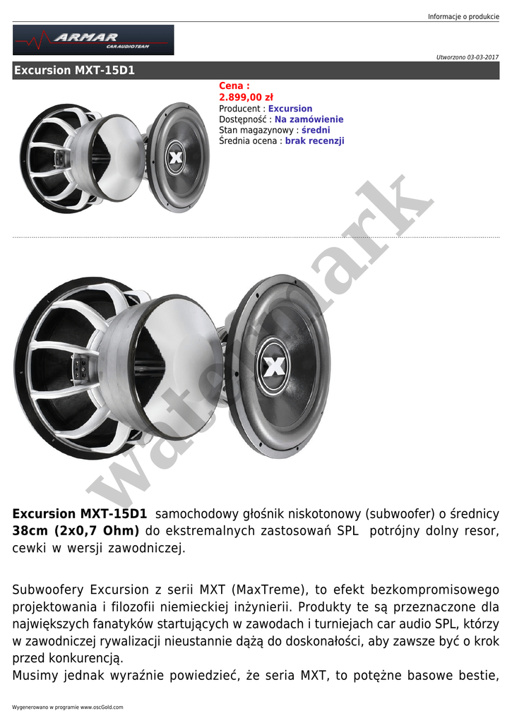 Informacje o produkcie Utworzono 03-03-2017 Excursion MXT-15D1 Cena : 2.899,00 zł w at er m ar k Producent : Excursion Dostępność : Na zamówienie Stan magazynowy : średni Średnia ocena : brak recenzji Excursion MXT-15D1 samochodowy głośnik niskotonowy (subwoofer) o średnicy 38cm (2x0,7 Ohm) do ekstremalnych zastosowań SPL potrójny dolny resor, cewki w wersji zawodniczej. Subwoofery Excursion z serii MXT (MaxTreme), to efekt bezkompromisowego projektowania i filozofii niemieckiej inżynierii. Produkty te są przeznaczone dla największych fanatyków startujących w zawodach i turniejach car audio SPL, którzy w zawodniczej rywalizacji nieustannie dążą do doskonałości, aby zawsze być o krok przed konkurencją. Musimy jednak wyraźnie powiedzieć, że seria MXT, to potężne basowe bestie, Wygenerowano w programie www.oscGold.com PODSTAWOWE DANE TECHNICZNE: ● ● ● ● ● ● ● ● ● ● ● ● ● ● ● ● at ● Głośnik niskotonowy 2-cewkowy do ekstremalnych zastosowań SPL Średnica: 38 cm (15 cali) Moc RMS: 1500 W Moc Max: 5000 W Impedancja: 2x0,7 Ohm Skuteczność: 100 dB (2,8V/1m) Potrójny progresywny dolny resor Cewki w wersji zawodniczej Fs: 46,802 Hz Qts: 0,288 Vas: 41,528 L Xmax: 45/23 mm SPLo: 93,3 dB w ● er m ar k których na pewno nie będziesz potrzebował do codziennego słuchania muzyki podczas jazdy samochodem. Ta konstrukcja powstała tylko w jednym celu dla maksymalnie ekstremalnej chwili szaleństwa bez żadnych kompromisów, bez ograniczeń, często tylko dla tego jedynego "strzału", który wyniesie Cię na podium. Jeżeli jesteś tego w pełni świadomy i już teraz widzisz siebie na podium, to prawdopodobnie musisz pójść tą drogą wraz z Excursion MXT. Bardzo lekka i sztywna membrana stożkowa z prasowanej masy papierowej wzmacnianej włóknem węglowym (Kraft Pulp Cone with Carbon Fibers in Matrix). Konstrukcja charakteryzuje się dużą stabilnością i odpornością na naprężenia w trakcie oddziaływania bardzo dużego ciśnienia akustycznego. Lekka kopułka przeciwpułkowa PP z logo Excursion 3D. Duży fałd górnego zawieszenia wykonany z pianki Rubatek o wysokich właściwościach tłumiących i wysokiej elastyczności - zapewnia duże wychylenia membrany również w bardzo krótkich i szybkich impulsach. Progresywne potrójne dolne zawieszenie. Podwójna 8-warstwowa cewka o średnicy 76mm (3 cale) nawinięta z płaskiego Informacje o produkcie ● ● ● ● ● w at ● er m ar k ● aluminiowego drutu dodatkowo pokrytego czarną substancją w celu skuteczniejszego odprowadzania ciepła. W pełni wentylowany, najbardziej znany i najbardziej sprawdzony w branży car audio 12-ramienny kosz odlewany z aluminium zapewniający wysoką stabilność i swobodny przepływ powietrza pompowanego przez tylną część membrany. Poteżny, potrójny układ magnetyczny 750oz z optymalizacją (FEA Optimized Motor Structure) - gwarantuje bardzo wysoką wydajnoś mocową w impulsie, porównywalną z pistoletem. Solidne terminale przewodów z wkrętami imbusowymi. Gumowy pierścień uszczelniający otwór montażowy. Bardzo wysoka wydajność i potężna dawaka ciśnienia akustycznego w obudowach wentylowanych Produkt opracowany i wykonany w Niemczech z krajowych i zagranicznych części. Gwarancja polskiego dystrybutora: 24 miesiące (nie obejmuje spalonych cewek i uszkodzeń mechanicznych powstałych w wyniku przeciążenia, np. podczas zawodów SPL). Wygenerowano w programie www.oscGold.com