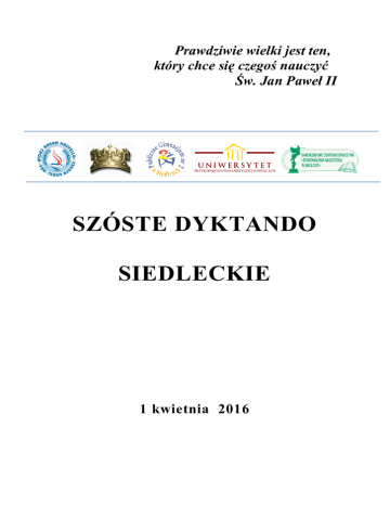 Prawdziwie wielki jest ten, który chce się czegoś nauczyć Św. Jan Paweł II SZÓSTE DYKTANDO SIEDLECKIE 1 kwietnia 2016 REGULAMIN DYKTANDA SIEDLECKIEGO ORGANIZATORZY KONKURSU: Szkoła Podstawowa nr 4 im. Adama Mickiewicza w Siedlcach Uniwersytet Przyrodniczo-Humanistyczny w Siedlcach Publiczne Gimnazjum nr 2 im. Gabriela Narutowicza w Siedlcach II Liceum Ogólnokształcące z Oddziałami Dwujęzycznymi im. Św. Królowej Jadwigi w Siedlcach Samorządowe Centrum Doradztwa i Doskonalenia Nauczycieli w Siedlcach 1. CELE KONKURSU Upowszechnianie kultury języka; kształcenie umiejętności prawidłowego stosowania zasad ortograficznych i interpunkcyjnych; doskonalenie umiejętności świadomego, samodzielnego korzystania ze słowników ortograficznych; rozwijanie umiejętności ortograficznej samokontroli; propagowanie nawyków zdrowej rywalizacji; popularyzacja idei konkursu jako jednej z form rozwijania zainteresowań i uzdolnień uczniów. 2. ZASADY UCZESTNICTWA W KONKURSIE 1. Udział w konkursie może wziąć po 3 uczniów z klas I-III oraz 3 z klas IV – VI z każdej szkoły podstawowej, gimnazjum i szkoły ponadgimazjalnej z terenu m. Siedlce, wyłonionych w trakcie eliminacji szkolnych oraz rodziców uczniów z każdej szkoły, biorącej udział w konkursie. (Rodzice, którzy nie są nauczycielami języka polskiego). 2. Termin zgłaszania uczestników konkursu upływa 15 marca 2016 r. Zgłoszenia uczestników dyktanda dla szkół podstawowych należy kierować na adres e-mail [email protected] lub złożyć osobiście w sekretariacie Szkoły Podstawowej nr 4 w Siedlcach, ul. 10 Lutego 18. Zgłoszenia uczestników dyktanda dla szkół gimnazjalnych należy kierować na [email protected] lub złożyć osobiście adres e-mail w sekretariacie Publicznego Gimnazjum nr 2 w Siedlcach, ul. Szkolna 2. Zgłoszenia uczestników dyktanda dla szkół ponadgimnazjalnych należy kierować na adres e-mail [email protected] lub złożyć osobiście w sekretariacie II Liceum Ogólnokształcącego z Oddziałami Dwujęzycznymi, ul. B. Prusa 12. Rodzice uczniów poszczególnych szkół składają zgłoszenia w szkole, do której uczęszczają ich dzieci. 3. Konkurs dla uczestników poszczególnych etapów edukacji odbędzie się 1 kwietnia 2016 r. o godz. 1000 w szkołach wymienionych w punkcie 2, dla uczniów klas I – III o godz. 12.00 w SP4, dla rodziców 1 kwietnia 2016 r. o godz.16.00 w Szkole Podstawowej nr 4 w Siedlcach. 4. Sprawdzenia prac dokona komisja konkursowa w ciągu jednego tygodnia od daty napisania dyktanda. Wyniki pojawią się na stronie internetowej organizatora oraz zostaną przesłane pocztą e-mail do szkół. 5. Oficjalne ogłoszenie wyników konkursu oraz wręczenie nagród odbędzie się 11 kwietnia 2016 roku o godz. 13.00 w Szkole Podstawowej nr 4 w Siedlcach. 6. Konkurs przeprowadzi i oceni Komisja Konkursowa powołana przez organizatorów. 7. Podczas pisania tekstu nie wolno korzystać z żadnych pomocy naukowych, porozumiewać się z innymi uczestnikami, opuszczać sali przed zebraniem prac, korzystać z jakichkolwiek urządzeń elektronicznych (telefony komórkowe, notesy, słowniki elektroniczne, itp.). 8. Nie wolno pisać dyktowanego tekstu literami drukowanymi. 9. Wszelkie nieczytelne i niejednoznaczne zapisy będą interpretowane na niekorzyść piszącego. Ewentualne poprawki należy nanieść poprzez skreślenie wyrazu błędnego i napisanie powyżej wersji poprawnej. Skreślenia muszą być wyraźnie zaznaczone. 10. Jeśli będzie kilka uniemożliwiałoby prac z wyłonienie tą samą liczbą zwycięzców, błędów, co organizatorzy zastrzegają sobie prawo do przeprowadzenia dogrywki. Finaliści pierwszej części wezmą wówczas udział w ostatecznej rozgrywce, która wyłoni laureatów konkursu. 11. Do oceny dyktanda dla uczniów klas IV – VI szkół podstawowych, gimnazjów, szkół ponadgimnazjalnych, studentów i rodziców uczniów zostaną przyjęte następujące kryteria: Błędy pierwszego stopnia – h–ch, rz–ż, ó–u, mała i wielka litera, pisownia „nie” z różnymi częściami mowy. Błędy drugiego stopnia – łączna i rozdzielna pisownia wyrazów, błędy fonetyczne, gramatyczne, pisownia cząstek „bym”, „byś”, „by” z różnymi częściami mowy, pisownia rzeczowników zakończonych w D., C., Msc., na –i, -ii, -ji. (dwa błędy drugiego stopnia należy traktować jako jeden błąd ortograficzny pierwszego stopnia). Błędy trzeciego stopnia – literówki, błędy interpunkcyjne (trzy błędy należy traktować jako jeden błąd ortograficzny pierwszego stopnia). 12. Do oceny dyktanda dla uczniów klas I – III szkół podstawowych zostaną przyjęte następujące kryteria: Błędy pierwszego stopnia – h–ch, rz–ż, ó–u, mała i wielka litera. Błędy drugiego stopnia pisownia - „nie” z różnymi częściami mowy (dwa błędy drugiego stopnia należy traktować jako jeden błąd ortograficzny pierwszego stopnia). Błędy trzeciego stopnia – błędy interpunkcyjne, literówki (trzy błędy należy traktować jako jeden błąd ortograficzny pierwszego stopnia). 13. Zwycięzcą konkursu zostaje osoba, która napisze pracę bezbłędnie lub popełni najmniejszą ilość błędów 14. Zwycięzca konkursu otrzyma tytuł Mistrza Ortografii, a osoby, które zajmą II i III miejsce – tytuł Wicemistrza Ortografii. 15. Reprezentacja szkoły i ponadgimanzjalnej, – podstawowej, gimnazjalnej która najlepiej napisze dyktando, otrzyma dyplom Szkoły Mistrzów Ortografii. 16. Uczestnicy konkursu otrzymają dyplomy i upominki. 17. Laureaci I miejsca otrzymają statuetki, nagrody, dyplomy. 18. Wgląd do własnej pracy będzie możliwy w terminie do 15 kwietnia 2016 r. Po tym terminie prace zostaną zniszczone. 19. Tekst dyktanda opracowany zostanie na podstawie zasad pisowni i interpunkcji zawartych w Wielkim słowniku ortograficznym PWN z zasadami pisowni i interpunkcji pod red. prof. Edwarda Polańskiego. 20. Udzi