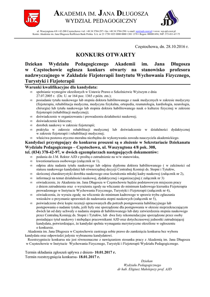 AKADEMIA IM. JANA DŁUGOSZA WYDZIAŁ PEDAGOGICZNY ul. Waszyngtona 4/8 ▪ 42-200 Częstochowa ▪ tel: +48 34 3784-297 ▪ fax +48 34 3784-298 ▪ e-mail: [email protected] ▪ www: wp.ajd.czest.pl Konto: Akademia im. Jana Długosza Raiffeisen Bank Polska S.A. nr 23 1750 1035 0000 0000 1301 1378 ▪ Regon: 000001494, NIP: 573-011-67-75 Częstochowa, dn. 28.10.2016 r. KONKURS OTWARTY Dziekan Wydziału Pedagogicznego Akademii im. Jana Długosza w Częstochowie ogłasza konkurs otwarty na stanowisko profesora nadzwyczajnego w Zakładzie Fizjoterapii Instytutu Wychowania Fizycznego, Turystyki i Fizjoterapii Warunki kwalifikacyjne dla kandydata: • • • • • • • spełnianie wymogów określonych w Ustawie Prawo o Szkolnictwie WyŜszym z dnia 27.07.2005 r. (Dz. U. nr 164 poz. 1365 z późn. zm.); posiadanie tytułu naukowego lub stopnia doktora habilitowanego z nauk medycznych w zakresie medycyny (fizjoterapia, rehabilitacja medyczna, medycyna fizykalna, ortopedia, reumatologia, kardiologia, neurologia, chirurgia) lub tytułu naukowego lub stopnia doktora habilitowanego nauk o kulturze fizycznej w zakresie fizjoterapii (rehabilitacji medycznej); doświadczenie w organizowaniu i prowadzeniu działalności naukowej; doświadczenie kliniczne; dorobek naukowy w zakresie fizjoterapii; praktyka w zakresie rehabilitacji medycznej lub doświadczenie w działalności dydaktycznej w zakresie fizjoterapii i rehabilitacji medycznej; właściwa postawa etyczno-moralna niezbędna do wykonywania zawodu nauczyciela akademickiego. Kandydaci przystępujący do konkursu proszeni są o złoŜenie w Sekretariacie Dziekanatu Wydziału Pedagogicznego – Częstochowa, ul. Waszyngtona 4/8 pok. 308, tel. (034) 378-42-97, w dwóch egzemplarzach następujących dokumentów: • • • podania do J.M. Rektor AJD z prośbą o zatrudnienie na w/w stanowisku, kwestionariusza osobowego (załącznik nr 1), odpisu aktu nadania tytułu naukowego lub odpisu dyplomu doktora habilitowanego ( w zaleŜności od statusu naukowego kandydata) lub równorzędnej decyzji Centralnej Komisji ds. Stopni i Tytułów, • skróconej charakterystyki dorobku naukowego oraz kształcenia młodej kadry naukowej (załącznik nr 2), • informacji na temat działalności naukowej, dydaktycznej i organizacyjnej ( załącznik nr 3) • oświadczenie, Ŝe Akademia im. Jana Długosza w Częstochowie będzie podstawowym miejscem pracy z dniem zatrudnienia oraz o wyraŜeniu zgody na wliczanie do minimum kadrowego kierunku Fizjoterapia prowadzonego w Instytucie Wychowania Fizycznego, Turystyki i Fizjoterapii (załącznik nr 4), • oświadczenia, Ŝe wyraŜa zgodę na wliczenie do minimum kadrowego w sprawie trybu zgłaszania wniosków o przyznanie uprawnień do nadawania stopni naukowych (załącznik nr 5), • poświadczone dwie kopie recenzji opracowanych dla potrzeb postępowania habilitacyjnego lub postępowania o nadanie tytułu, jeśli były one sporządzone dla postępowania w okresie nieprzekraczającym dwóch lat od daty uchwały o nadaniu stopnia dr habilitowanego lub daty zatwierdzenia stopnia naukowego przez Centralną Komisję ds. Stopni i Tytułów, lub dwa listy rekomendacyjne sporządzone przez osoby posiadające tytuł naukowy i niebędące pracownikami AJD oraz dotychczasowej jednostki zatrudniającej kandydata, potwierdzające, Ŝe kandydat spełnia wymagania merytoryczne określone w ogłoszeniu o konkursie. Akademia im. Jana Długosza w Częstochowie zastrzega sobie prawo do zamknięcia konkursu bez wyboru kandydata oraz odpowiedzi jedynie wybranemu kandydatowi. Rozstrzygniecie konkursu nie jest równoznaczne z nawiązaniem stosunku pracy z Akademią im. Jana Długosza w Częstochowie w Instytucie Wychowania Fizycznego, Turystyki i Fizjoterapii Wydziału Pedagogicznego. Termin składania zgłoszeń upływa z dniem- 10.01.2017 r. Termin rozstrzygnięcia konkursu- 18.01.2017 r. Dziekan Wydziału Pedagogicznego dr hab. Eligiusz Małolepszy prof. AJD