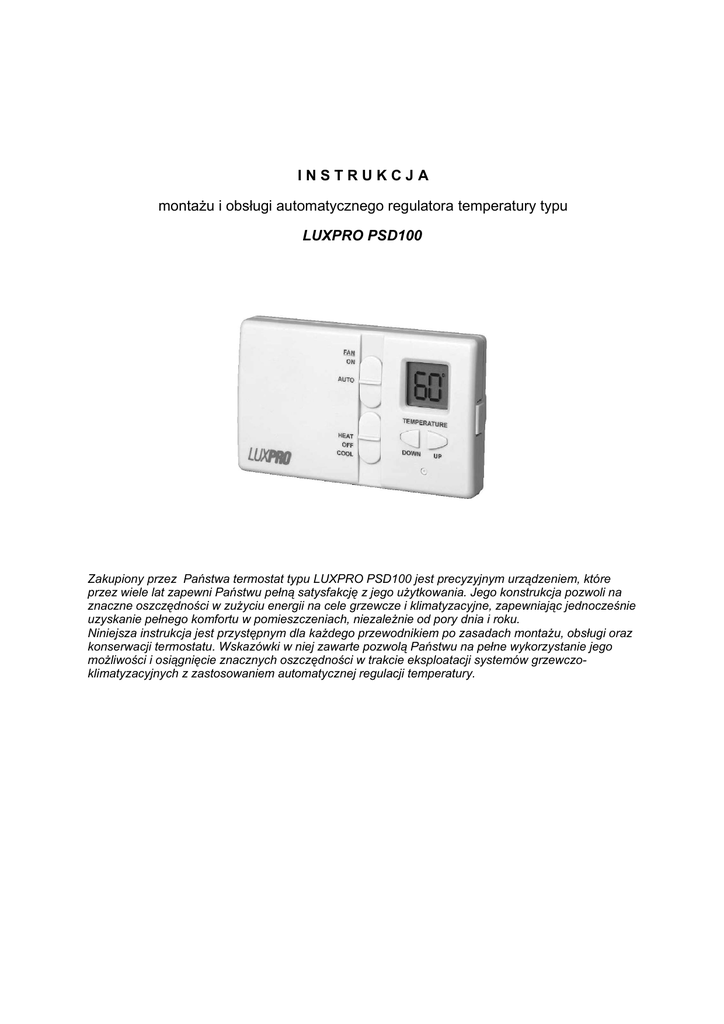 INSTRUKCJA montażu i obsługi automatycznego regulatora temperatury typu LUXPRO PSD100 Zakupiony przez Państwa termostat typu LUXPRO PSD100 jest precyzyjnym urządzeniem, które przez wiele lat zapewni Państwu pełną satysfakcję z jego użytkowania. Jego konstrukcja pozwoli na znaczne oszczędności w zużyciu energii na cele grzewcze i klimatyzacyjne, zapewniając jednocześnie uzyskanie pełnego komfortu w pomieszczeniach, niezależnie od pory dnia i roku. Niniejsza instrukcja jest przystępnym dla każdego przewodnikiem po zasadach montażu, obsługi oraz konserwacji termostatu. Wskazówki w niej zawarte pozwolą Państwu na pełne wykorzystanie jego możliwości i osiągnięcie znacznych oszczędności w trakcie eksploatacji systemów grzewczoklimatyzacyjnych z zastosowaniem automatycznej regulacji temperatury. SPIS TREŚCI: ROZDZIAŁ I. WŁASNOŚCI TERMOSTATU Opis własności ....................................................................................................................3 ROZDZIAŁ II. MONTAŻ TERMOSTATU Poprawne usytuowanie termostatu na ścianie.....................................................................4 Montaż termostatu................................................................................................................4 ROZDZIAŁ III. OBSŁUGA TERMOSTATU Zakładanie i wymiana baterii............................................................................................... 5 Opis czynności obsługowych termostatu.............................................................................5 ROZDZIAŁ IV. USTAWIENIA ZAAWANSOWANE Ustawienie czułości pomiaru temperatury .......................................................................... 6 Zmiana czasu opóźnienia zał./ wył. urządzenia ..................................................................6 Zmiana odczytu temperatury OC / OF .................................................................................. 6 ROZDZIAŁ VI. POŁĄCZENIA ELEKTRYCZNE KABLI STERUJĄCYCH Tabela połączeń kabli sterujących ......................................................................................6 Schematy podłączeń kabli sterujących.............................................................................. 7 2 I. WŁASNOŚCI TERMOSTATU 1. OPIS WŁASNOŚCI Termostat może być wykorzystywany w układach 24-ro voltowego sterowania temperaturą w systemach grzewczo-klimatyzacyjnych z wykorzystaniem elektrycznych, gazowych lub olejowych nagrzewnic powietrza oraz jednostopniowych pomp ciepła. Termostat nie jest przystosowany do stosowania w układach z sieciowym napięciem sterującym oraz w układach wielostopniowych pomp ciepła. Panel sterowania termostatem jest bardzo przejrzysty i łatwy w obsłudze. Duży i przejrzysty wyświetlacz ciekłokrystaliczny pokazuje użytkownikowi rzeczywistą i zadaną temperaturę pomieszczenia. Możliwość zadania określonej czułości termostatu (określenia bezwładności temperaturowej) pozwala na osiągnięcie maksimum komfortu i oszczędności. Zastosowanie opóźniacza (timera) czasowego dla cyklu chłodzenia zabezpiecza przed krótkocykliczną pracą systemu klimatyzacji, co wydatnie wpływa na oszczędność energii i zabezpiecza podzespoły przed nadmiernym zużyciem. Zasilanie termostatu (wyświetlacz oraz sygnał sterujący) realizowane jest z dwóch baterii alkalicznych „AA”. UWAGA! INSTRUKCJĘ NALEŻY DOKŁADNIE PRZECZYTAĆ PRZED ROZPOCZĘCIEM INSTALOWANIA I OBSŁUGI TERMOSTATU. NIE NISZCZYĆ! PAMIĘTAJ!! NINIEJSZA INSRUKCJA ZAWIERA INFORMACJE, KTÓRE MOGĄ WYKRACZAĆ POZA AKTUALNE MOŻLIWOŚCI TWOJEGO SYTEMU. JEDNAK W PRZYSZŁOŚCI MOŻE ZOSTAĆ ROZBUDOWANY I WÓWCZAS POJAWI SIĘ KONIECZNOŚĆ PONOWNEGO SKORZYSTANIA Z INSTRUKCJI. OSTRZEŻENIE ! Termostat jest precyzyjnym i delikatnym urządzeniem, z którym należy obchodzić się delikatnie. Przed montażem lub serwisem termostatu należy odłączyć zasilanie od wszystkich elementów systemu. Włączenie zasilania może nastąpić dopiero po zakończeniu prac. Nie należy spinać na krótko układu sterowania w celu sprawdzenia działania systemu grzewczego lub klimatyzacyjnego. Może to spowodować uszkodzenie termostatu i utratę gwarancji. Termostat jest przeznaczony do pracy z 24-ro voltowym napięciem sterującym. Maksymalna, dopuszczalna wartość natężenia prądu wynosi 1 [A]. Wyższy amperaż może spowodować uszkodzenie termostatu. 3 II. MONTAŻ TERMOSTATU UWAGA! Dla zapobieżenia możliwości wystąpienia porażenia prądem elektrycznym oraz zabezpieczenia modułów systemu grzewczo-klimatyzacyjnego (m.in. nagrzewnicy i klimatyzatora) przed przypadkowym uszkodzeniem należy odłączyć napięcie zasilające przed przystąpieniem do montażu. Odcięcia zasilania można dokonać wyłącznikiem (jeśli istnieje) lub poprzez wykręcenie bezpiecznika. Przed przystąpieniem do montażu przeczytaj dokładnie instrukcję 1. POPRAWNE USYTUOWANIE TERMOSTATU NA ŚCIANIE Przy wyborze miejsca montażu termostatu kieruj się następującymi wskazówkami: Umieść termostat najlepiej na ścianie wewnętrznej, na wysokości około 1,5 metra od poziomu podłogi w pomieszczeniu, które jest najczęściej użytkowane lub pomieszczeniu o reprezentatywnej dla systemu temperaturze (np. hall) Nie instaluj termostatu w pobliżu źródeł ciepła (nasłonecznione ściana, w pobliżu lamp, telewizora, grzejnika, lodówki, przewodów wodnych c.w.u., kratek nawiewnych itp.) Nie instaluj termostatu na ścianie sąsiadującej z nieogrzewanym pomieszczeniem oraz w pobliżu okna i drzwi zewnętrznych. Nie instaluj termostatu w pomieszczeniu, gdzie panuje wysoka wilgotność powietrza. Spowoduje to przyspieszone zużycie elementów programatora. Nie instaluj termostatu w miejscach o osłabionej cyrkulacji powietrza (narożniki pomieszczeń, za otwartymi drzwiami). Spowoduje to przekłamania w odczycie rzeczywistej temperatury pomieszczenia. Nie instaluj termostatu do momentu