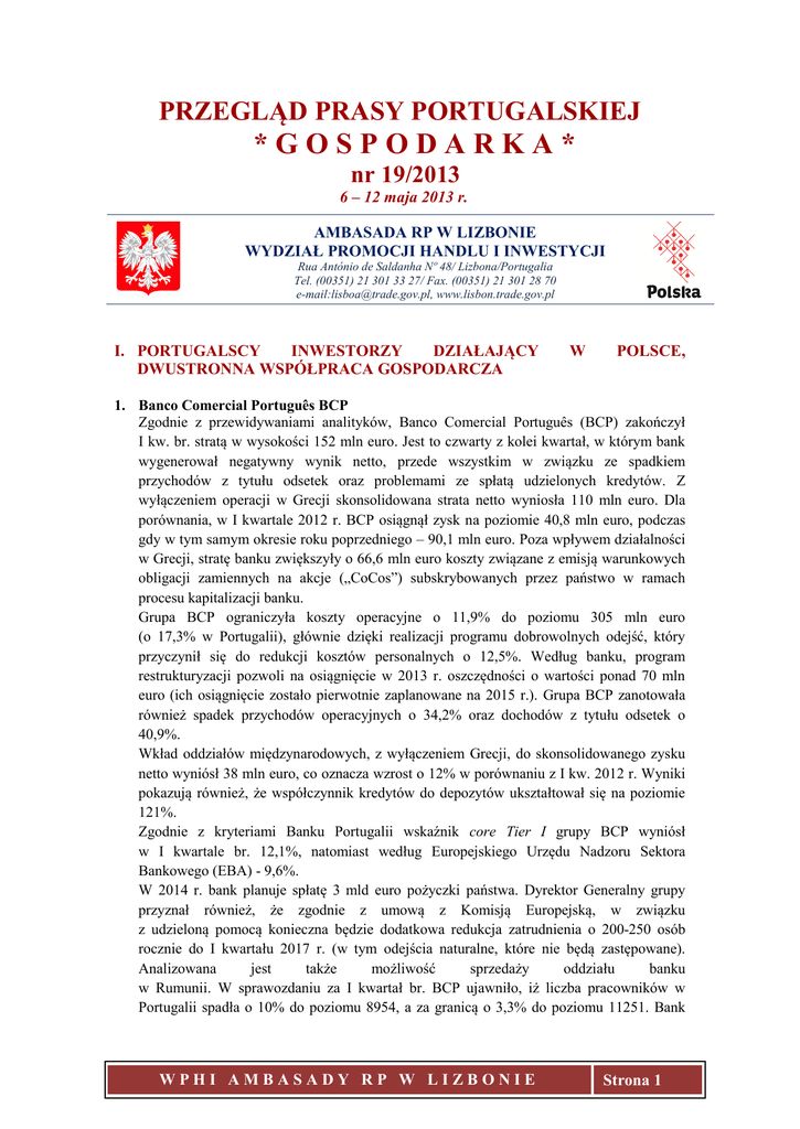 PRZEGLĄD PRASY PORTUGALSKIEJ *GOSPODARKA* nr 19/2013 6 – 12 maja 2013 r. AMBASADA RP W LIZBONIE WYDZIAŁ PROMOCJI HANDLU I INWESTYCJI Rua António de Saldanha Nº 48/ Lizbona/Portugalia Tel. (00351) 21 301 33 27/ Fax. (00351) 21 301 28 70 e-mail:[email protected], www.lisbon.trade.gov.pl I. PORTUGALSCY INWESTORZY DZIAŁAJĄCY DWUSTRONNA WSPÓŁPRACA GOSPODARCZA W POLSCE, 1. Banco Comercial Português BCP Zgodnie z przewidywaniami analityków, Banco Comercial Português (BCP) zakończył I kw. br. stratą w wysokości 152 mln euro. Jest to czwarty z kolei kwartał, w którym bank wygenerował negatywny wynik netto, przede wszystkim w związku ze spadkiem przychodów z tytułu odsetek oraz problemami ze spłatą udzielonych kredytów. Z wyłączeniem operacji w Grecji skonsolidowana strata netto wyniosła 110 mln euro. Dla porównania, w I kwartale 2012 r. BCP osiągnął zysk na poziomie 40,8 mln euro, podczas gdy w tym samym okresie roku poprzedniego – 90,1 mln euro. Poza wpływem działalności w Grecji, stratę banku zwiększyły o 66,6 mln euro koszty związane z emisją warunkowych obligacji zamiennych na akcje („CoCos”) subskrybowanych przez państwo w ramach procesu kapitalizacji banku. Grupa BCP ograniczyła koszty operacyjne o 11,9% do poziomu 305 mln euro (o 17,3% w Portugalii), głównie dzięki realizacji programu dobrowolnych odejść, który przyczynił się do redukcji kosztów personalnych o 12,5%. Według banku, program restrukturyzacji pozwoli na osiągnięcie w 2013 r. oszczędności o wartości ponad 70 mln euro (ich osiągnięcie zostało pierwotnie zaplanowane na 2015 r.). Grupa BCP zanotowała również spadek przychodów operacyjnych o 34,2% oraz dochodów z tytułu odsetek o 40,9%. Wkład oddziałów międzynarodowych, z wyłączeniem Grecji, do skonsolidowanego zysku netto wyniósł 38 mln euro, co oznacza wzrost o 12% w porównaniu z I kw. 2012 r. Wyniki pokazują również, że współczynnik kredytów do depozytów ukształtował się na poziomie 121%. Zgodnie z kryteriami Banku Portugalii wskaźnik core Tier I grupy BCP wyniósł w I kwartale br. 12,1%, natomiast według Europejskiego Urzędu Nadzoru Sektora Bankowego (EBA) - 9,6%. W 2014 r. bank planuje spłatę 3 mld euro pożyczki państwa. Dyrektor Generalny grupy przyznał również, że zgodnie z umową z Komisją Europejską, w związku z udzieloną pomocą konieczna będzie dodatkowa redukcja zatrudnienia o 200-250 osób rocznie do I kwartału 2017 r. (w tym odejścia naturalne, które nie będą zastępowane). Analizowana jest także możliwość sprzedaży oddziału banku w Rumunii. W sprawozdaniu za I kwartał br. BCP ujawniło, iż liczba pracowników w Portugalii spadła o 10% do poziomu 8954, a za granicą o 3,3% do poziomu 11251. Bank WPHI AMBASADY RP W LIZBONIE Strona 1 PRZEGLĄD PRASY PORTUGALSKIEJ “GOSPODARKA” - nr 19/2013 BCP odpowiedzialny jest za prawie 30% zwolnień w sektorze w ciągu ostatnich 2 lat. (Expresso, Jornal de Negócios, Diário Económico, Diário de Notícias, Oje) bankowym 2. Banco Espírito Santo BES Bank BES zamknął I kw. 2013 r. stratą w wysokości 62 mln euro, wobec zysku na poziomie 11,6 mln euro w analogicznym okresie ubiegłego roku. Przedstawiciele banku podkreślają, że złe wyniki finansowe spowodowane są recesją na rynku, spadkiem przychodów oraz wysokim bezrobociem. Przychody banku spadły o 14% do 413,7 mln euro. W bieżącym roku BES zakłada ograniczenie kosztów o 3%, poprzez ograniczenie zatrudnienia o 200 pracowników i zamknięcie około 20 oddziałów. (Vida Económica, Dinheiro Vivo - Diário de Notícias) 3. Kondycja portugalskiego sektora bankowego po I kwartale 2013 r. Pięć największych banków portugalskich (BPI, BCP, Santander Totta, Caixa Geral de Depósitos, BES) zakończyły I kwartał br. łączną stratą na poziomie 199,7 mln euro. W analogicznym okresie ubiegłego roku, instytucje te osiągnęły zysk w kwocie 131,3 mln euro. Jest to prawdopodobnie pierwszy raz w historii, kiedy portugalski sektor bankowy odnotował straty w pierwszym kwartale roku. Banki notują straty we wszystkich obszarach swojej działalności, z wyjątkiem wzrostu wartości depozytów bankowych. Negatywne wyniki są argumentowane dokonanymi przez bank rezerwami na poczet możliwych problemów ze spłatą udzielonych kredytów oraz redukcją marży finansowej. Najlepszy wynik w grupie wygenerował bank BPI (zysk w wysokości 40,5 mln euro), najgorszy – BCP (strata w wysokości 152,0 mln euro). Pozostałe wyniki: CGD – strata na poziomie 36,4 mln euro, BES – strata na poziomie 62,0 mln euro, Santander Totta – zysk w wysokości 10,2 mln euro. W latach 2010-2012 z największych banków portugalskich odeszło ponad 3 tys. pracowników. (Dinheiro Vivo - Diário de Notícias, Diário Económico, Vida Económica, Expresso) 4. EDP Renováveis Zarząd EDP Renováveis (EDPR) planuje uzyskać ponad 1 mld euro ze sprzedaży udziałów w parkach wiatrowych. Największy udział w planowanych przychodach, które mają służyć spłacie zadłużenia przedsiębiorstwa, ma mieć umowa ze strategicznym partnerem China Three Gorges (CTG) przewidująca sprzedaż udziałów na poziomie 34% - 49% w projektach wiatrowych już zainstalowanych (900 MW) lub w fazie budowy (600 MW). Oznaczałoby to otrzymanie środków w wysokości 2 mld euro w latach 2012-2015. Fundusze mają pochodzić jednak nie tylko z transakcji z CTG, lecz również z tytułu sprzedaży aktywów na rzecz innych inwestorów (np. EDPR sprzedało 49% udziałów w projekcie w Stanach Zjednoczonych za ok. 176,0 mln euro). EDPR zamknęło I kwartał br. zyskiem w wysokości 90,0 mln euro, co stanowi wzrost o 45% wobec tego samego okresu 2012 r. Wskaźnik EBITDA wzrósł o 24% i wyniósł 327 mln euro, przy jednoczesnym wzroście kosztów operacyjnych o 20% w związku z wprowadzeniem nowego podatku od sprzedaży energii elektrycznej w Hiszpanii (7%). Moc zainstalowana przez przedsiębiorstwo wzros