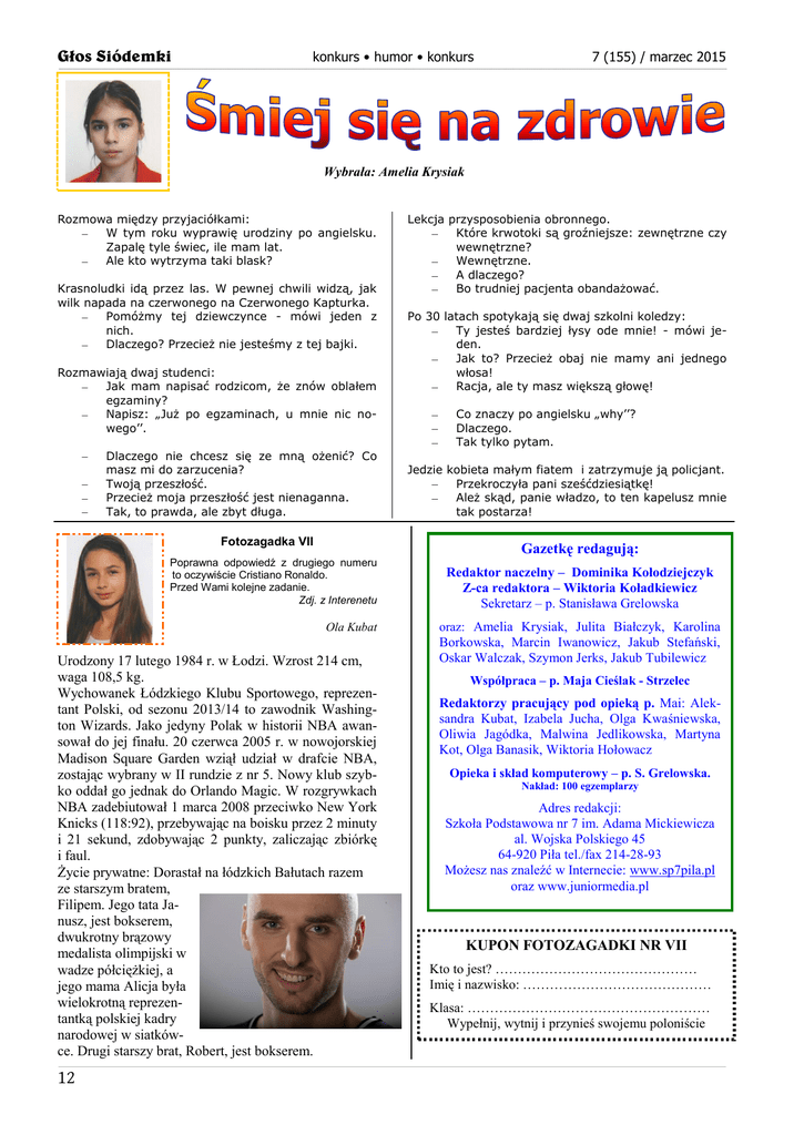 Głos Siódemki konkurs • humor • konkurs 7 (155) / marzec 2015 _______________________________________________________________________________________________________________________________________________________________________________________________________________________________________________________________________________________________________________________________________________________________________________________ Wybrała: Amelia Krysiak Rozmowa między przyjaciółkami: W tym roku wyprawię urodziny po angielsku. Zapalę tyle świec, ile mam lat. Ale kto wytrzyma taki blask? Krasnoludki idą przez las. W pewnej chwili widzą, jak wilk napada na czerwonego na Czerwonego Kapturka. Pomóżmy tej dziewczynce - mówi jeden z nich. Dlaczego? Przecież nie jesteśmy z tej bajki. Rozmawiają dwaj studenci: Jak mam napisać rodzicom, że znów oblałem egzaminy? Napisz: „Już po egzaminach, u mnie nic nowego’’. Dlaczego nie chcesz się ze mną ożenić? Co masz mi do zarzucenia? Twoją przeszłość. Przecież moja przeszłość jest nienaganna. Tak, to prawda, ale zbyt długa. Fotozagadka VII Poprawna odpowiedź z drugiego numeru to oczywiście Cristiano Ronaldo. Przed Wami kolejne zadanie. Zdj. z Interenetu Ola Kubat Urodzony 17 lutego 1984 r. w Łodzi. Wzrost 214 cm, waga 108,5 kg. Wychowanek Łódzkiego Klubu Sportowego, reprezentant Polski, od sezonu 2013/14 to zawodnik Washington Wizards. Jako jedyny Polak w historii NBA awansował do jej finału. 20 czerwca 2005 r. w nowojorskiej Madison Square Garden wziął udział w drafcie NBA, zostając wybrany w II rundzie z nr 5. Nowy klub szybko oddał go jednak do Orlando Magic. W rozgrywkach NBA zadebiutował 1 marca 2008 przeciwko New York Knicks (118:92), przebywając na boisku przez 2 minuty i 21 sekund, zdobywając 2 punkty, zaliczając zbiórkę i faul. Życie prywatne: Dorastał na łódzkich Bałutach razem ze starszym bratem, Filipem. Jego tata Janusz, jest bokserem, dwukrotny brązowy medalista olimpijski w wadze półciężkiej, a jego mama Alicja była wielokrotną reprezentantką polskiej kadry narodowej w siatkówce. Drugi starszy brat, Robert, jest bokserem. Lekcja przysposobienia obronnego. Które krwotoki są groźniejsze: zewnętrzne czy wewnętrzne? Wewnętrzne. A dlaczego? Bo trudniej pacjenta obandażować. Po 30 latach spotykają się dwaj szkolni koledzy: Ty jesteś bardziej łysy ode mnie! - mówi jeden. Jak to? Przecież obaj nie mamy ani jednego włosa! Racja, ale ty masz większą głowę! Co znaczy po angielsku „why’’? Dlaczego. Tak tylko pytam. Jedzie kobieta małym fiatem i zatrzymuje ją policjant. Przekroczyła pani sześćdziesiątkę! Ależ skąd, panie władzo, to ten kapelusz mnie tak postarza! Gazetkę redagują: Redaktor naczelny – Dominika Kołodziejczyk Z-ca redaktora – Wiktoria Koładkiewicz Sekretarz – p. Stanisława Grelowska oraz: Amelia Krysiak, Julita Białczyk, Karolina Borkowska, Marcin Iwanowicz, Jakub Stefański, Oskar Walczak, Szymon Jerks, Jakub Tubilewicz Współpraca – p. Maja Cieślak - Strzelec Redaktorzy pracujący pod opieką p. Mai: Aleksandra Kubat, Izabela Jucha, Olga Kwaśniewska, Oliwia Jagódka, Malwina Jedlikowska, Martyna Kot, Olga Banasik, Wiktoria Hołowacz Opieka i skład komputerowy – p. S. Grelowska. Nakład: 100 egzemplarzy Adres redakcji: Szkoła Podstawowa nr 7 im. Adama Mickiewicza al. Wojska Polskiego 45 64-920 Piła tel./fax 214-28-93 Możesz nas znaleźć w Internecie: www.sp7pila.pl oraz www.juniormedia.pl KUPON FOTOZAGADKI NR VII Kto to jest? ……………………………………… Imię i nazwisko: …………………………………… Klasa: ……………………………………………… Wypełnij, wytnij i przynieś swojemu poloniście __________________________________________________________________________________________________________________________________________________________________________________________________________________________________________________________________________________________________________________________________________________________________________________________________________________________________________________________________________ 12