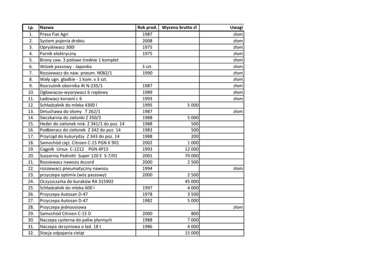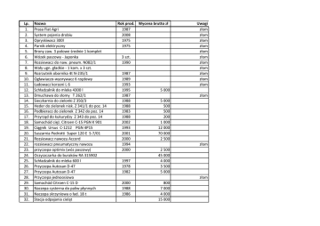Lp. Nazwa Rok prod. Wycena brutto zł 1. Prasa Fiat Agri 1987 złom