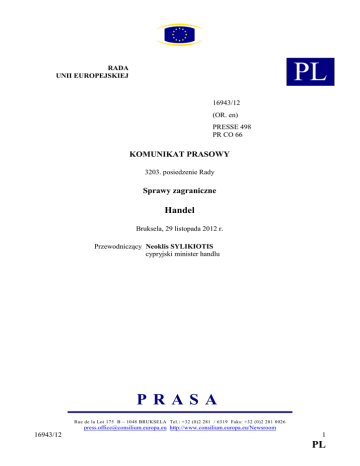PL RADA UII EUROPEJSKIEJ 16943/12 (OR. en) PRESSE 498 PR CO 66 KOMUIKAT PRASOWY 3203. posiedzenie Rady Sprawy zagraniczne Handel Bruksela, 29 listopada 2012 r. Przewodniczący eoklis SYLIKIOTIS cypryjski minister handlu PRASA Rue de la Loi 175 B – 1048 BRUKSELA Tel.: +32 (0)2 281 / 6319 Faks: +32 (0)2 281 8026 [email protected] http://www.consilium.europa.eu/Newsroom 16943/12 1 PL 29 XI 2012 Główne wyniki posiedzenia Rady Rada upoważniła Komisję do rozpoczęcia negocjacji z Japonią w sprawie umowy o wolnym handlu i, równolegle, w sprawie dwustronnej umowy ramowej o szerszym zakresie. Rada z zadowoleniem przyjęła także rozpoczęcie negocjacji z Marokiem w sprawie „pogłębionej i kompleksowej” strefy wolnego handlu. Wcześniej, w tym miesiącu, Komisja ogłosiła, że analiza zakresu negocjacji z Marokiem zakończyła się powodzeniem. 16943/12 2 PL 29 XI 2012 SPIS TREŚCI1 UCZESTICY ................................................................................................................................... 5 OMAWIAE PUKTY Procedury podejmowania decyzji w polityce handlowej..................................................................... 7 Bezpośrednie inwestycje zagraniczne – rozstrzyganie sporów ........................................................... 8 Stosunki handlowe UE-Japonia ........................................................................................................... 9 Negocjacje handlowe UE–Kanada..................................................................................................... 10 Negocjacje handlowe UE–Singapur .................................................................................................. 11 Stosunki handlowe z krajami południowego regionu Morza Śródziemnego .................................... 12 Sprawy różne...................................................................................................................................... 13 IE ZATWIERDZOE PUKTY SPRAWY ZAGRA.ICZ.E – Środki ograniczające – Syria ................................................................................................................................. 14 – UE/Izrael – Liberalizacja handlu produktami rolnymi i produktami rybołówstwa ............................................... 14 POLITYKA HA.DLOWA – Przystąpienie do WTO: Tadżykistan ..................................................................................................................... 14 ŚRODOWISKO – Emisje CO2 pochodzące z pojazdów ..................................................................................................................... 14 – Substancje niebezpieczne w sprzęcie elektrycznym i elektronicznym .................................................................. 15 TRA.SPORT – 1 Transport lądowy towarów niebezpiecznych ........................................................................................................ 15 Jeżeli deklaracje, konkluzje lub rezolucje zostały przez Radę formalnie przyjęte, jest to zaznaczone w tytule danego punktu, a tekst jest umieszczony w cudzysłowie. Dokumenty, do których odesłano w tekście, są dostępne na internetowej stronie Rady (http://www.consilium.europa.eu). Gwiazdką oznaczono akty przyjęte wraz z oświadczeniami do protokołu Rady przeznaczonymi do wiadomości publicznej; oświadczenia te można znaleźć na wyżej wspomnianej internetowej stronie Rady lub uzyskać z biura prasowego. 16943/12 3 PL 29 XI 2012 TELEKOMU.IKACJA – Światowa konferencja na temat telekomunikacji międzynarodowej ..................................................................... 15 16943/12 4 PL 29 XI 2012 UCZESTICY Belgia: Didier REYNDERS wicepremier oraz minister spraw zagranicznych, handlu zagranicznego i spraw europejskich Bułgaria: Dimityr CANCZEW stały przedstawiciel Republika Czeska: Milan HOVORKA wiceminister przemysłu i handlu Dania: Pia OLSEN DYHR minister handlu i inwestycji iemcy: Anne Ruth HERKES sekretarz stanu, Federalne Ministerstwo Gospodarki i Technologii Estonia: Urmas PAET minister spraw zagranicznych Irlandia: Richard BRUTON minister pracy, przedsiębiorczości i innowacji Grecja: Panagiotis MITARACHI wiceminister, Ministerstwo Rozwoju, Konkurencyjności, Infrastruktury, Transportu i Sieci Hiszpania: Jaime GARCÍA-LEGAZ PONCE sekretarz stanu ds. handlu Francja: Nicole BRICQ minister handlu zagranicznego Włochy: Massimo VARI sekretarz stanu, Ministerstwo Rozwoju Gospodarczego Cypr: Neoklis SYLIKIOTIS Charalambos ROUSOS minister handlu, przemysłu i turystyki przewodniczący Komitetu ds. Polityki Handlowej Łotwa: Juris PŪCE sekretarz stanu, Ministerstwo Gospodarki Litwa: Raimundas KAROBLIS stały przedstawiciel Luksemburg: Christian BRAUN stały przedstawiciel Węgry: János MARTONYI minister spraw zagranicznych Malta: Marlene BONNICI stały przedstawiciel iderlandy: Lilianne PLOUMEN minister handlu zagranicznego i współpracy na rzecz rozwoju Austria: Walter GRAHAMMER stały przedstawiciel Polska: Andrzej DYCHA podsekretarz stanu, Ministerstwo Gospodarki Portugalia: Miguel MORAIS LEITÃO Rumunia: Mihnea MOTOC 16943/12 sekretarz stanu przy ministrze spraw zagranicznych, odpowiedzialny za sprawy europejskie stały przedstawiciel 5 PL 29 XI 2012 Słowenia: Uroš ROŽIČ sekretarz stanu, Ministerstwo Rozwoju Gospodarczego i Techniki Słowacja: Tomáš MALATINSKÝ minister gospodarki Finlandia: Alexander STUBB minister spraw europejskich i handlu zagranicznego Szwecja: Ewa BJÖRLING minister handlu Zjednoczone Królestwo: Stephen GREEN Komisja: Karel DE GUCHT wiceminister ds. handlu i inwestycji oraz rzecznik rządu, Departament Działalności Gospodarczej, Innowacji i Umiejętności oraz Ministerstwo Spraw Zagranicznych i Wspólnoty Narodów członek Rząd państwa przystępującego reprezentowały następujące osoby: Chorwacja: Denis ČAJO 16943/12 szef Państwowego Biura Polityki Handlowej 6 PL 29 XI 2012 OMAWIAE PUKT