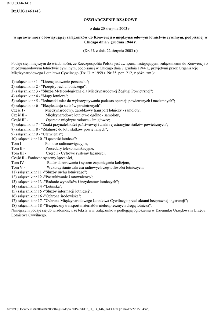 Dz.U.03.146.1413 OŚWIADCZENIE RZĄDOWE z dnia 20