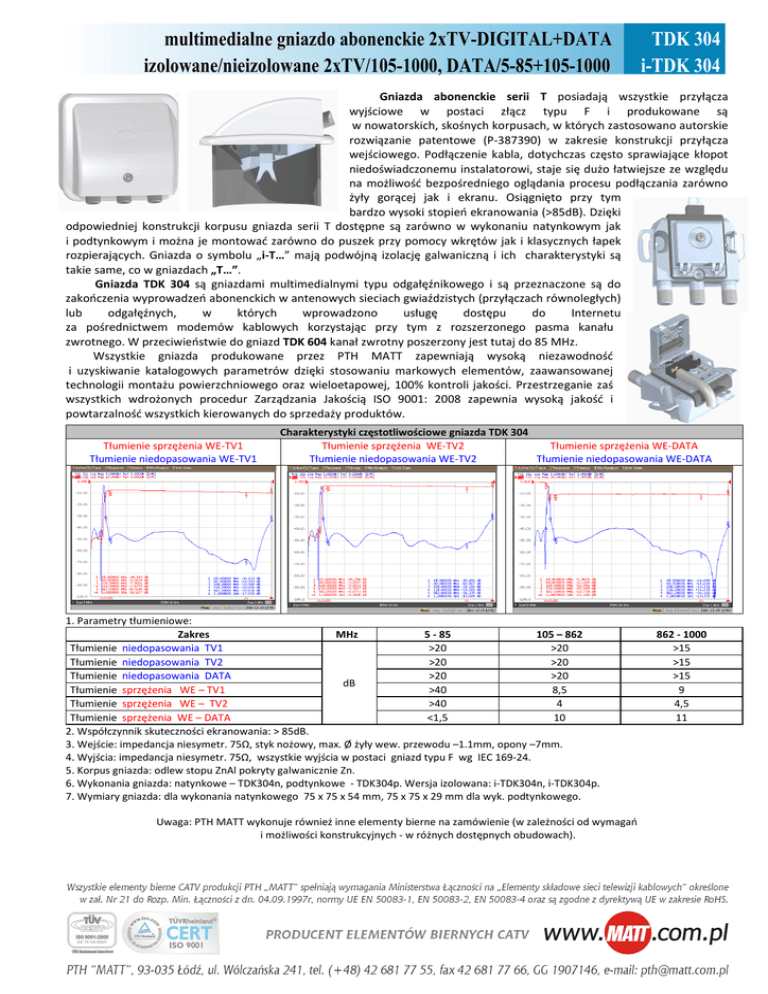 multimedialne gniazdo abonenckie 2xTV-DIGITAL+DATA izolowane/nieizolowane 2xTV/105-1000, DATA/5-85+105-1000 TDK 304 i-TDK 304 Gniazda abonenckie serii T posiadają wszystkie przyłącza wyjściowe w postaci złącz typu F i produkowane są w nowatorskich, skośnych korpusach, w których zastosowano autorskie rozwiązanie patentowe (P-387390) w zakresie konstrukcji przyłącza wejściowego. Podłączenie kabla, dotychczas często sprawiające kłopot niedoświadczonemu instalatorowi, staje się dużo łatwiejsze ze względu na możliwość bezpośredniego oglądania procesu podłączania zarówno żyły gorącej jak i ekranu. Osiągnięto przy tym bardzo wysoki stopień ekranowania (>85dB). Dzięki odpowiedniej konstrukcji korpusu gniazda serii T dostępne są zarówno w wykonaniu natynkowym jak i podtynkowym i można je montować zarówno do puszek przy pomocy wkrętów jak i klasycznych łapek rozpierających. Gniazda o symbolu „i-T…” mają podwójną izolację galwaniczną i ich charakterystyki są takie same, co w gniazdach „T…”. Gniazda TDK 304 są gniazdami multimedialnymi typu odgałęźnikowego i są przeznaczone są do zakończenia wyprowadzeń abonenckich w antenowych sieciach gwiaździstych (przyłączach równoległych) lub odgałęźnych, w których wprowadzono usługę dostępu do Internetu za pośrednictwem modemów kablowych korzystając przy tym z rozszerzonego pasma kanału zwrotnego. W przeciwieństwie do gniazd TDK 604 kanał zwrotny poszerzony jest tutaj do 85 MHz. Wszystkie gniazda produkowane przez PTH MATT zapewniają wysoką niezawodność i uzyskiwanie katalogowych parametrów dzięki stosowaniu markowych elementów, zaawansowanej technologii montażu powierzchniowego oraz wieloetapowej, 100% kontroli jakości. Przestrzeganie zaś wszystkich wdrożonych procedur Zarządzania Jakością ISO 9001: 2008 zapewnia wysoką jakość i powtarzalność wszystkich kierowanych do sprzedaży produktów. Tłumienie sprzężenia WE-TV1 Tłumienie niedopasowania WE-TV1 Charakterystyki częstotliwościowe gniazda TDK 304 Tłumienie sprzężenia WE-TV2 Tłumienie sprzężenia WE-DATA Tłumienie niedopasowania WE-TV2 Tłumienie niedopasowania WE-DATA 1. Parametry tłumieniowe: Zakres MHz 5 - 85 105 – 862 Tłumienie niedopasowania TV1 >20 >20 Tłumienie niedopasowania TV2 >20 >20 Tłumienie niedopasowania DATA >20 >20 dB Tłumienie sprzężenia WE – TV1 >40 8,5 Tłumienie sprzężenia WE – TV2 >40 4 Tłumienie sprzężenia WE – DATA <1,5 10 2. Współczynnik skuteczności ekranowania: > 85dB. 3. Wejście: impedancja niesymetr. 75Ω, styk nożowy, max. Ø żyły wew. przewodu –1.1mm, opony –7mm. 4. Wyjścia: impedancja niesymetr. 75Ω, wszystkie wyjścia w postaci gniazd typu F wg IEC 169-24. 5. Korpus gniazda: odlew stopu ZnAl pokryty galwanicznie Zn. 6. Wykonania gniazda: natynkowe – TDK304n, podtynkowe - TDK304p. Wersja izolowana: i-TDK304n, i-TDK304p. 7. Wymiary gniazda: dla wykonania natynkowego 75 x 75 x 54 mm, 75 x 75 x 29 mm dla wyk. podtynkowego. Uwaga: PTH MATT wykonuje również inne elementy bierne na zamówienie (w zależności od wymagań i możliwości konstrukcyjnych - w różnych dostępnych obudowach). 862 - 1000 >15 >15 >15 9 4,5 11