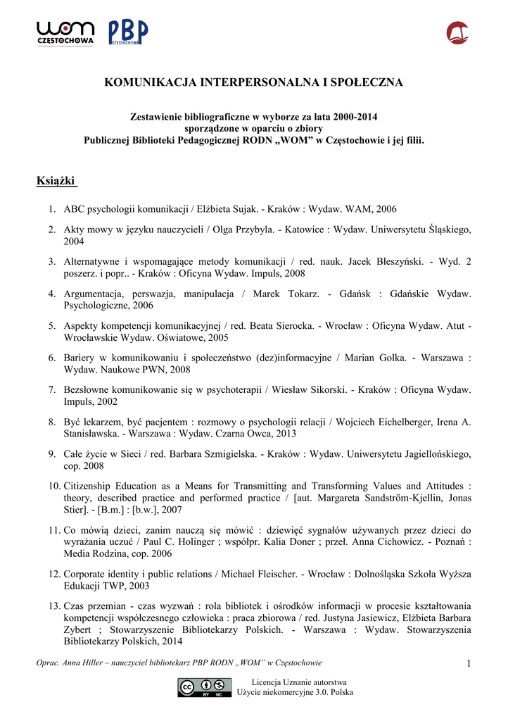 KOMUNIKACJA INTERPERSONALNA I SPOŁECZNA Zestawienie bibliograficzne w wyborze za lata 2000-2014 sporządzone w oparciu o zbiory Publicznej Biblioteki Pedagogicznej RODN „WOM” w Częstochowie i jej filii. Książki 1. ABC psychologii komunikacji / Elżbieta Sujak. - Kraków : Wydaw. WAM, 2006 2. Akty mowy w języku nauczycieli / Olga Przybyla. - Katowice : Wydaw. Uniwersytetu Śląskiego, 2004 3. Alternatywne i wspomagające metody komunikacji / red. nauk. Jacek Błeszyński. - Wyd. 2 poszerz. i popr.. - Kraków : Oficyna Wydaw. Impuls, 2008 4. Argumentacja, perswazja, manipulacja / Marek Tokarz. - Gdańsk : Gdańskie Wydaw. Psychologiczne, 2006 5. Aspekty kompetencji komunikacyjnej / red. Beata Sierocka. - Wrocław : Oficyna Wydaw. Atut Wrocławskie Wydaw. Oświatowe, 2005 6. Bariery w komunikowaniu i społeczeństwo (dez)informacyjne / Marian Golka. - Warszawa : Wydaw. Naukowe PWN, 2008 7. Bezsłowne komunikowanie się w psychoterapii / Wiesław Sikorski. - Kraków : Oficyna Wydaw. Impuls, 2002 8. Być lekarzem, być pacjentem : rozmowy o psychologii relacji / Wojciech Eichelberger, Irena A. Stanisławska. - Warszawa : Wydaw. Czarna Owca, 2013 9. Całe życie w Sieci / red. Barbara Szmigielska. - Kraków : Wydaw. Uniwersytetu Jagiellońskiego, cop. 2008 10. Citizenship Education as a Means for Transmitting and Transforming Values and Attitudes : theory, described practice and performed practice / [aut. Margareta Sandström-Kjellin, Jonas Stier]. - [B.m.] : [b.w.], 2007 11. Co mówią dzieci, zanim nauczą się mówić : dziewięć sygnałów używanych przez dzieci do wyrażania uczuć / Paul C. Holinger ; współpr. Kalia Doner ; przeł. Anna Cichowicz. - Poznań : Media Rodzina, cop. 2006 12. Corporate identity i public relations / Michael Fleischer. - Wrocław : Dolnośląska Szkoła Wyższa Edukacji TWP, 2003 13. Czas przemian - czas wyzwań : rola bibliotek i ośrodków informacji w procesie kształtowania kompetencji współczesnego człowieka : praca zbiorowa / red. Justyna Jasiewicz, Elżbieta Barbara Zybert ; Stowarzyszenie Bibliotekarzy Polskich. - Warszawa : Wydaw. Stowarzyszenia Bibliotekarzy Polskich, 2014 Oprac. Anna Hiller – nauczyciel bibliotekarz PBP RODN „WOM” w Częstochowie Licencja Uznanie autorstwa Użycie niekomercyjne 3.0. Polska 1 14. Dialog a nowe media / red. Małgorzata Kita ; współudział Jan Grzenia. - Katowice : Wydaw. Uniwersytetu Śląskiego, 2004 15. Dzieci o specjalnych potrzebach komunikacyjnych : diagnoza, edukacja, terapia / red. nauk. Barbara Winczura. - Wyd. 2. - Kraków : Oficyna Wydaw. Impuls, 2014 16. Edukacja wzbogacająca życie : porozumienie bez przemocy przyczynia się do poprawy wyników nauczania, redukuje konflikty i wzbogaca wzajemne relacje między uczniami i nauczycielami / Marshall B. Rosenberg ; przeł. Anna Mills. - Warszawa : Jacek Santorski & CO Agencja Wydawnicza, 2006 17. Funkcje komunikacji społecznej / red. Kazimiera Wódz, Jacek Wódz. - Dąbrowa Górnicza : Wyższa Szkoła Biznesu, 2003 18. Gesty zamiast słów : psychologia i trening komunikacji niewerbalnej / Wiesław Sikorski. - Kraków : Oficyna Wydaw. Impuls, 2005 19. Gestykulacja i mowa : o niewerbalnym komunikowaniu się dzieci w wieku przedszkolnym / Magdalena Grochowalska. - Kraków : Wydaw. Naukowe Akademii Pedagogicznej, 2002. 20. Grzeczność w komunikacji językowej / Małgorzata Marcjanik. - Wyd. 1 (3 dodruk). - Warszawa : Wydaw. Naukowe PWN, 2013 21. Homo communicus : szkice pedagogiczne / red. Wojciech Kojs ; współudz. Łucja Dawid. Katowice : Wydaw. Uniwersytetu Śląskiego, 2000 22. Jak budować porozumienie i współpracę w szkole? / Aleksandra Karasowska ; [Państwowa Agencja Rozwiązywania Problemów Alkoholowych]. - Warszawa : Wydaw. Edukacyjne PARPAMEDIA, 2010 23. Jak mówić by nas słuchano : psychologia pozytywnej komunikacji / Iwona Majewska-Opiełka. Gdańsk : Gdańskie Wydaw. Psychologiczne, 2012 24. Jak mówić, rozmawiać, przemawiać? / [Michał Kuziak ; rys. Rafał Bojdys]. - Wyd. 2. - BielskoBiała : Wydaw. Park, cop. 2006 25. Jak mówić, żeby nas słuchali : komunikacja we współczesnym miejscu pracy / Sonya Hamlin ; przeł. Sylwia Jaśkiewicz-Budek. - Wyd. 1 (dodruk). - Poznań : Dom Wydaw. REBIS, 2013 26. Jak porozumiewają się dzieci niesłyszące z osobami słyszącymi : analiza wybranych interakcji komunikacyjnych / Alicja Rakowska. - Kraków : Wydaw. Naukowe Akademii Pedagogicznej, 2000 27. Jak prowadzić zebrania / Barbara J. Streibel ; [przeł. Katarzyna Wywiał-Prząda]. - Kraków : Wolters Kluwer Polska, 2007 28. Jak przygotować profesjonalną prezentację / G. Michael Campbell ; [przeł. Alicja Zydorowicz]. Kraków : Wolters Kluwer Polska, 2007 29. Jak się dogadać : 92 małe sztuczki na osiągnięcie wielkiego sukcesu w relacjach z ludźmi / Leil Lowndes ; przeł. Radosław Madejski. - Warszawa : G+J Gruner + Jahr Polska, cop. 2007 30. Jak skutecznie prowadzić warsztaty z zakresu komunikacji : praca metodą aktywizującą przeżywanie / von Thun Friedemann Schulz ; tł. Magdalena Jałowiec-Sawicka. - Kielce : Wydaw. Jedność, 2012 Oprac. Anna Hiller – nauczyciel bibliotekarz PBP RODN „WOM” w Częstochowie Licencja Uznanie autorstwa Użycie niekomercyjne 3.0. Polska 2 31. Jak towarzyszyć uczniom w rozwoju społeczno-zawodowym? : gry szkoleniowe i scenariusze zajęć do pracy z młodzieżą / Iwona Kania. - Warszawa : Difin, 2010 32. Jak występować publicznie : klucze do sukcesu i pułapki, których należy unikać / Jean-Denis Ménard ; przeł. Angelina Waśko-Bongiraud. - Warszawa : Jacek Santorski & CO Agencja Wydawnicza, 2009 33. Język ciała dzieci / Samy Molcho ; fot. Nomi Baumgartl ; [tł. z jęz. niem. Julian Brudzewski]. Katowice : Wydaw. KOS, 2008 34. Język ciała gestów i zachowań / Andy Collins ; [korekta Bożena Burzyńska]. - Warszawa : Klub Dla Ciebie, 2003 35. Język w komunikowaniu / Marian Bugajski. - Warszawa : Wydaw. Naukowe PWN, 2006 36. Już nie wiem jak do ciebie mówi