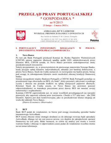 PRZEGLĄD PRASY PORTUGALSKIEJ * GOSPODARKA * nr 9/2015 23 lutego – 1 marca 2015 r. AMBASADA RP W LIZBONIE WYDZIAŁ PROMOCJI HANDLU I INWESTYCJI Rua António de Saldanha Nº 48 | Lizbona | Portugalia Tel. (00351) 21 301 3327 | Fax. (00351) 21 301 2870 e-mail: [email protected] | www.lisbon.trade.gov.pl I. PORTUGALSCY INWESTORZY DZIAŁAJĄCY DWUSTRONNA WSPÓŁPRACA GOSPODARCZA W POLSCE, 1. Novo Banco Po tym jak Bank Portugalii przekazał Komisji ds. Rynku Papierów Wartościowych (CMVM) sprawę papierów dłużnych upadłej spółki GES subskrybowanych przez klientów BES, CMVM uznała, że Novo Banco powinien zrekompensować straty poszkodowanych inwestorów. Należy przypomnieć, że, w przeciwieństwie do pierwszego stanowiska Nowego Banku, kiedy przyjęto spłatę klientów indywidualnych, aktualne jest bardziej defensywne, a prezes Novo Banco, Stock da Cunha zaznaczył, że rozwiązanie nie będzie proste, biorąc pod uwagę, że rekompensata klientów może zaszkodzić obecnej kondycji finansowej banku. Istnieje niezgodność między Bankiem Portugalii a CMVM. Bank Portugalii postuluje za przeniesienie tego obowiązku na BES, zły bank”, który pozostał z aktywami wysokiego ryzyka i obecnie nie posiada środków na spłatę niniejszych papierów dłużnych. Również Stock da Cunha uważa, że Novo Banco nie powinien ponosić odpowiedzialności za transakcje poczynione przez dawny BES ani narażać swojej rentowności i wypłacalności. Komisja CMVM zapowiedziała już, że użyje wszelkich przysługujących jej narzędzi prawnych, aby zapewnić ochronę praw inwestorów. Chodzi o 527 mln euro – dla 2500 klientów. Sprawa jest dość kontrowersyjna, jako że poszkodowani klienci okupują od wielu dni oddziały Novo Banco. (Diário Económico, Observador) 2. BCP Bank BCP podał do wiadomości, że bierze pod uwagę ewentualną sprzedaż banku internetowego ActivoBank. BCP ocenia obecnie różne strategie działania co do dalszego rozwoju bądź sprzedaży ActivoBank, dlatego też nie jest jeszcze pewne, czy dojdzie do jakiejkolwiek operacji finansowej na tym polu. Bank zaznacza, że celem tej analizy jest troska o wzrost wartości banku i obiecuje w odpowiednim czasie podać do wiadomości wszelkie istotne na ten temat informacje. PRZEGLĄD PRASY PORTUGALSKIEJ “GOSPODARKA” - nr 3/2015 W marcu zeszłego roku BCP był już gotowy do możliwych rozmów na temat sprzedaży ActivoBank przy okazji transakcji dotyczących innych aktywów. Nie doszło jednak do żadnych wiążących rozmów. Activo Bank, reprezentowany przez Nelsona Machado, jest kontrolowany w 100% przez BCP. Rozpoczął działalność jako platforma inwestycyjna prawie wyłącznie przeznaczona dla osób prywatnych, rozwijając się do poziomu banku, z kilkoma oddziałami. W 2014 roku osiągnął zyski o wartości 5 mln euro. Według najnowszego zestawienia największych banków The Brand Finance Banking 500 pod względem wartości marek, opublikowanego przez magazyn The Bankier, Bank BCP Millennium wyprzedził bank Caixa Geral de Depósitos (CGD) i reprezentuje najwyższą wartość marki spośród banków portugalskich. BCP wspiął się o 12 pozycji w rankingu, zajmując 213. miejsce (216. miejsce CGD i 363. miejsce bank BPI). Spośród trzech najważniejszych banków krajowych, które znalazły się na liście top 500, jedynie Millennium bcp zdołał awansować, osiągając roczny wzrost wartości w wysokości 16%, tj. 605 mln dolarów (539,7 mln euro). W rankingu w górę przesunął się również polski Bank Millennium, o 11 pozycji, plasując się ostatecznie na 339. miejscu, z wartością marki 295 mln dolarów (263,2 mln euro) i rocznym wzrostem jej wartości o 9%. (Diário Económico, Diário de Notícias, Jornal de Negócios) 3. Jerónimo Martins Grupa Jerónimo Martins potwierdza, że nowy plan ekspansji w Polsce wiąże się ze zwolnieniem zbiorowym 136 pracowników Biedronki. Oficjalne źródła informacji ujawniają, że grupa przyjęła jako cel na lata 2015-2017 otwarcie 300 nowych sklepów w Polsce (dla porównania w ciągu ostatnich 3 lat otwarto 700 takich sklepów). To właśnie w obliczu nowego planu Jerónimo Martins Polska zainicjował proces zwolnień dotyczący 136 współpracowników należących do ekip pracujących nad rozwojem strategii ekspansji, które zostaną redukowane w wyniku planów inaugurowania mniejszej ilości sklepów. Zwolnienia nie będą mieć wpływu na pracowników pozostałych 2 500 sklepów i 13 centrów dystrybucyjnych firmy. Jerónimo Martins dodaje, że wszystkim pracownikom objętym zwolnieniem zostanie zaoferowany pakiet odszkodowań, który zdecydowanie przewyższa ten ustanowiony przez polskie prawo, co więcej, zawiera program aktywizacji zawodowej (outplacement). Pomimo zwolnień Biedronka zachowuje swoją silną pozycję w sektorze i zamierza zainwestować od 700 do 800 mln euro w latach 2015-2017. (Diário Económico) 4. EDP Renováveis (EDPR) EDPR zakończyła rok 2014 zyskami w wysokości 126 mln euro, co stanowi spadek o 7% w stosunku do roku poprzedniego. João Manso Neto, prezes EDPR, uzasadnia ten wynik negatywnym wpływem, jaki miały na rezultaty firmy zmiany regulacyjne wprowadzone w Hiszpanii. Przychody firmy osiągnęły poziom 1,2 mld euro, czyli o 40 mln euro (3%) mniej niż w 2013 roku, głównie z powodu najniższej średniej ceny w Europie i różnic walutowych. Średnia cena sprzedaży w tym okresie była o 6% niższa niż w 2013 roku, w wysokości 59 euro/MWh, ze względu na negatywny wpływ najniższej ceny w Europie (10% niższa 2| PRZEGLĄD PRASY PORTUGALSKIEJ “GOSPODARKA” - nr 3/2015 niż w 2013 roku), a także zmian regulacyjnych w Hiszpanii. Złagodzone to zostało wzrostem cen w Ameryce Północnej (ponad 5%) i Brazylii (ponad 12%). Zysk EDPR przed odliczeniem odsetek, podatków i amortyzacji (EBITDA) zmniejszył się o 17 mln euro do 903 milionów. Pod względem produkcji w 2014 roku spółka zarządzała w sumie 9,0 GW w 1