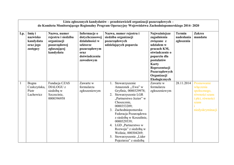 Lista zgłoszonych kandydatów – przedstawicieli organizacji pozarządowych – do Komitetu Monitorującego Regionalny Program Operacyjny Województwa Zachodniopomorskiego 2014- 2020 Lp. Imię i nazwisko kandydata oraz jego zastępcy Nazwa, numer rejestru i siedziba organizacji pozarządowej zgłaszającej kandydata Informacje o dotychczasowej działalności w sektorze pozarządowym oraz doświadczeniu zawodowym 1 Fundacja CZAS DIALOGU z siedzibą w Szczecinie, 0000396958 Zawarte w formularzu zgłoszeniowym Bogna Czałczyńska, Piotr Lachowicz Nazwa, numer rejestru i siedziba organizacji pozarządowych udzielających poparcia 1. Stowarzyszenie Amazonek „:Ewa” w Gryfinie, 0000329978; 2. Stowarzyszenie LGR „Partnerstwo Jezior” w Choszcznie, 0000353209; 3. Zachodniopomorska Federacja Pozarządowa z siedzibą w Koszalinie, 0000529539; 4. LGD „Partnerstwo w Rozwoju” z siedzibą w Wolinie, 000304269; 5. Stowarzyszenie „Lider Pojezierza” z siedzibą Najważniejsze zagadnienia związane z udziałem w pracach KM, oświadczenie o poparciu dla postulatów Karty Reprezentacji Pozarządowych Organizacji Ekologicznych Zawarte w formularzu zgłoszeniowym Termin Zakres nadesłania mandatu zgłoszenia 28.11.2014 Promowanie włączenia społecznego, równości szans i płci, równości szans i niedyskryminacji w Barlinku, 0000252730; 6. Międzynarodowe Forum Kobiet Nauki i Biznesu z siedzibą w Warszawie, 0000015760; 7. Stowarzyszenie Tradycja z siedzibą w Łobzie, 0000292531; 8. Stowarzyszenie LGD „Ziemia Pyrzycka” z siedzibą w Pyrzycach, 0000314236; 9. Zachęta Sztuki Współczesnej z siedzibą w Szczecinie, 0000221618; 10. Koszalińskie Stowarzyszenie Aktywności Lokalnej „Era Kobiet” z siedzibą w Koszalinie, 0000320933; 11. Polska Fundacja Ekologiczna z siedzibą w Szczecinie, 0000432778; 12. Środowiskowe Ognisko Wychowawcze TPD z siedzibą w Policach, 0000133561; 2 Janusz Drosik, Anna Cokan Polskie Stowarzyszenie na Rzecz Osób z Upośledzeniem Umysłowym Koło w Stargardzie Szczecińskim, 0000010531 Zawarte w formularzu zgłoszeniowym 13. Fundacja Bonin z siedzibą w Boninie, 275853; 14. Szczecińska Fundacja „Zdroje” z siedzibą w Szczecinie, 0000418804; 15. Fundacja Kultury i Nauki AXIOMA z siedzibą w Dobrej, 0000432778; 16. Stowarzyszenie Dolnoodrzańska Inicjatywa Rozwoju Obszarów Wiejskich z siedzibą w Gryfinie, 0000318665; 17. Koło Gospodyń wiejskich „Wena” z siedzibą w Gryfinie, 000056125; 18. Stowarzyszenie WIR z siedzibą w Stargardzie Szcz., 0000251321; 1. Stowarzyszenie Amber z siedzibą w Kołobrzegu, 0000265830; 2. Oddział Rejonowy PZERiI w Stargardzie Szcz., 0000109984; 3. Polskie Towarzystwo Zawarte w formularzu zgłoszeniowym 28.11.14 Promowanie włączenia społecznego, równości szans i płci, równości szans i niedyskryminacji 4. 5. 6. 7. 8. 9. Walki z Kalectwem, koło terenowe w Chociwlu, 0000120774; PSOUUU Koło w Kołobrzegu, 0000164182; Stowarzyszenie Aktywność bez Barier” z siedzibą w Gryfinie, 0000229048; Liga Kobiet Polskich, Oddział Terenowy w Stargardzie Szcz., 0000209504; Stowarzyszenie Nauczycieli i Rodziców Dzieci ze Specjalnymi Potrzebami Edukacyjnymi z siedzibą w Stargardzie Szcz., 0000210380; Związek Nauczycielstwa Polskiego Oddziałowa Sekcja Emerytów i Rencistów w Stargardzie Szcz., 0000150507; Stowarzyszenie „Serce Dzieciom” z siedzibą w Stargardzie Szcz., 0000111612; 3 Jacek Drożdżal, Joanna Szczepańska 4 Konrad Frontczak, Katarzyna Witkowska 5 Małgorzata Głowacka, Tomasz Albrecht Stowarzyszenie Zachodniopomorski Klaster Chemiczny „Zielona Chemia” z siedzibą w Szczecinie, 0000288878 Stowarzyszenie Klaster ITC Pomorze Zachodnie z siedzibą w Szczecinie, 0000385020 Fundacja URSUS z siedzibą w Szczecinie, 0000385272 Zawarte w formularzu zgłoszeniowym 10. Oddział Krajowego Towarzystwa Autyzmu w Stargardzie Szcz., 0000130035; 11. Stowarzyszenie Przyjaciół Jedynki z siedzibą w Stargardzie Szcz., 0000329470 Zachodniopomorska Federacja Pozarządowa z siedzibą w Koszalinie, 0000529539 Zawarte w formularzu zgłoszeniowym 27.11.14 RPO WZ 20142012, tj. obszar innowacyjności, B+R Zawarte w formularzu zgłoszeniowym Zachodniopomorska Federacja Pozarządowa z siedzibą w Koszalinie, 0000529539 Zawarte w formularzu zgłoszeniowym 28.11.14 RPO WZ 20142012, tj. obszar innowacyjności, B+R Zawarte w formularzu zgłoszeniowym 1. Gryfiński UTW z siedzibą w Gryfinie, 0000360141; 2. Stowarzyszenie na Rzecz Rozwoju Wsi Radziszewo, Daleszewo, Łubnica … z siedzibą w Radziszewie, 0000370399; 3. Stowarzyszenie Zawarte w formularzu zgłoszeniowym 28.11.14 RPO WZ 20142012, tj. obszar innowacyjności, B+R Dolnoodrzańska Inicjatywa Rozwoju Obszarów Wiejskich z siedzibą w Gryfinie, 0000318665; 4. Stowarzyszenie Kuźnia Inicjatyw Niebanalnych z siedzibą w Mielnie Pyrzyckim, 0000439979; 5. Stowarzyszenie edukacji, promocji i wsparcia aktywności społecznej „Nasza Mała Ojczyzna” z siedzibą w Steklnie, 0000356581; 6. Stowarzyszenie „Kontra” z siedzibą w Baniach, 0000742041; 7. LGD Powiatu Świdwińskiego z siedzibą w Świdwinie, 0000312947; 8. Stowarzyszenie „Lider Pojezierza” z siedzibą w Barlinku, 0000252730; 9. Stowarzyszenie POLITES z siedzibą w Szczecinie, 0000134083; 10. Pracownia 6 Jaśkiewicz Piotr, Sylwia PawłowskaSipak Fundacja Nauka dla Środowiska z siedzibą w Koszalinie, 0000146454 Zawarte w formularzu zgłoszeniowym Pozarządowa z siedzibą w Koszalinie, 000026352; 11. Fundacja Sektor3 z siedzibą w Szczecinie, 0000491200; 12. Towarzystwo miłośników Historii Ziemi Gryfińskiej z siedzibą w Gryfinie, 0000163024 1. Fundacja na Rzecz Zawarte w Wspierania formularzu Absolwentów MOW zgłoszeniowym im. Św. J. Bosko z siedzibą w Czaplinku, 0000472536; 2. Fundacja Archikultura z siedzibą w Koszalinie, 0000497839; 3. Stowarzyszenie Przyjaciół Karwowa z siedzibą w Karwowie, 0000232735; 4. Spółdzielnia Socjalna „Pod miotełką” z siedzibą w Karwowie, 0000503055; 5. Fu