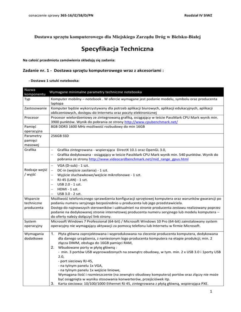 oznaczenie sprawy 365-16/IZ/58/D/PN Rozdział IV SIWZ Dostawa sprzętu komputerowego dla Miejskiego Zarządu Dróg w Bielsku-Białej Specyfikacja Techniczna Na całość przedmiotu zamówienia składają się zadania: Zadanie nr. 1 - Dostawa sprzętu komputerowego wraz z akcesoriami : - Dostawa 1 sztuki notebooka: Nazwa Wymagane minimalne parametry techniczne notebooka komponentu Typ Komputer mobilny – notebook . W ofercie wymagane jest podanie modelu, symbolu oraz producenta laptopa Zastosowanie Komputer będzie wykorzystywany dla potrzeb aplikacji biurowych, aplikacji edukacyjnych, aplikacji obliczeniowych, dostępu do Internetu oraz poczty elektronicznej Procesor Procesor wielordzeniowy ze zintegrowaną grafiką, osiągający w teście PassMark CPU Mark wynik min. 3900 punktów. Wynik do pobrania ze strony http://www.cpubenchmark.net/ Pamięć 8GB DDR3 1600 MHz możliwość rozbudowy do min 16GB operacyjna Parametry 256GB SSD pamięci masowej Grafika Grafika zintegrowana - wspierająca DirectX 10.1 oraz OpenGL 3.0, Grafika dedykowana - osiągający w teście PassMark CPU Mark wynik min. 540 punktów. Wynik do pobrania ze strony http://www.videocardbenchmark.net/mid_range_gpus.html VGA (D-sub) - 1 szt. Rodzaje wejść DC-in (wejście zasilania) - 1 szt. / wyjść Wyjście słuchawkowe/wejście mikrofonowe - 1 szt. RJ-45 (LAN) - 1 szt. USB 2.0 - 1 szt. HDMI - 1 szt. USB 3.0 - 2 szt. Wsparcie Możliwość telefonicznego sprawdzenia konfiguracji sprzętowej komputera oraz warunków gwarancji po techniczne podaniu numeru seryjnego bezpośrednio u producenta lub jego przedstawiciela. producenta Dostęp do najnowszych sterowników i uaktualnień na stronie producenta zestawu realizowany poprzez podanie na dedykowanej stronie internetowej producenta numeru seryjnego lub modelu komputera – do oferty należy dołączyć link strony. System Microsoft Windows 7 Professional (64-bit) / Microsoft Windows 10 Pro (64-bit) zainstalowany system operacyjny operacyjny nie wymagający aktywacji za pomocą telefonu lub Internetu w firmie Microsoft. Wymagania dodatkowe 1. Płyta główna zaprojektowana i wyprodukowana na zlecenie producenta komputera, dedykowana dla danego urządzenia, z naniesionym logo producenta komputera na etapie produkcji; min. 2 złącza DIMM, obsługa do 16GB pamięci RAM, 2. Wbudowane porty w płytę główną : - min. 3 portów USB wyprowadzonych na zewnątrz obudowy, w tym. min. 2 x USB 3.0 i 1porty USB 2.0, - port sieciowy RJ-45, - na tylnym panelu 1x VGA, - na tylnym panelu 1x wejście liniowe, Wymagana ilość i rozmieszczenie (na zewnątrz obudowy komputera) portów oraz złączy nie może być osiągnięta w wyniku stosowania konwerterów, przejściówek itp. 3. Karta sieciowa: 10/100/1000 Ethernet RJ 45, zintegrowana z płytą główną, wspierająca PXE. 1 oznaczenie sprawy 365-16/IZ/58/D/PN Matryca 4. Bezprzewodowa karta sieciowa : IEEE 802.11a/b/g/n/ac 5. Nagrywarka typu : SLIM DVD +/-RW. 6. Bateria: minimalnie 4-komorowa, 2200 mAh, Li-Ion Przekątna ekranu LCD : od 15 cali do 16 cali Typ ekranu : LED anti-glare Minimalna rozdzielczość LCD: 1366 x 768 (HD) Warunki gwarancji Trzy lata gwarancji producenta realizowanej w miejscu instalacji sprzętu, Wyposażenie dodatkowe 1. Bez przewodowa mysz posiadająca niżej wypisane parametry: typ łączności: bez przewodowy Standardowy rozmiar dedykowane zastosowanie: Laptop, Desktop technologia czujnika: Laserowa rozdzielczość czujnika co najmniej : 1000 dpi Posiadany Certyfikat ISO9001 lub równoważny Posiadana Deklaracja zgodności CE lub równoważna Posiadany certyfikat/poświadczenie producenta Energy Star min. 5.0 Wymagania dodatkowe Rozdział IV SIWZ - Dostawa 1 sztuki notebooka 2 w 1: Nazwa Wymagane minimalne parametry techniczne notebooka komponentu Typ Komputer mobilny – konwertowalny notebook 2w1. W ofercie wymagane jest podanie modelu, symbolu oraz producenta laptopa Zastosowanie Komputer będzie wykorzystywany dla potrzeb aplikacji biurowych, aplikacji edukacyjnych, aplikacji obliczeniowych, dostępu do Internetu oraz poczty elektronicznej Procesor Procesor wielordzeniowy ze zintegrowaną grafiką, osiągający w teście PassMark CPU Mark wynik min. 4300 punktów. Wynik do pobrania ze strony http://www.cpubenchmark.net/ Pamięć 8GB DDR3 1866 MHz możliwość rozbudowy do min 16GB operacyjna Parametry 512 GB SSD M.2 pamięci masowej Grafika Grafika zintegrowana - wspierająca DirectX 10.1 oraz OpenGL 3.0, Mini DispalyPort - 1 szt. Rodzaje wejść DC-in (wejście zasilania) - 1 szt. / wyjść Wejście portu stacji dokującej Wyjście słuchawkowe/wejście mikrofonowe - 1 szt. USB 3.0 - minimum 2 szt. HDMI - 1 szt. USB 3.0 Power Share – minimum 1 szt. Wsparcie Możliwość telefonicznego sprawdzenia konfiguracji sprzętowej komputera oraz warunków gwarancji po techniczne podaniu numeru seryjnego bezpośrednio u producenta lub jego przedstawiciela. producenta Dostęp do najnowszych sterowników i uaktualnień na stronie producenta zestawu realizowany poprzez podanie na dedykowanej stronie internetowej producenta numeru seryjnego lub modelu komputera – do oferty należy dołączyć link strony. System Microsoft Windows 7 Professional (64-bit) / Microsoft Windows 10 Pro (64-bit) zainstalowany system operacyjny operacyjny nie wymagający aktywacji za pomocą telefonu lub Internetu w firmie Microsoft. Wymagania Wbudowane porty w płytę główną : dodatkowe min. 3 portów USB wyprowadzonych na zewnątrz obudowy, w tym. min. 3 x USB 3.0 na tylnym panelu 1x wejście liniowe, Wymagana ilość i rozmieszczenie (na zewnątrz obudowy komputera) portów oraz złączy nie może być osiągnięta w wyniku stosowania konwerterów, przejściówek itp. Bezprzewodowa karta sieciowa : IEEE 802.11a/b/g/n/ac 2 oznaczenie sprawy 365-16/IZ/58/D/PN Matryca Warunki gwarancji Wyposażenie dodatkowe Wymagania dodatkowe Rozdział IV SIWZ Bateria: minimalnie 4-komorowa, Obudowa zapewnia cztery elastyczne sposoby użytkowania. Prze