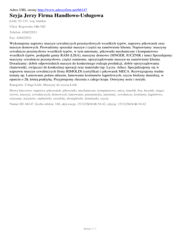 Adres URL strony http://www.adresyfirm.net/66147 Szyja Jerzy Firma Handlowo-Usługowa Łódź, 93-153, woj. łódzkie Ulica: Rzgowska 100 /102 Telefon: 426822921 Fax: 426822921 Wykonujemy naprawy maszyn szwalniczych przemysłowych wszelkich typów, naprawy pikowarek oraz maszyn domowych. Prowadzimy sprzedaż maszyn i części na zamówienie klienta. Naprawiamy: maszyny szwalnicze przemysłowe wszelkich typów, w tym automaty, pikowarki mechaniczne i komputerowe wszelkich typów, podajniki gumy RAM (LISA), maszyny domowe (SINGER, łUCZNIK i inne) Sprzedajemy: maszyny szwalnicze przemysłowe, części zamienne, oprzyrządowanie maszyn na zamówienie klienta. Doradzamy: dobór odpowiednich maszyn do konkretnego rodzaju produkcji, dobór oprzyrządowania (lamowniki, zwijacze) do konkretnej operacji oraz materiału (np. Lycra. Atłas). Specjalizujemy się w naprawie maszyn szwalniczych firmy RIMOLDI (certyfikat) i pikowarek MECA. Rozwiązujemy trudne tematy np. Lamowanie polaru atłasem, lamowanie kostiumów kąpielowych, szycie bielizny damskiej, w oparciu o 20, letnią praktykę. Przyjmujemy zlecenia z całego kraju. Ostrzymy noże i nożyki. Kategorie: Usługi Łódź, Maszyny do szycia Łódź Słowa kluczowe: naprawa, pikowarek, pikowarki, mechaniczne, komputerowe, mica, rimoldi, lisa, łucznik, singer, serwis, maszyn, szwalniczych, domowych, lamowanie, pneumatyka, automaty, szwalnicze, kostiumy, kąpielowe, ostrzenie, nożyków, stębnówki, owerloki, dwuigłówki, dziurkarki, szycie Numer ID: 66147, liczba odsłon: 168, aktywacja: 15/12/2010 06:54:42, edycja: 15/12/2010 06:54:42 Strona 1 / 1