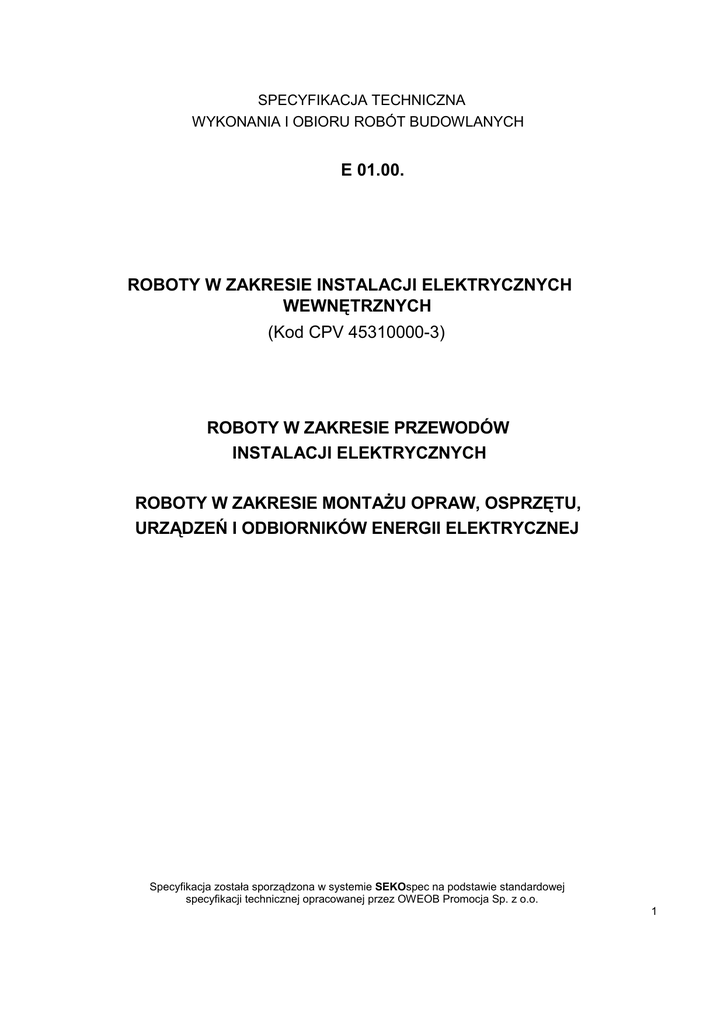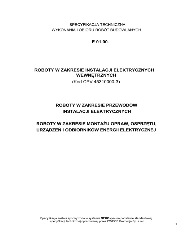 SPECYFIKACJA TECHNICZNA WYKONANIA I OBIORU ROBÓT BUDOWLANYCH E 01.00. ROBOTY W ZAKRESIE INSTALACJI ELEKTRYCZNYCH WEWNĘTRZNYCH (Kod CPV 45310000-3) ROBOTY W ZAKRESIE PRZEWODÓW INSTALACJI ELEKTRYCZNYCH ROBOTY W ZAKRESIE MONTAŻU OPRAW, OSPRZĘTU, URZĄDZEŃ I ODBIORNIKÓW ENERGII ELEKTRYCZNEJ Specyfikacja została sporządzona w systemie SEKOspec na podstawie standardowej specyfikacji technicznej opracowanej przez OWEOB Promocja Sp. z o.o. 1 SPIS TREŚCI 1. CZĘŚĆ OGÓLNA 1.1 .Nazwa nadana zamówieniu przez zamawiającego 1.2. Przedmiot ST 1.3.Zakres stosowania ST 1.4. Przedmiot i zakres robót objętych ST 1.5.Określenia podstawowe, definicje 1.6.Ogólne wymagania dotyczące robót 1.7. Dokumentacja robót montażowych 2. WYMAGANIA DOTYCZĄCE WŁAŚCIWOŚCI MATERIAŁÓW 3. WYMAGANIA DOTYCZĄCE SPRZĘTU, MASZYN I NARZĘDZI 4. WYMAGANIA DOTYCZĄCE TRANSPORTU 5. WYMAGANIA DOTYCZĄCE WYKONANIA ROBÓT 6. KONTROLA JAKOŚCI ROBÓT 7. WYMAGANIA DOTYCZĄCE PRZEDMIARU I OBMIARU ROBÓT 8. ODBIÓR ROBÓT 9. PODSTAWA ROZLICZENIA ROBÓT 10. DOKUMENTY ODNIESIENIA Najważniejsze oznaczenia i skróty: ST - Specyfikacja Techniczna SST - Szczegółowa Specyfikacja Techniczna ITB - Instytut Techniki Budowlanej PZJ - Program Zabezpieczenia Jakości Specyfikacja została sporządzona w systemie SEKOspec na podstawie standardowej specyfikacji technicznej opracowanej przez OWEOB Promocja Sp. z o.o. 2 1. CZĘŚĆ OGÓLNA 1.1. Przedmiot ST Przedmiotem niniejszej specyfikacji technicznej (ST) są wymagania dotyczące wykonania i odbioru robót związanych z układaniem i montażem elementów instalacji elektrycznej (układanie kabli i przewodów, montaż osprzętu i opraw) w obiektach kubaturowych oraz obiektach budownictwa inżynieryjnego. Specyfikacja nie obejmuje robót elektrycznych niskoprądowych. 1.2.Zakres stosowania ST Specyfikacja techniczna standardowa (ST) stanowi podstawę opracowania specyfikacji technicznej szczegółowej (SST), stosowanej jako dokument przetargowy i kontraktowy przy zlecaniu i realizacji robót wymienionych w pkt. 1.1. Odstępstwa od wymagań podanych w niniejszej specyfikacji mogą mieć miejsce tylko w przypadkach prostych robót o niewielkim znaczeniu, dla których istnieje pewność, że podstawowe wymagania będą spełnione przy zastosowaniu metod wykonania wynikających z doświadczenia oraz uznanych reguł i zasad sztuki budowlanej. 1.3. Przedmiot i zakres robót objętych ST Ustalenia zawarte w niniejszej specyfikacji technicznej (ST) dotyczą zasad wykonywania i odbioru robót związanych z: - układaniem kabli i przewodów elektrycznych montowanych poza rozdzielnicami, - montażem opraw, osprzętu, urządzeń i odbiorników energii elektrycznej, wraz z przygotowaniem podłoża i robotami towarzyszącymi, dla obiektów kubaturowych oraz obiektów budownictwa inżynieryjnego. ST dotyczy wszystkich czynności mających na celu wykonanie robót związanych z: - kompletacją wszystkich materiałów potrzebnych do wykonania podanych wyżej prac, - wykonaniem wszelkich robót pomocniczych w celu przygotowania podłoża (w szczególności roboty murarskie, ślusarsko-spawalnicze montaż elementów osprzętu instalacyjnego itp.), - ułożeniem wszystkich materiałów w sposób i w miejscu zgodnym z dokumentacją techniczną - wykonaniem oznakowania zgodnego z przepisami i normami wszystkich elementów wyznaczonych w dokumentacji, - wykonaniem oznakowania zgodnego z przepisami i normami wszystkich kabli i przewodów, - przeprowadzeniem wymaganych prób i badań oraz potwierdzenie protokołami kwalifikującymi montowany element instalacji elektrycznej. 1.4.Określenia podstawowe, definicje Określenia podane w niniejszej specyfikacji technicznej (ST) są zgodne z odpowiednimi normami oraz określeniami podanymi w ST „Wymagania ogólne” Kod CPV 45000000-7, pkt 1.4. a także podanymi poniżej: Specyfikacja techniczna - dokument zawierający zespół cech wymaganych dla procesu wytwarzania lub dla samego wyrobu, w zakresie parametrów technicznych, Specyfikacja została sporządzona w systemie SEKOspec na podstawie standardowej specyfikacji technicznej opracowanej przez OWEOB Promocja Sp. z o.o. 3 jakości, wymogów bezpieczeństwa, wielkości charakterystycznych a także co do nazewnictwa, symboliki, znaków i sposobów oznaczania, metod badań i prób oraz odbiorów i rozliczeń. Aprobata techniczna - dokument stwierdzający przydatność danego wyrobu do określonego obszaru zastosowania. Zawiera ustalenia techniczne co do wymagań podstawowych wyrobu oraz metodykę badań dla potwierdzenia tych wymagań. Deklaracja zgodności - dokument w formie oświadczenia wydany przez producenta, stwierdzający zgodność z kryteriami określonymi odpowiednimi aktami prawnymi, normami, przepisami, wymogami lub specyfikacją techniczną dla danego materiału lub wyrobu. Certyfikat zgodności - dokument wydany przez upoważnioną jednostkę badającą (certyfikującą), stwierdzający zgodność z kryteriami określonymi odpowiednimi aktami prawnymi, normami, przepisami, wymogami lub specyfikacją techniczną dla badanego materiału lub wyrobu. Część czynna - przewód lub inny element przewodzący, wchodzący w skład instalacji elektrycznej lub urządzenia, który w warunkach normalnej pracy instalacji elektrycznej może być pod napięciem a nie spełnia funkcji przewodu ochronnego (przewody ochronne PE i PEN nie są częścią czynną). Połączenia wyrównawcze - elektryczne połączenie części przewodzących dostępnych lub obcych w celu wyrównania potencjału. Kable i przewody - materiały służące do dostarczania energii elektrycznej, sygnałów, impulsów elektrycznych w wybrane miejsce. Osprzęt instalacyjny do kabli i przewodów - zespół materiałów dodatkowych, stosowanych przy układaniu przewodów, ułatwiający ich montaż oraz dotarcie w przypadku awarii, zabezpieczający przed uszkodzeniami, wytyczający trasy ciągów równoległych przewodów itp. Grupy mate