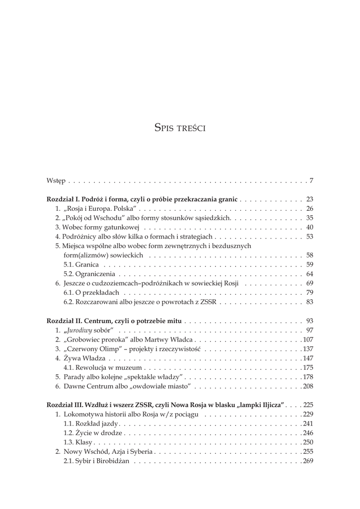 Spis treści Wstęp . . . . . . . . . . . . . . . . . . . . . . . . . . . . . . . . . . . . . . . . . . . . . . . . 7 Rozdział I. Podróż i forma, czyli o próbie przekraczania granic . . . . . . . . . . . . . . 1. „Rosja i Europa. Polska” . . . . . . . . . . . . . . . . . . . . . . . . . . . . . . . . . . 2. „Pokój od Wschodu” albo formy stosunków sąsiedzkich . . . . . . . . . . . . . . . 3. Wobec formy gatunkowej . . . . . . . . . . . . . . . . . . . . . . . . . . . . . . . . . 4. Podróżnicy albo słów kilka o formach i strategiach . . . . . . . . . . . . . . . . . . . 5. Miejsca wspólne albo wobec form zewnętrznych i bezdusznych form(alizmów) sowieckich . . . . . . . . . . . . . . . . . . . . . . . . . . . . . . . . 5.1. Granica . . . . . . . . . . . . . . . . . . . . . . . . . . . . . . . . . . . . . . . . . 5.2. Ograniczenia . . . . . . . . . . . . . . . . . . . . . . . . . . . . . . . . . . . . . . 6. Jeszcze o cudzoziemcach–podróżnikach w sowieckiej Rosji . . . . . . . . . . . . . 6.1. O przekładach . . . . . . . . . . . . . . . . . . . . . . . . . . . . . . . . . . . . . 6.2. Rozczarowani albo jeszcze o powrotach z ZSSR . . . . . . . . . . . . . . . . . 23 26 35 40 53 58 59 64 69 79 83 Rozdział II. Centrum, czyli o potrzebie mitu . . . . . . . . . . . . . . . . . . . . . . . . . 93 1. „Jurodiwy sobór” . . . . . . . . . . . . . . . . . . . . . . . . . . . . . . . . . . . . . . 97 2. „Grobowiec proroka” albo Martwy Władca . . . . . . . . . . . . . . . . . . . . . 107 3. „Czerwony Olimp” – projekty i rzeczywistość . . . . . . . . . . . . . . . . . . . . 137 4. Żywa Władza . . . . . . . . . . . . . . . . . . . . . . . . . . . . . . . . . . . . . . . 147 4.1. Rewolucja w muzeum . . . . . . . . . . . . . . . . . . . . . . . . . . . . . . . . 175 5. Parady albo kolejne „spektakle władzy” . . . . . . . . . . . . . . . . . . . . . . . 178 6. Dawne Centrum albo „owdowiałe miasto” . . . . . . . . . . . . . . . . . . . . . . 208 Rozdział III. Wzdłuż i wszerz ZSSR, czyli Nowa Rosja w blasku „lampki Iljicza” . . . . 225 1. Lokomotywa historii albo Rosja w/z pociągu . . . . . . . . . . . . . . . . . . . . 229 1.1. Rozkład jazdy . . . . . . . . . . . . . . . . . . . . . . . . . . . . . . . . . . . . 241 1.2. Życie w drodze . . . . . . . . . . . . . . . . . . . . . . . . . . . . . . . . . . . . 246 1.3. Klasy . . . . . . . . . . . . . . . . . . . . . . . . . . . . . . . . . . . . . . . . . 250 2. Nowy Wschód, Azja i Syberia . . . . . . . . . . . . . . . . . . . . . . . . . . . . . 255 2.1. Sybir i Birobidżan . . . . . . . . . . . . . . . . . . . . . . . . . . . . . . . . . . 269 6 Spis treści 3. Magnitogorsk albo Rossija na strojkie . . . . . . . . . . . . . . . . . . . . . . . . . . 274 3.1. Wielkie budowy . . . . . . . . . . . . . . . . . . . . . . . . . . . . . . . . . . . 277 3.2. Rab – raboczyj . . . . . . . . . . . . . . . . . . . . . . . . . . . . . . . . . . . . 299 3.3. Czeluskin – sowieckich spektakli ciąg dalszy . . . . . . . . . . . . . . . . . . 309 Rozdział IV. Teatr codzienności, czyli licom k czełowieku . . . . . . . . . . . . . . . . 313 1. „Nowy człowiek”– „stary człowiek” – szary człowiek . . . . . . . . . . . . . . . . 318 1.1. „Świat ludzi twardych” . . . . . . . . . . . . . . . . . . . . . . . . . . . . . . 320 1.2. Świat ludzi zahipnotyzowanych . . . . . . . . . . . . . . . . . . . . . . . . . . 326 1.3. Świat ludzi młodych . . . . . . . . . . . . . . . . . . . . . . . . . . . . . . . . . 331 1.4. Tłum ludzi szarych . . . . . . . . . . . . . . . . . . . . . . . . . . . . . . . . . 339 1.5. Kulisy pięciolatek . . . . . . . . . . . . . . . . . . . . . . . . . . . . . . . . . . 349 1.6. „Rozkosze kultury” a zwykłe życie . . . . . . . . . . . . . . . . . . . . . . . . 355 1.7. Nowe czy stare? . . . . . . . . . . . . . . . . . . . . . . . . . . . . . . . . . . . 362 2. Panem et circenses . . . . . . . . . . . . . . . . . . . . . . . . . . . . . . . . . . . . . 371 2.1. W życiu i w teatrze . . . . . . . . . . . . . . . . . . . . . . . . . . . . . . . . . 373 2.2. Sowiecki homo ludens . . . . . . . . . . . . . . . . . . . . . . . . . . . . . . . . 378 2.3. „Na śmiech za wcześnie”? . . . . . . . . . . . . . . . . . . . . . . . . . . . . . 384 2.4. Tańce . . . . . . . . . . . . . . . . . . . . . . . . . . . . . . . . . . . . . . . . . 386 3. Na froncie życia intymnego, rodzinnego oraz domowego . . . . . . . . . . . . . 390 3.1. „Nowa moralność” . . . . . . . . . . . . . . . . . . . . . . . . . . . . . . . . . 391 3.2. „Kobieta i nowy byt” . . . . . . . . . . . . . . . . . . . . . . . . . . . . . . . . 398 3.3. „Państwo burżuazyjne bez burżuazji” . . . . . . . . . . . . . . . . . . . . . . 408 3.4. Przestrzeń „prywatna” . . . . . . . . . . . . . . . . . . . . . . . . . . . . . . . 414 Zakończenie . . . . . . . . . . . . . . . . . . . . . . . . . . . . . . . . . . . . . . . . . . . 425 Aneks – podróżnicy . . . . . . . . . . . . . . . . . . . . . . . . . . . . . . . . . . . . . . . 431 1. Pionierzy . . . . . . . . . . . . . . . . . . . . . . . . . . . . . . . . . . . . . . . . . 431 2. Lata trzydzieste . . . . . . . . . . . . . . . . . . . . . . . . . . . . . . . . . . . . . . 435 2.1. Contra lub pro . . . . . . . . . . . . . . . . . . . . . . . . . . . . . . . . . . . . . 435 2.2. In minus lub in plus . . . . . . . . . . . . . . . . . . . . . . . . . . . . . . . . . . 439 2.3. Tak czy nie? . . . . . . . . . . . . . . . . . . . . . . . . . . . . . . . . . . . . . 451 2.4. Moment narodowy . . . . . . . . . . . . . . . . . . . . . . . . . . . . . . . . . 455 2.5. W oczach kobiet . . . . . . . . . . . . . . . . . . . . . . . . . . . . . . . . . . . 457 2.6. Korespondent . . . . . . . . . . . . . . . . . . . . . . . . . . . . . . . . . . . . 460 Bibliografia . . . . . . . . . . . . . . . . . . . . . . . . . . . . . . . . . . . . . . . . . . . . 463