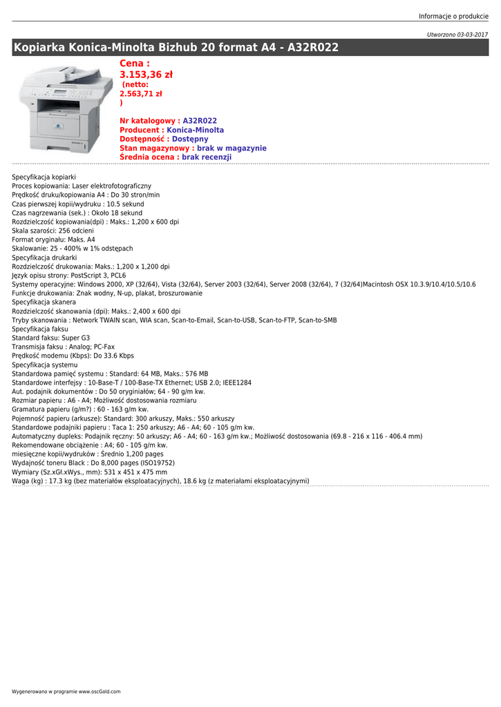 Informacje o produkcie Utworzono 03-03-2017 Kopiarka Konica-Minolta Bizhub 20 format A4 - A32R022 Cena : 3.153,36 zł (netto: 2.563,71 zł ) Nr katalogowy : A32R022 Producent : Konica-Minolta Dostępność : Dostępny Stan magazynowy : brak w magazynie Średnia ocena : brak recenzji Specyfikacja kopiarki Proces kopiowania: Laser elektrofotograficzny Prędkość druku/kopiowania A4 : Do 30 stron/min Czas pierwszej kopii/wydruku : 10.5 sekund Czas nagrzewania (sek.) : Około 18 sekund Rozdzielczość kopiowania(dpi) : Maks.: 1,200 x 600 dpi Skala szarości: 256 odcieni Format oryginału: Maks. A4 Skalowanie: 25 - 400% w 1% odstępach Specyfikacja drukarki Rozdzielczość drukowania: Maks.: 1,200 x 1,200 dpi Język opisu strony: PostScript 3, PCL6 Systemy operacyjne: Windows 2000, XP (32/64), Vista (32/64), Server 2003 (32/64), Server 2008 (32/64), 7 (32/64)Macintosh OSX 10.3.9/10.4/10.5/10.6 Funkcje drukowania: Znak wodny, N-up, plakat, broszurowanie Specyfikacja skanera Rozdzielczość skanowania (dpi): Maks.: 2,400 x 600 dpi Tryby skanowania : Network TWAIN scan, WIA scan, Scan-to-Email, Scan-to-USB, Scan-to-FTP, Scan-to-SMB Specyfikacja faksu Standard faksu: Super G3 Transmisja faksu : Analog; PC-Fax Prędkość modemu (Kbps): Do 33.6 Kbps Specyfikacja systemu Standardowa pamięć systemu : Standard: 64 MB, Maks.: 576 MB Standardowe interfejsy : 10-Base-T / 100-Base-TX Ethernet; USB 2.0; IEEE1284 Aut. podajnik dokumentów : Do 50 oryginiałów; 64 - 90 g/m kw. Rozmiar papieru : A6 - A4; Możliwość dostosowania rozmiaru Gramatura papieru (g/m?) : 60 - 163 g/m kw. Pojemność papieru (arkusze): Standard: 300 arkuszy, Maks.: 550 arkuszy Standardowe podajniki papieru : Taca 1: 250 arkuszy; A6 - A4; 60 - 105 g/m kw. Automatyczny dupleks: Podajnik ręczny: 50 arkuszy; A6 - A4; 60 - 163 g/m kw.; Możliwość dostosowania (69.8 - 216 x 116 - 406.4 mm) Rekomendowane obciążenie : A4; 60 - 105 g/m kw. miesięczne kopii/wydruków : Średnio 1,200 pages Wydajność toneru Black : Do 8,000 pages (ISO19752) Wymiary (Sz.xGł.xWys., mm): 531 x 451 x 475 mm Waga (kg) : 17.3 kg (bez materiałów eksploatacyjnych), 18.6 kg (z materiałami eksploatacyjnymi) Wygenerowano w programie www.oscGold.com